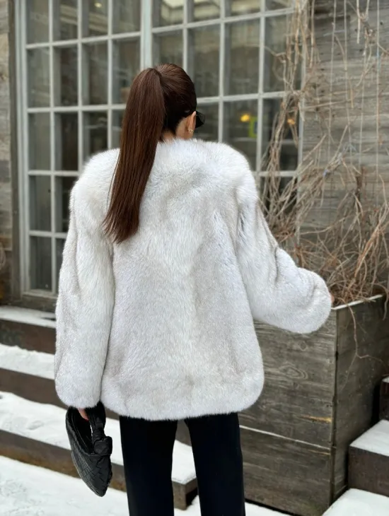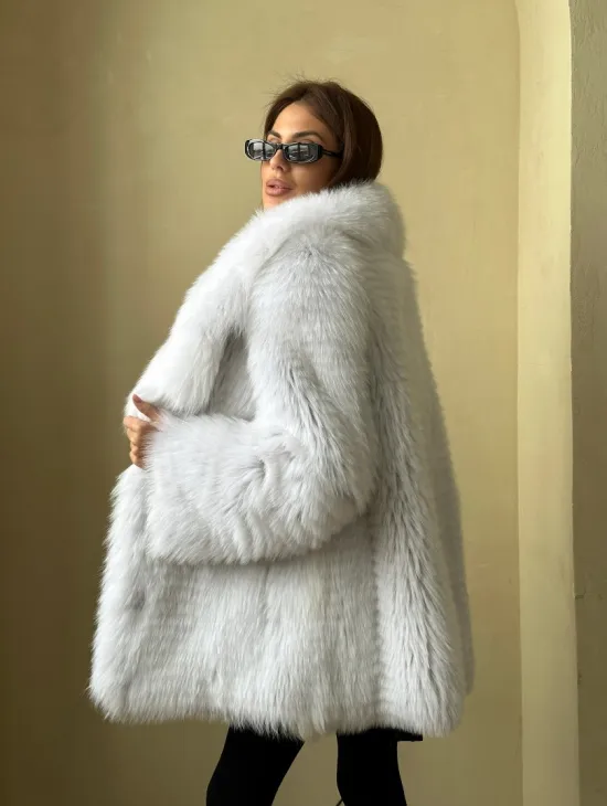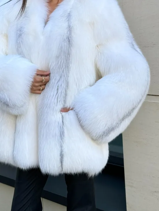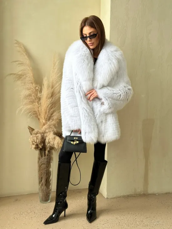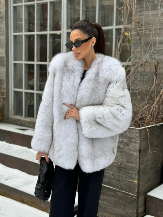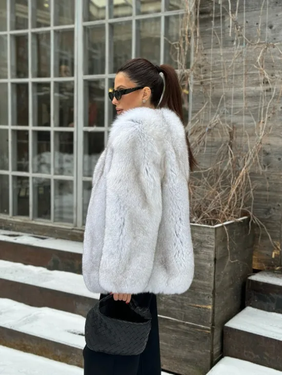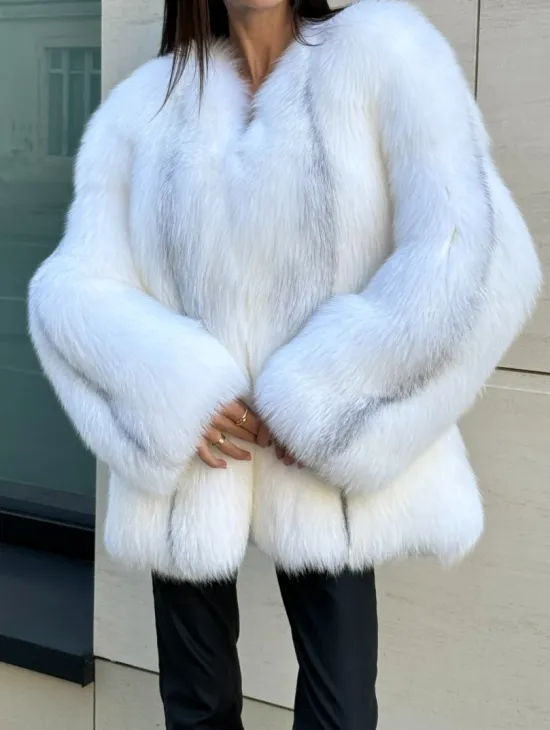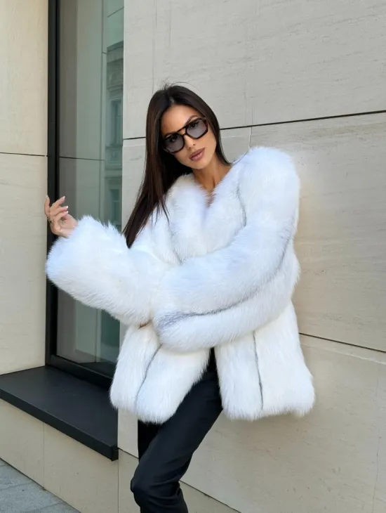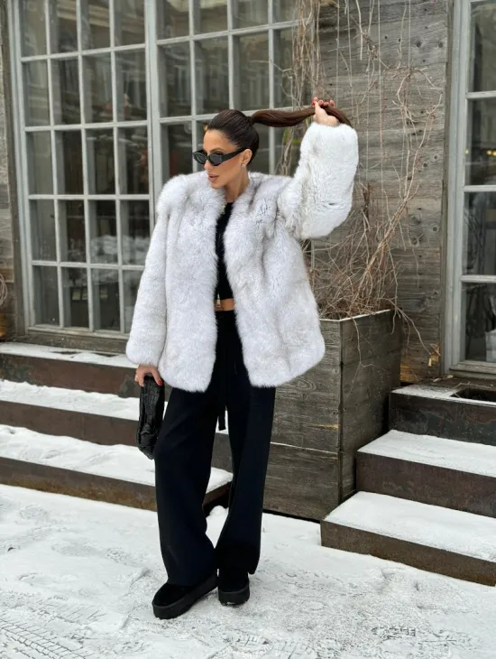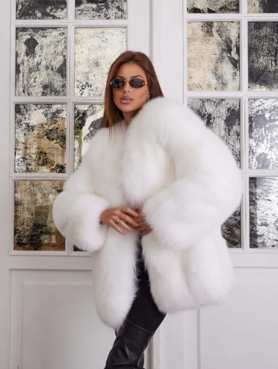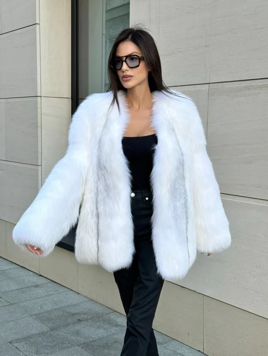 Мех данной шубы лиса, цвет белый. Предлагается в размерах от 40 до 50. Длина модели 70-75 см, что выгодно подчеркивает фигуру девушек. Эта модель идеально подойдет для девушек и женщин, предпочитающих роскошные натуральные меха.