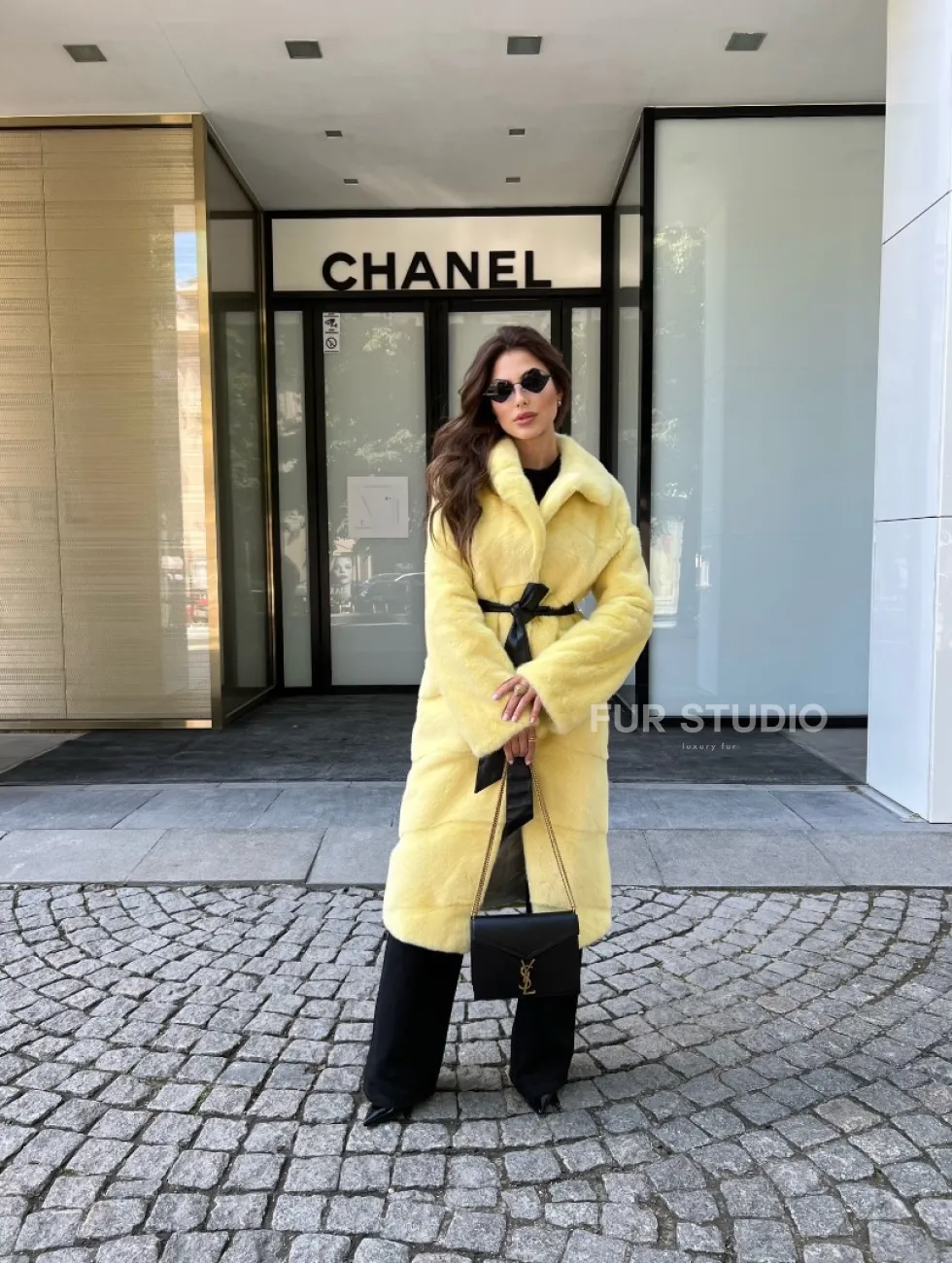 Изделие прекрасно сочетается с классическим стилем одежды, подойдет под вечерний наряд. В любом образе вы будете выглядеть бесподобно. Необычный пояс выгодно подчеркнет все прелести фигуры и создаст силуэт песочных часов. В такой верхней одежде будете выглядеть свежо и женственно. При этом оттенок прекрасно сочетается с любым цветом волос и кожи. Купить шубу из меха аукционной норки в желтом цвете могут девушки, которые любят выглядеть необычно и со вкусом.