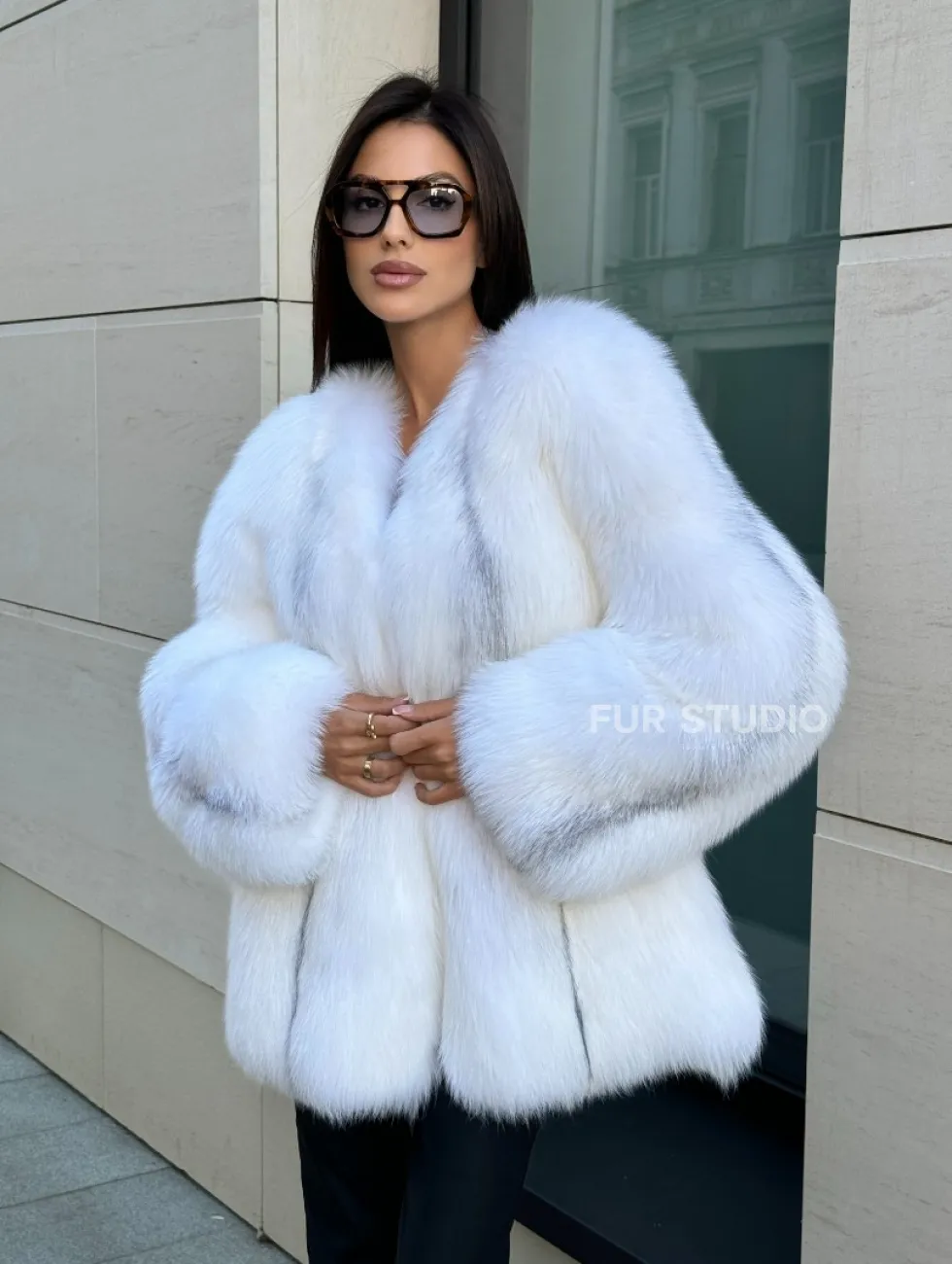 Мех данной шубы лиса, цвет белый. Предлагается в размерах от 42 до 50. Длина модели 65-70 см, что выгодно подчеркивает фигуру девушек. Эта модель идеально подойдет для девушек и женщин, предпочитающих роскошные натуральные меха.