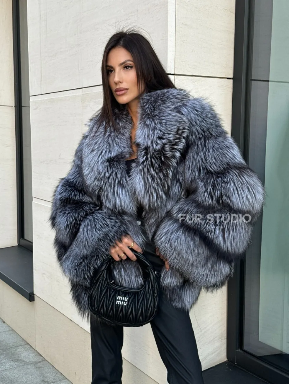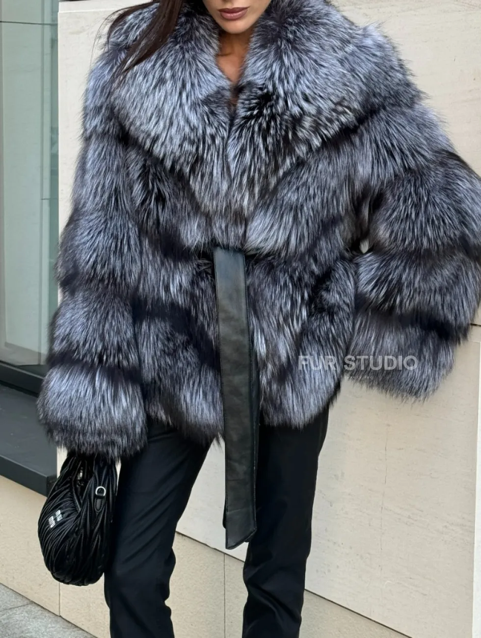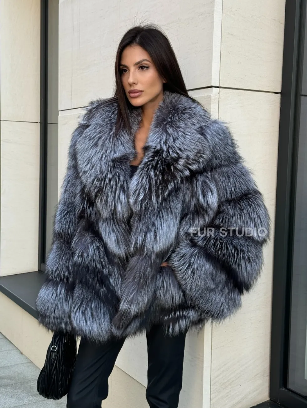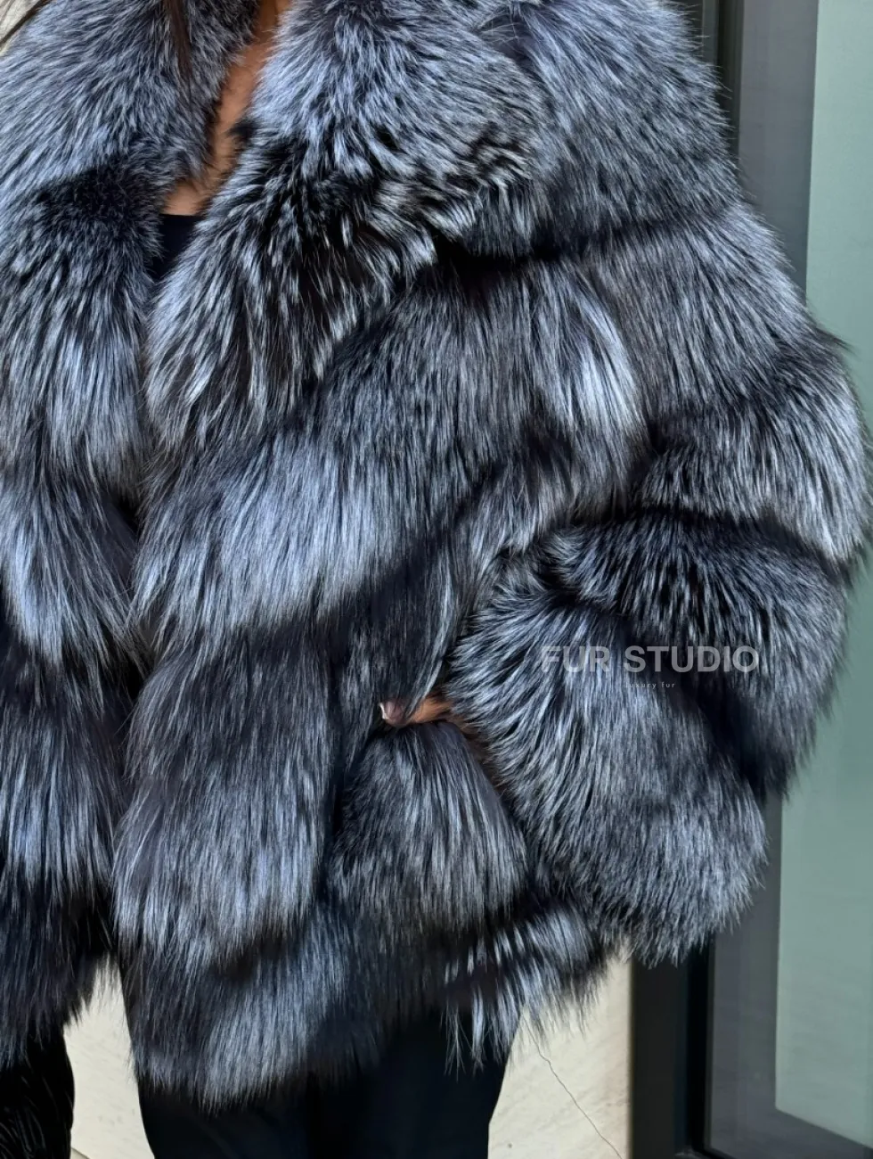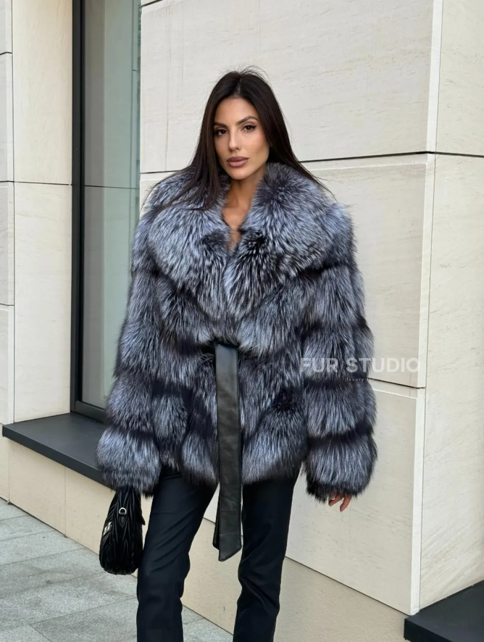 Мех данной шубы лиса, цвет серый. Предлагается в размерах от 42 до 50. Длина модели 65-70 см, что выгодно подчеркивает фигуру девушек. Эта модель идеально подойдет для девушек и женщин, предпочитающих роскошные натуральные меха.