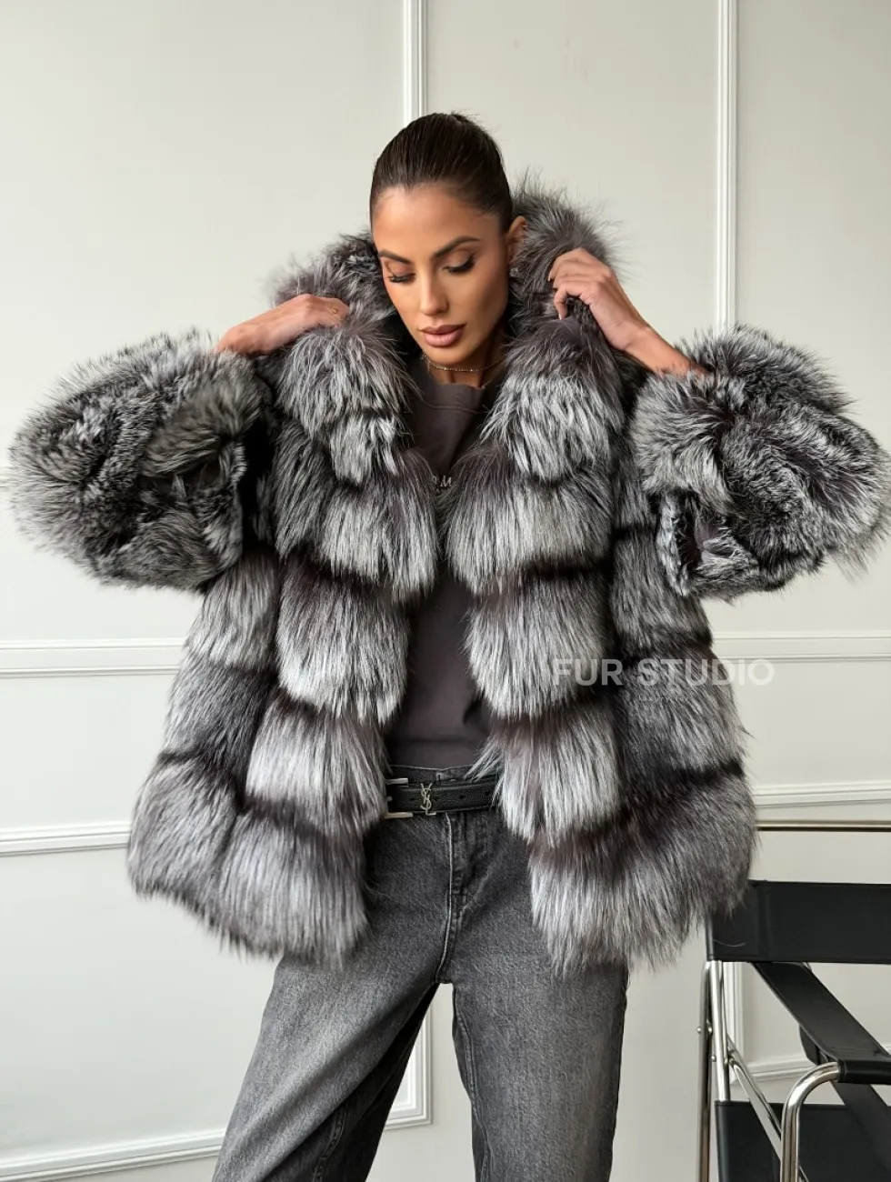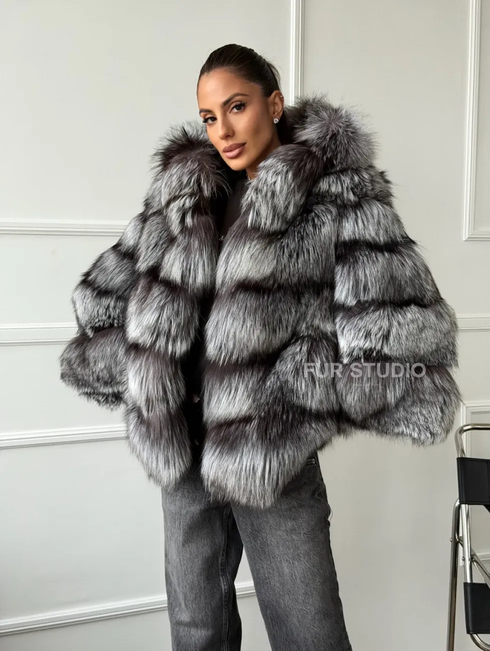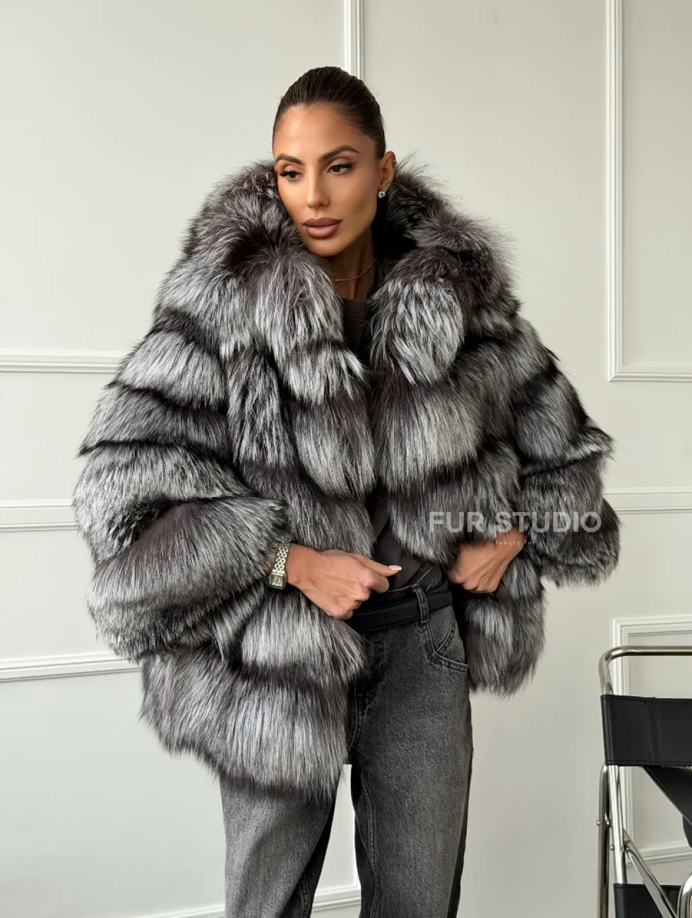 Мех данной шубы лиса, цвет серый. Предлагается в размерах от 42 до 48. Длина модели 60-65 см, что выгодно подчеркивает фигуру девушек. Эта модель идеально подойдет для девушек и женщин, предпочитающих роскошные натуральные меха.