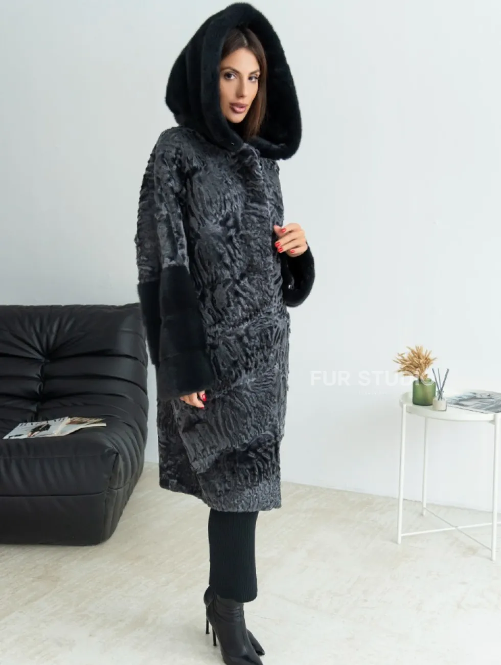 Шуба из каракульчи с отделкой из меха норки с капюшоном, цвет графит – выбор истинных модниц любого возраста. Модель изыскана, сочетает в себе роскошь и стиль. Уникальная комбинация меха делает look необычным и женственным. Роскошный капюшон позаботится о прическе и не даст замерзнуть голове в непогоду. Теплый мех изделия согреет владелицу в прохладное время года.