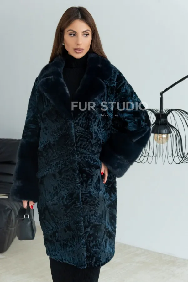 Шуба из каракульчи с английским воротником норки - цвет темно-синий 100188