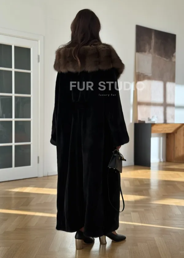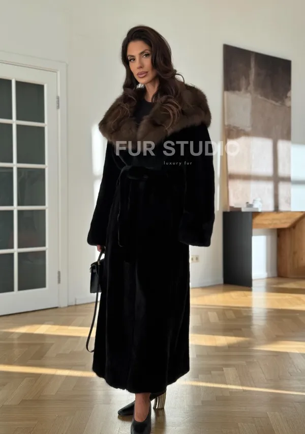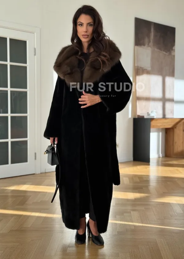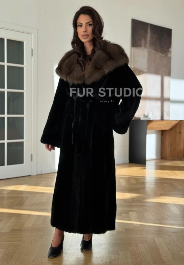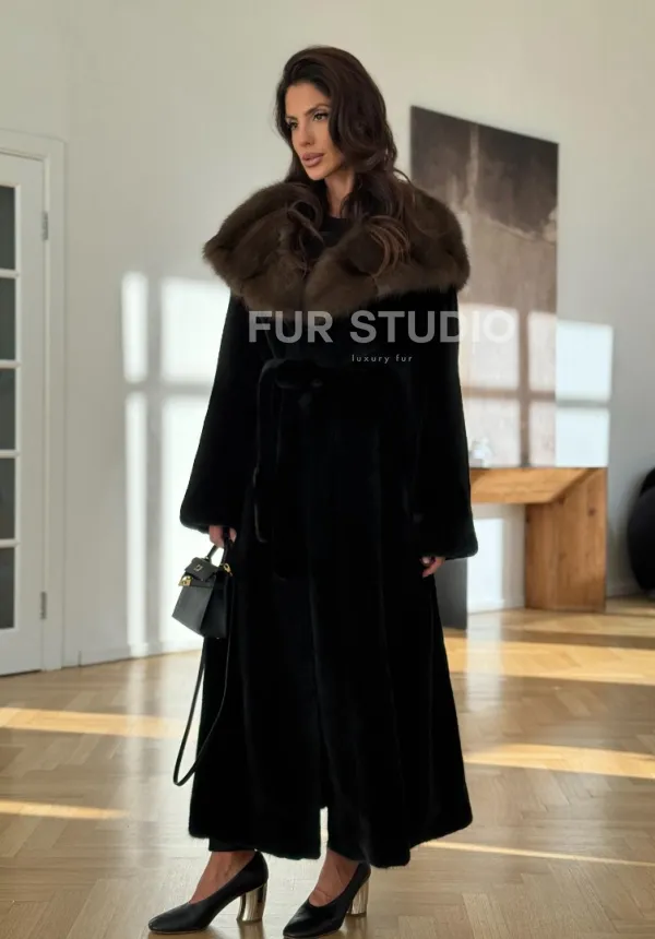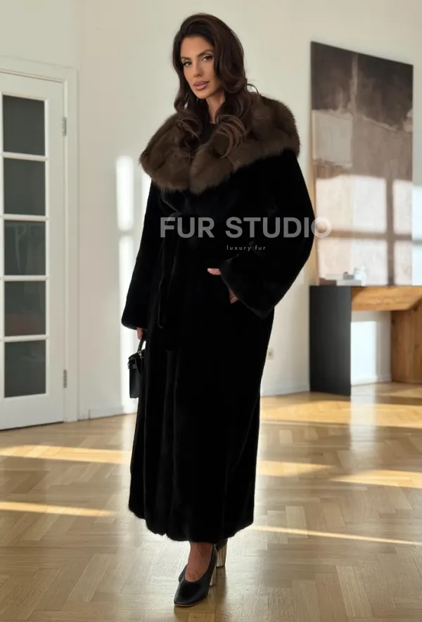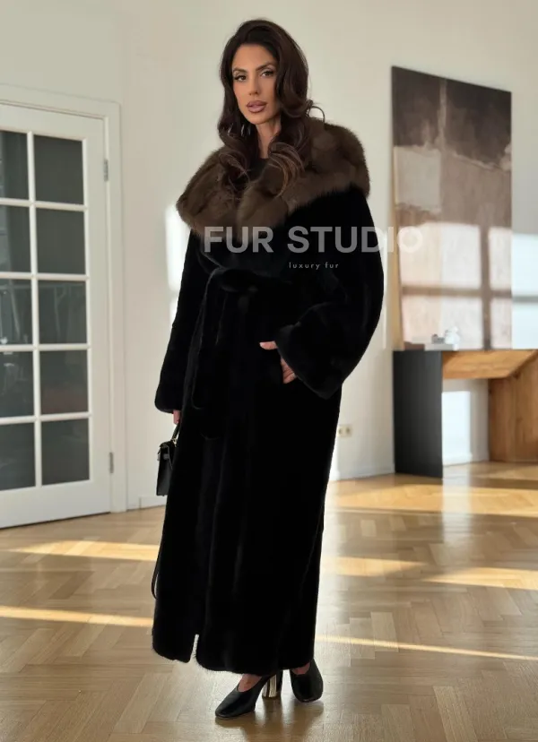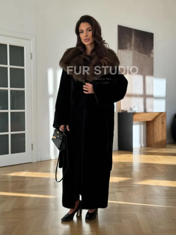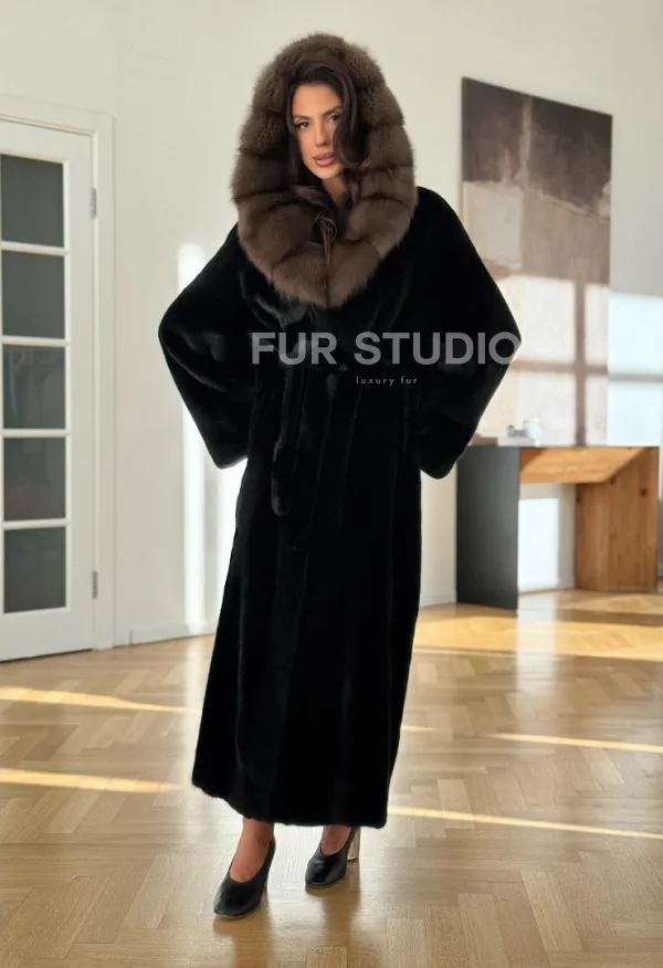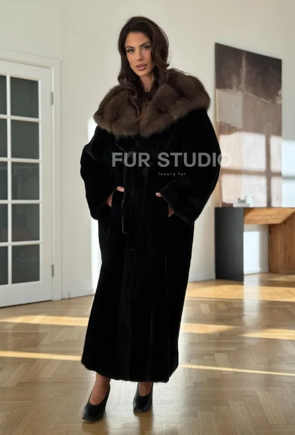 Мех данной шубы аукционная норка, цвет черный. Предлагается в размерах от 42 до 52 (oversize). Длина модели 125-130 см, что выгодно подчеркивает фигуру девушек. Эта модель идеально подойдет для девушек и женщин, предпочитающих роскошные натуральные меха.