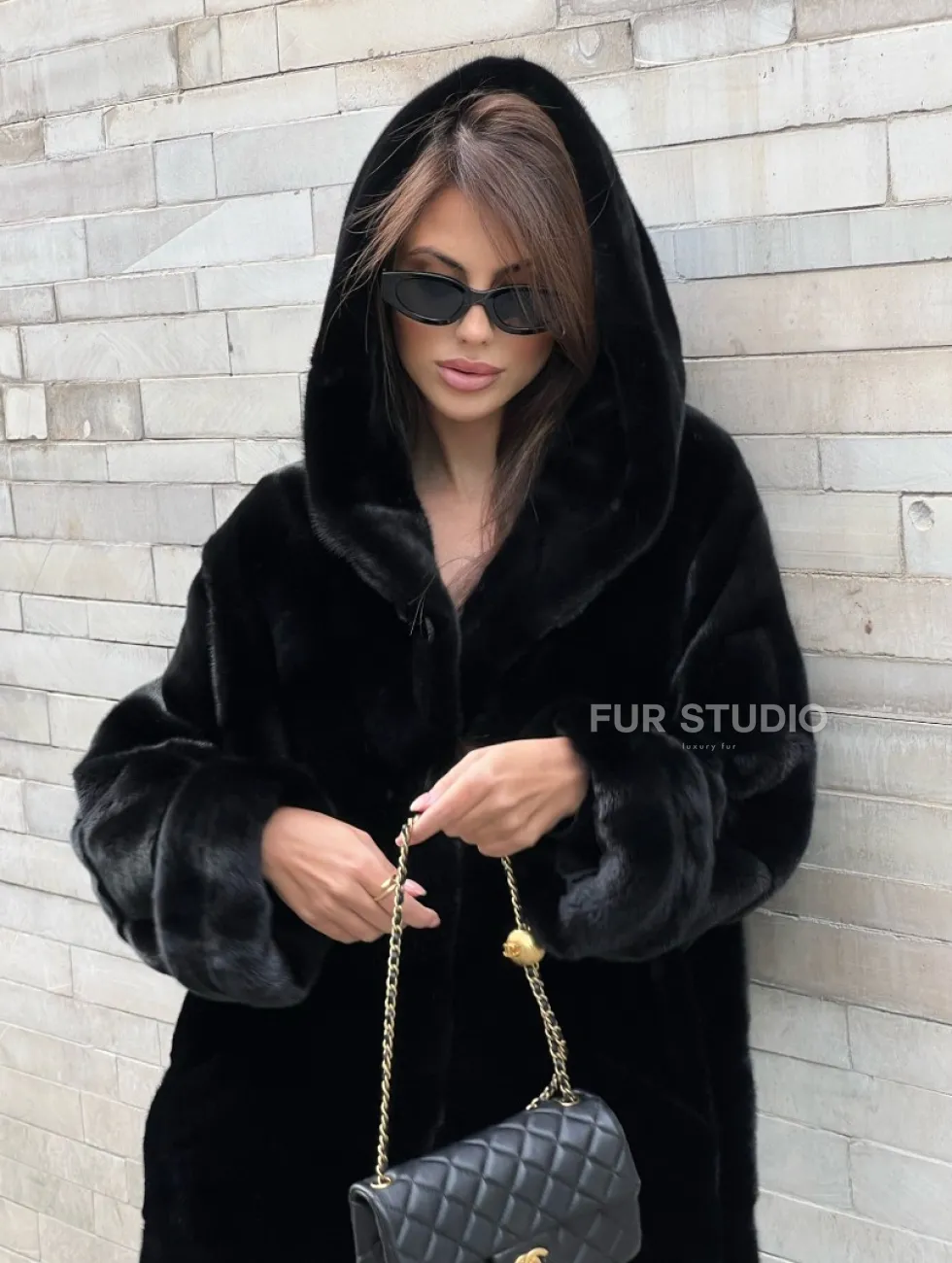 Шуба из меха норки NAFA с капюшоном – деталь гардероба каждой уважающей себя леди. Нежный мех удивительно теплый и согреет в прохладную погоду. Шубка невесома, практически