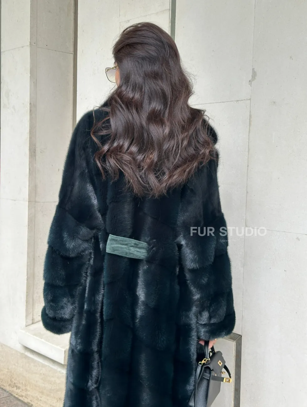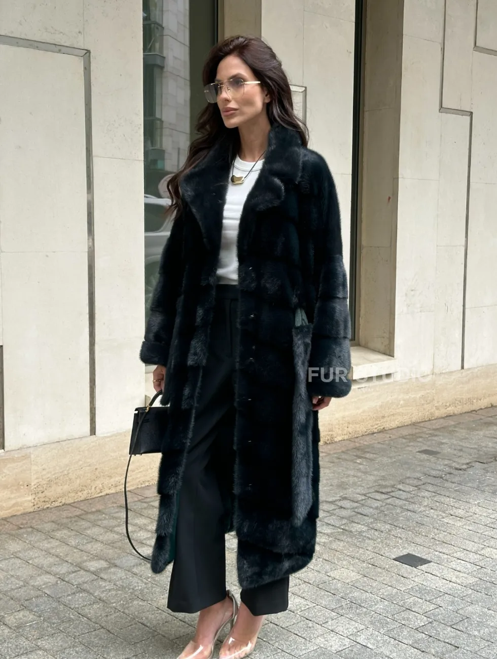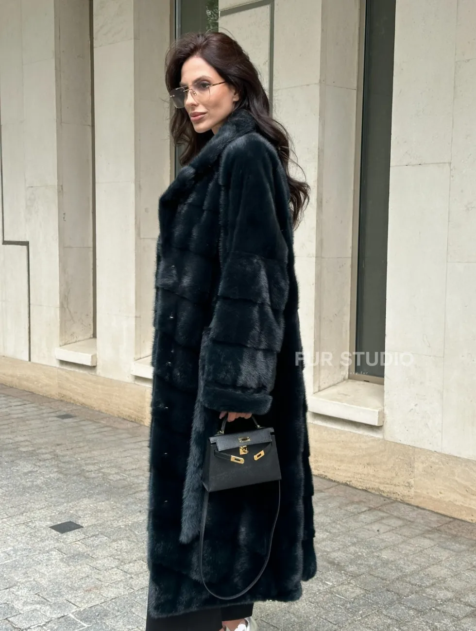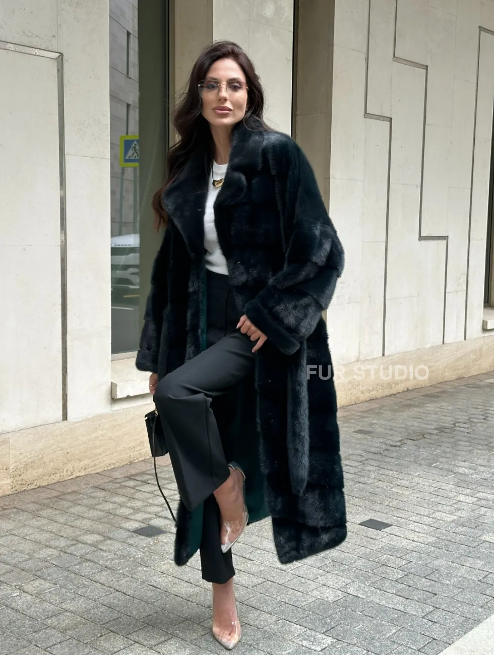 Мех данной шубы аукционная норка, цвет зеленый. Предлагается в размерах от 42 до 54. Длина модели 115-120 см, что выгодно подчеркивает фигуру девушек. Эта модель идеально подойдет для девушек и женщин, предпочитающих роскошные натуральные меха.
