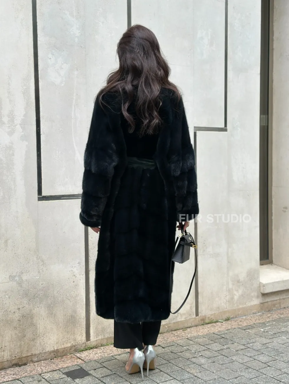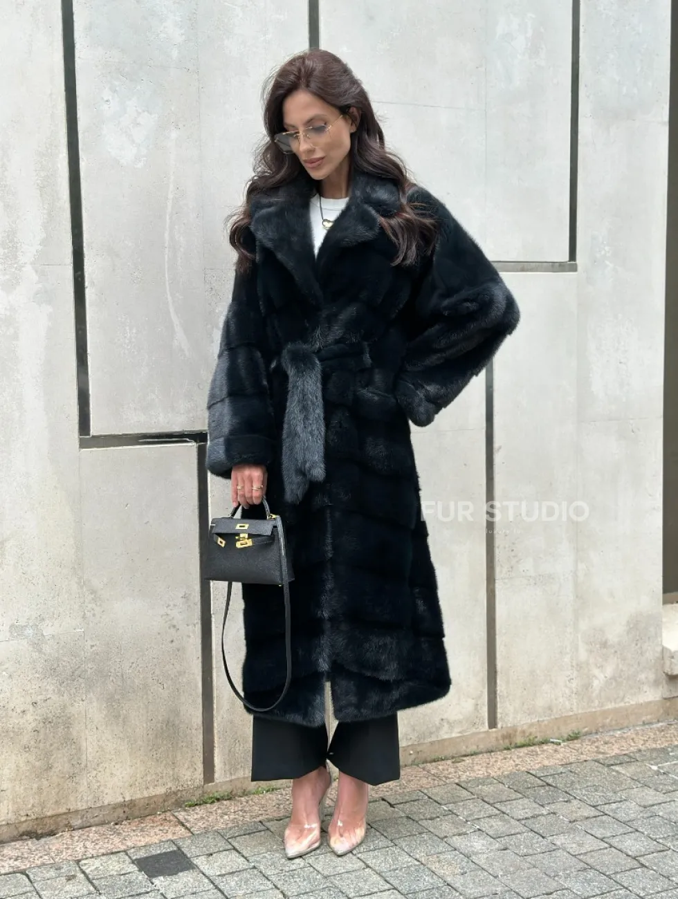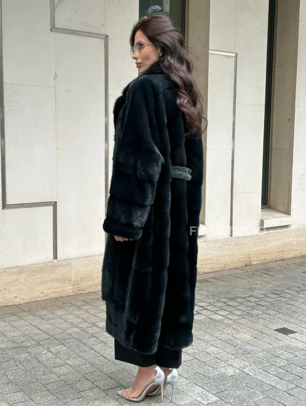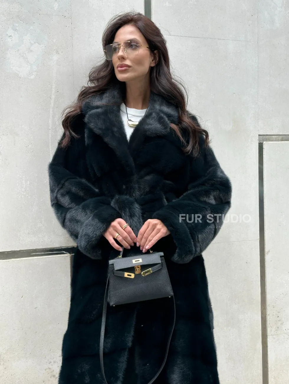 Мех данной шубы аукционная норка, цвет зеленый. Предлагается в размерах от 42 до 54. Длина модели 115-120 см, что выгодно подчеркивает фигуру девушек. Эта модель идеально подойдет для девушек и женщин, предпочитающих роскошные натуральные меха.