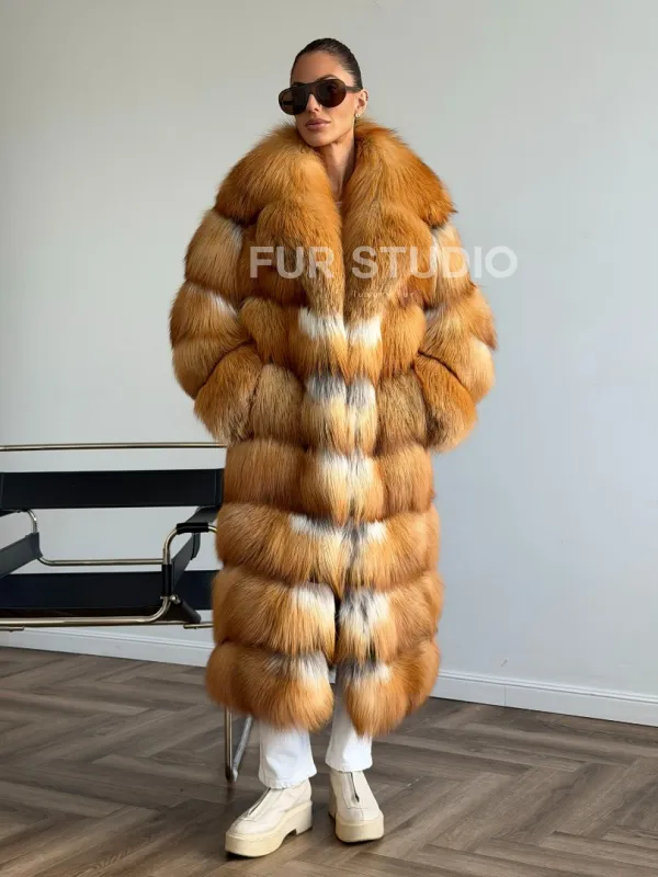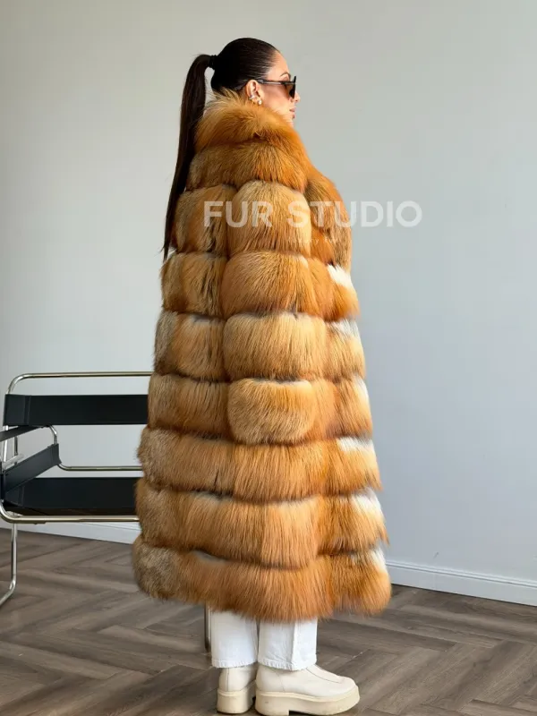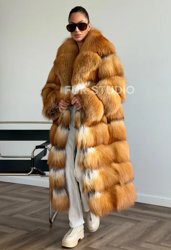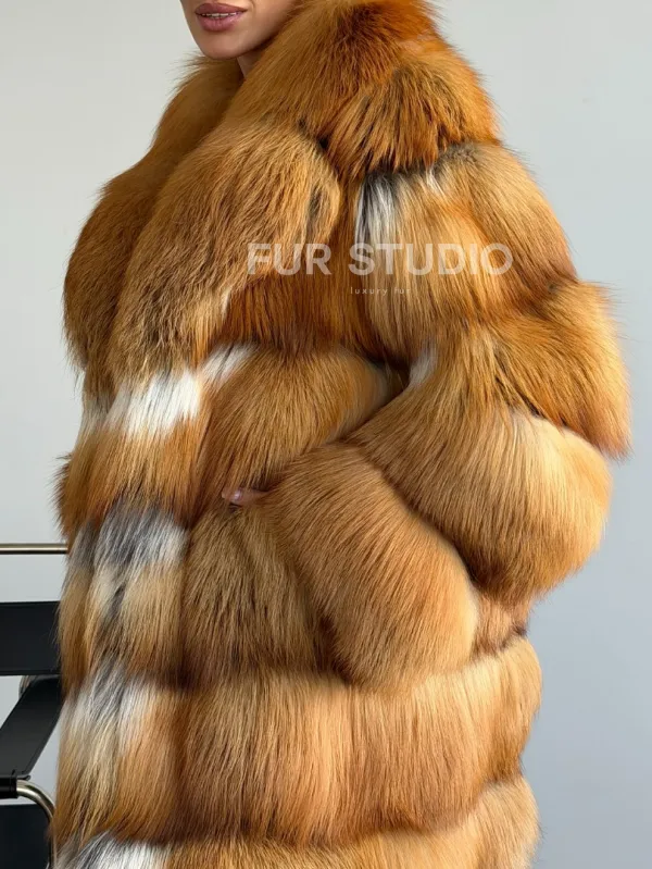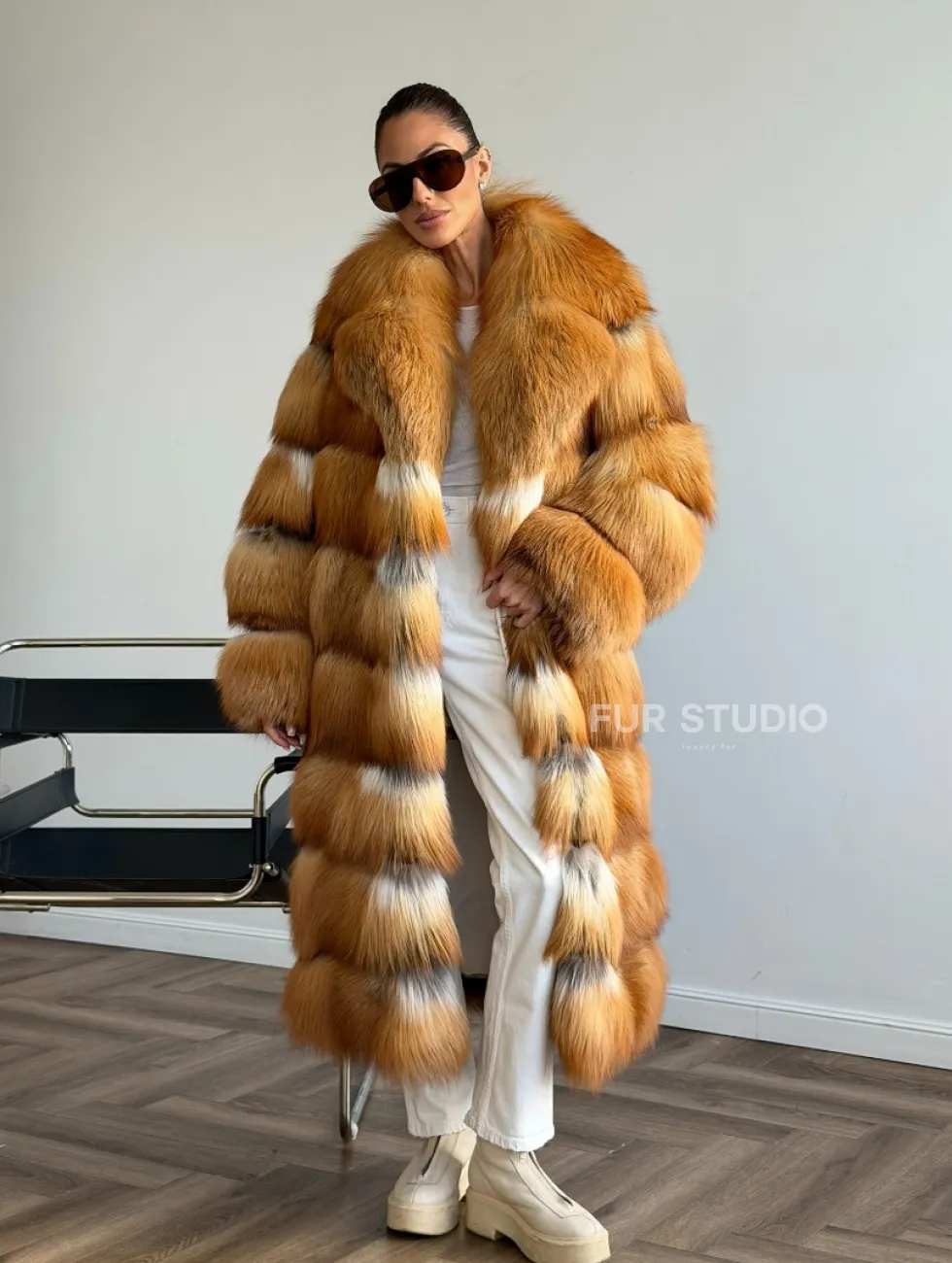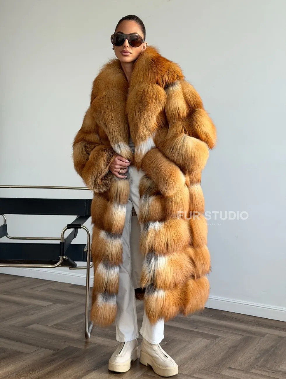 Мех данной шубы лиса, цвет рыжий. Предлагается в размерах от 42 до 48. Длина модели 115-120 см, что выгодно подчеркивает фигуру девушек. Эта модель идеально подойдет для девушек и женщин, предпочитающих роскошные натуральные меха.