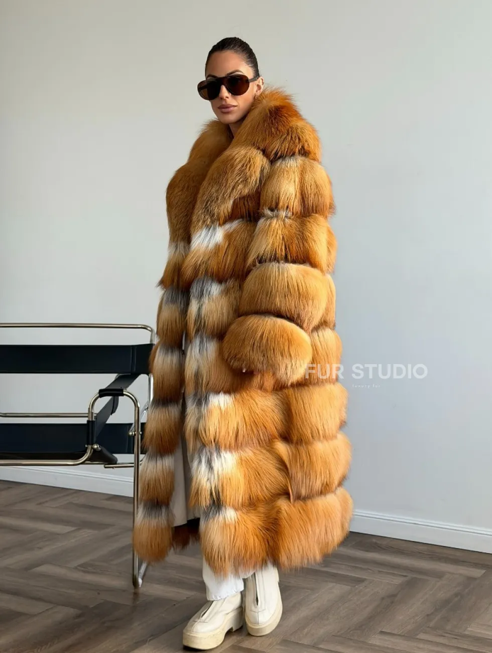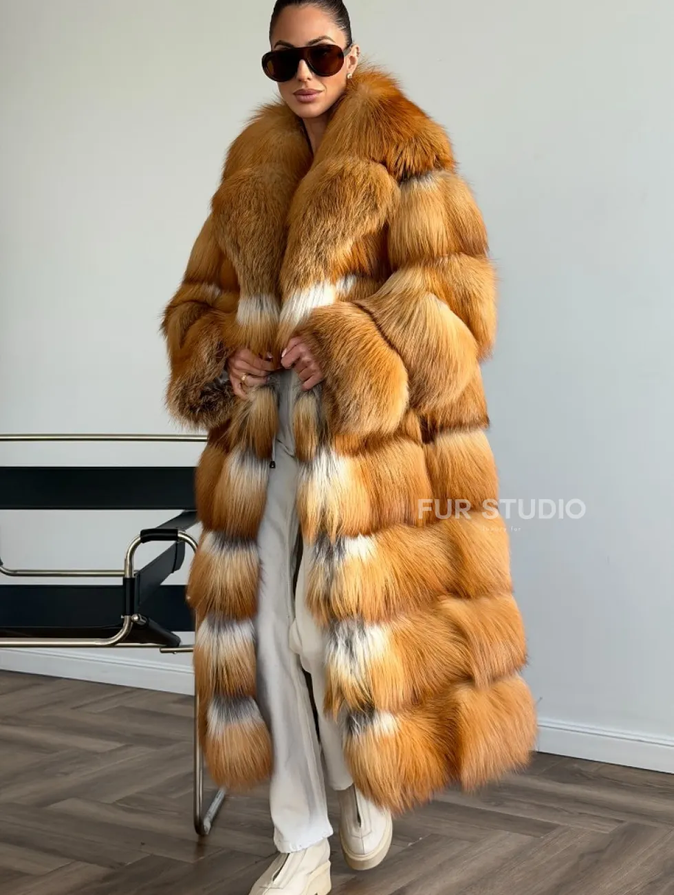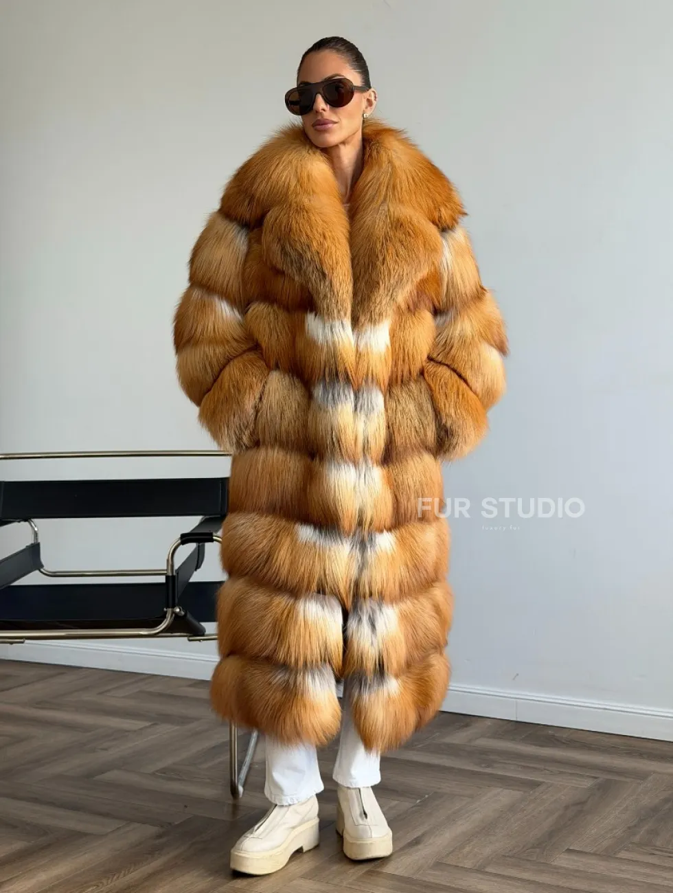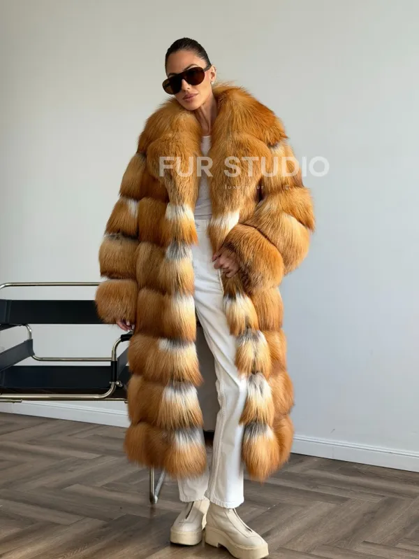 Мех данной шубы лиса, цвет рыжий. Предлагается в размерах от 42 до 48. Длина модели 115-120 см, что выгодно подчеркивает фигуру девушек. Эта модель идеально подойдет для девушек и женщин, предпочитающих роскошные натуральные меха.