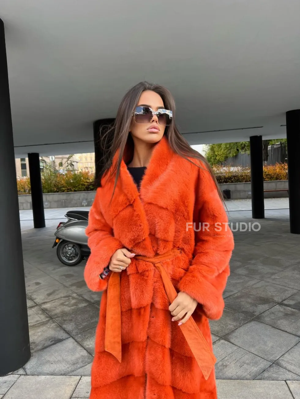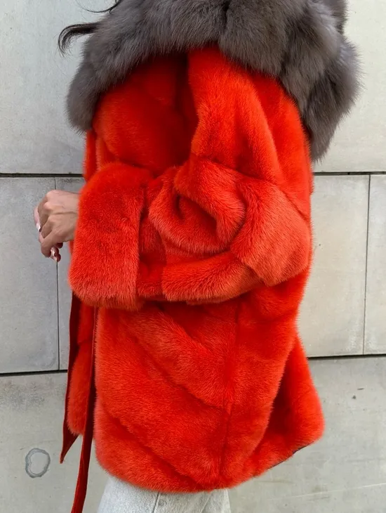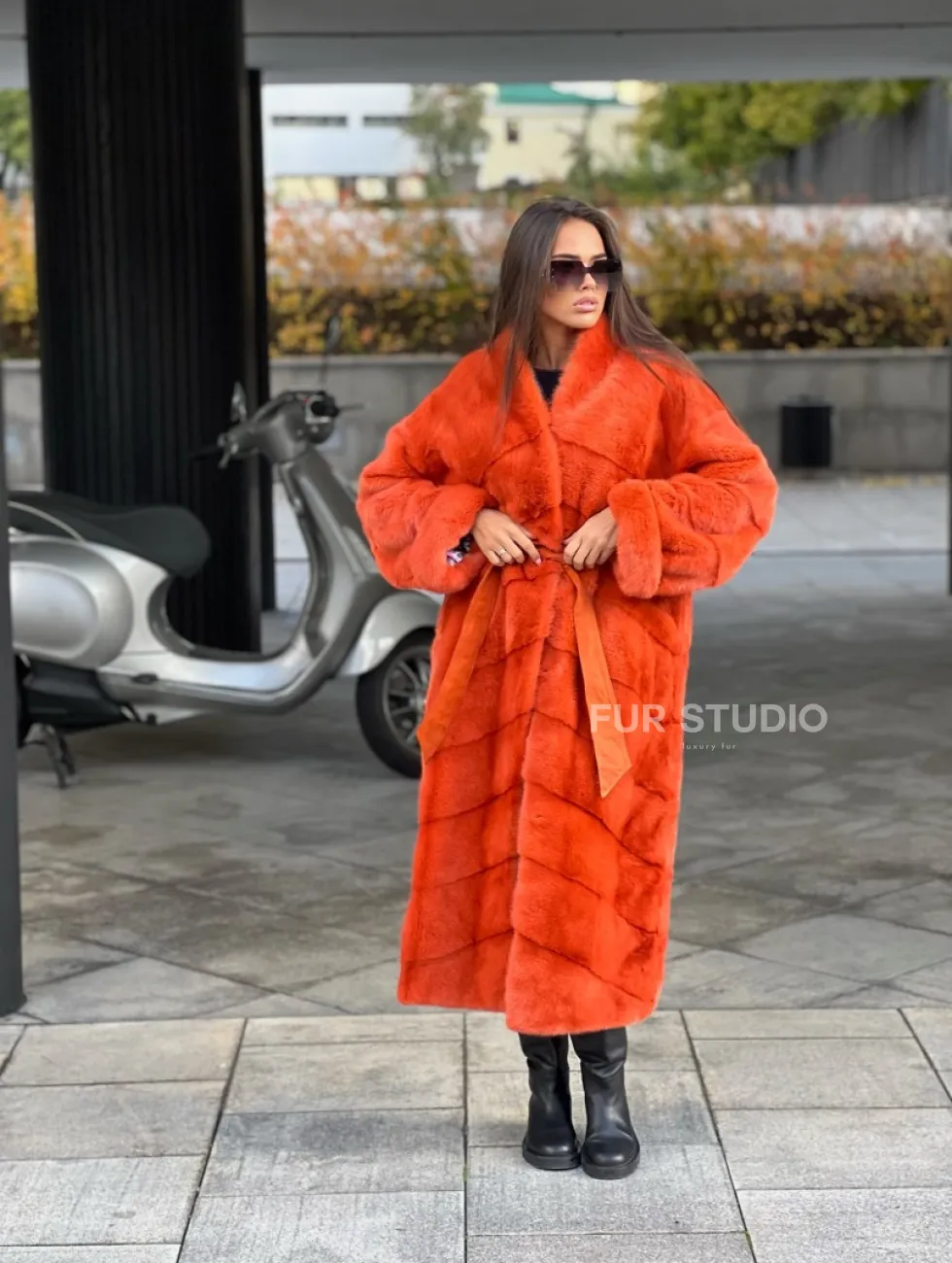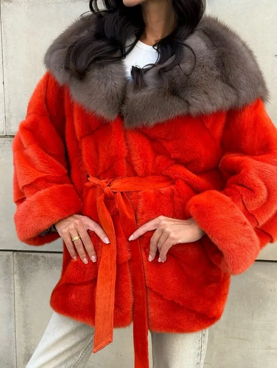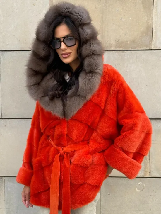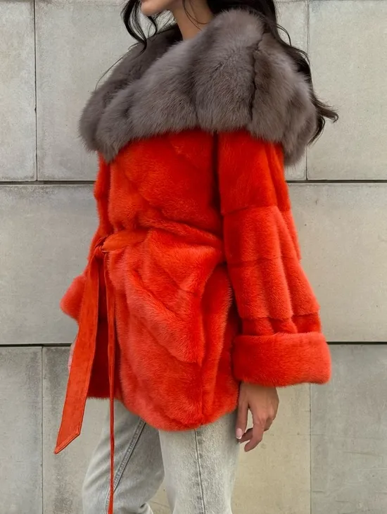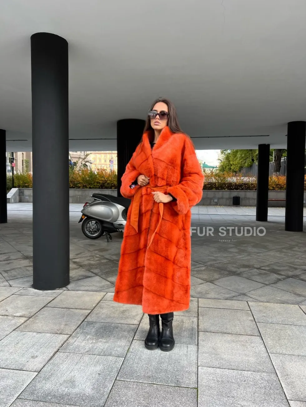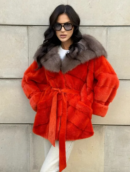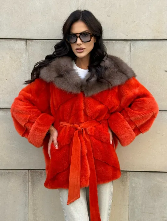 Широкие рукава не сковывают движений, что комфортно для вождения машины. Оригинальный пояс подчеркнет изящную талию. Прямой крой зрительно увеличит рост и скроет недостатки фигуры. Яркий оттенок выгодно подчеркнет цвет волос и глаз владелицы. Купить шубу из меха скандинавской норки в оранжевом оттенке могут только уверенные в себе женщины, которые любят удивлять.