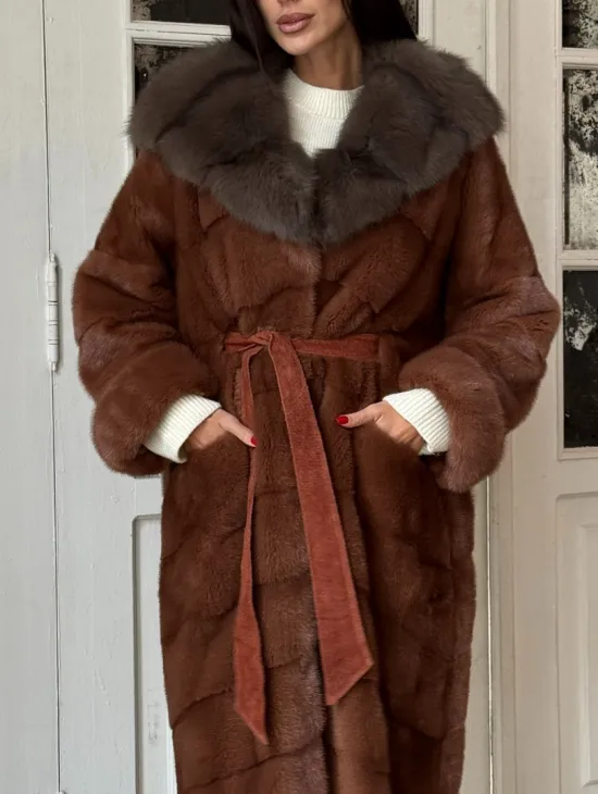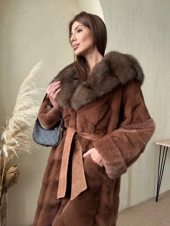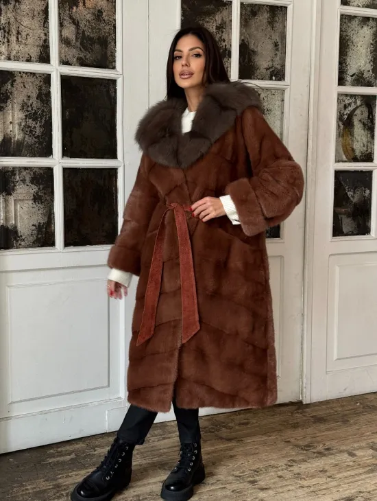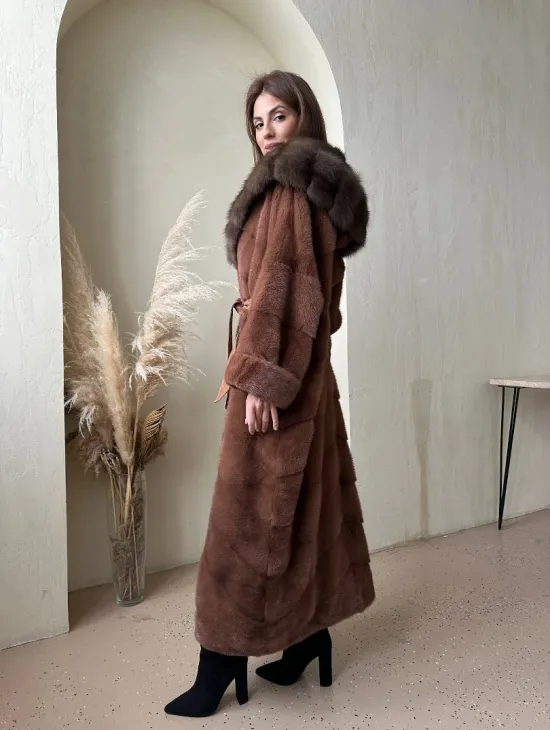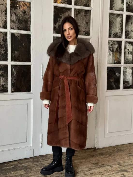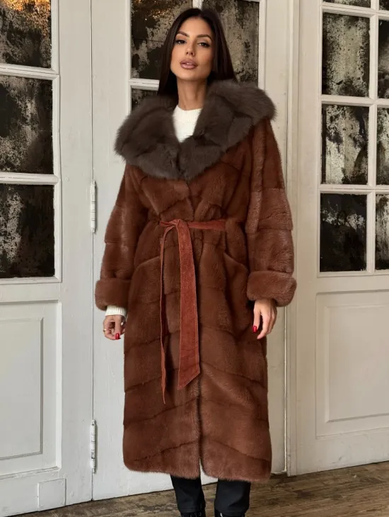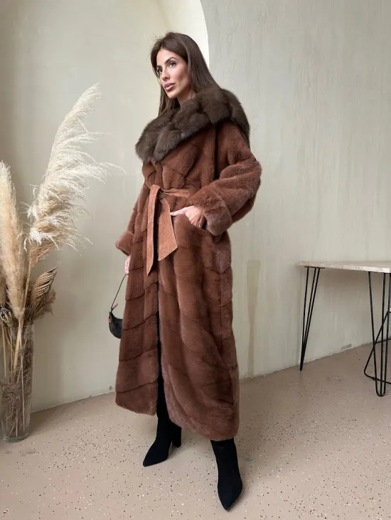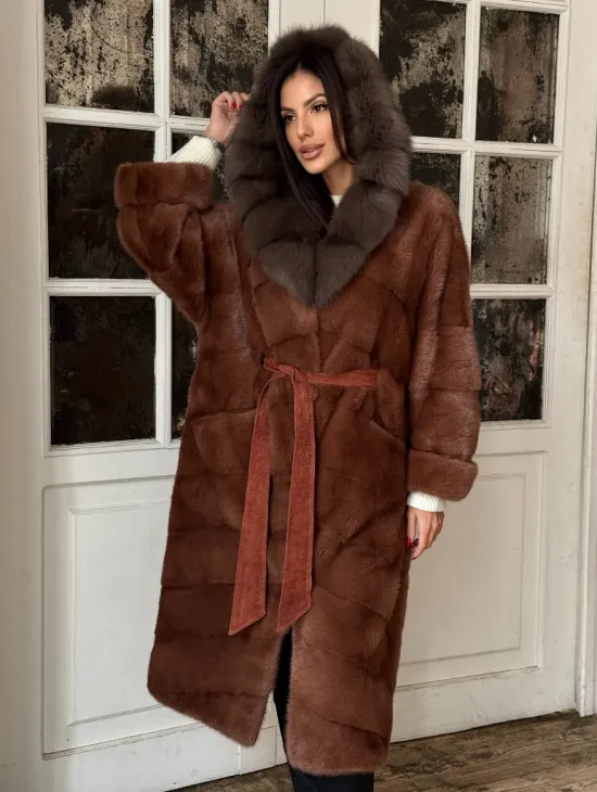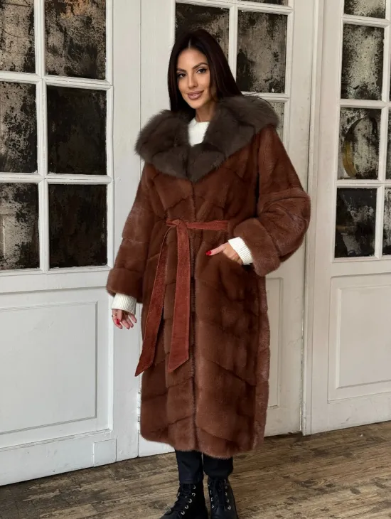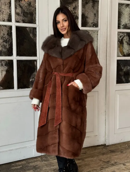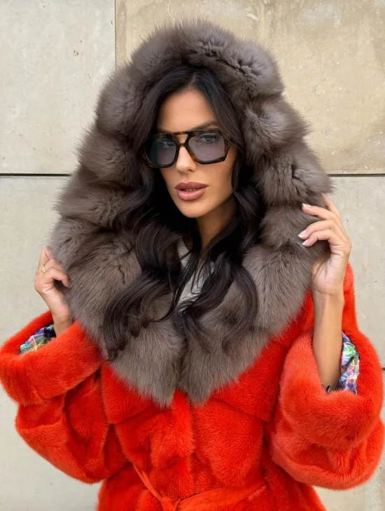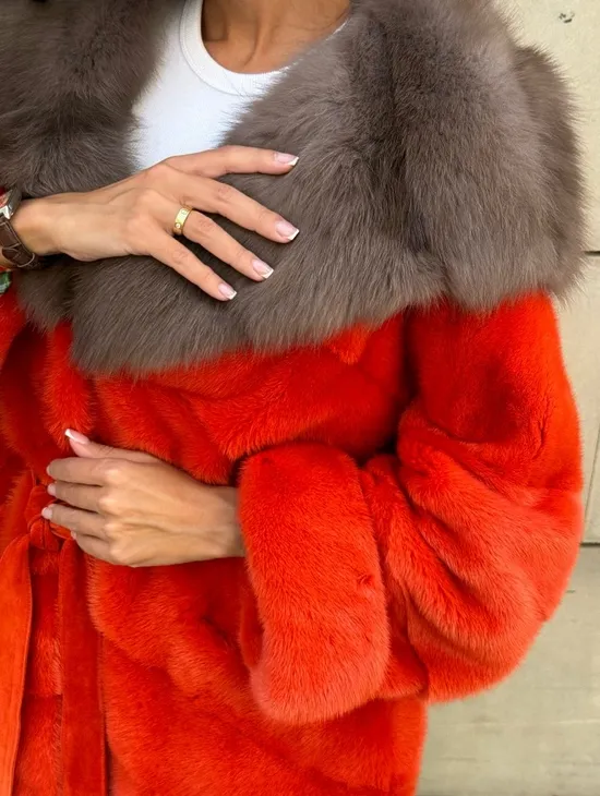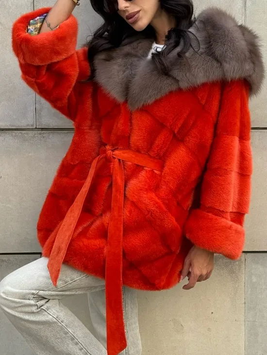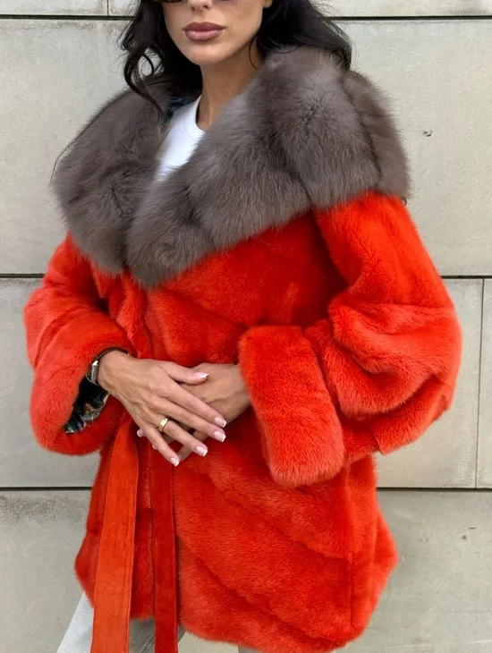 Широкие рукава не сковывают движений, что комфортно для вождения машины. Оригинальный пояс подчеркнет изящную талию. Прямой крой зрительно увеличит рост и скроет недостатки фигуры. Яркий оттенок выгодно подчеркнет цвет волос и глаз владелицы. Купить шубу из меха скандинавской норки в оранжевом оттенке могут только уверенные в себе женщины, которые любят удивлять.