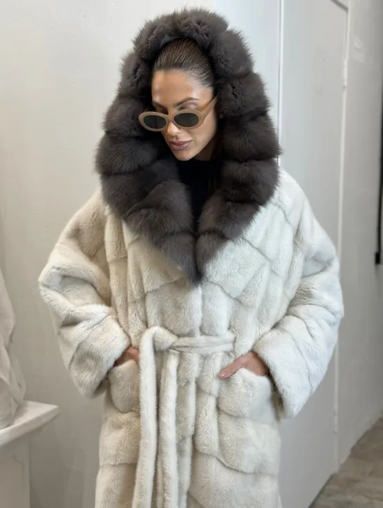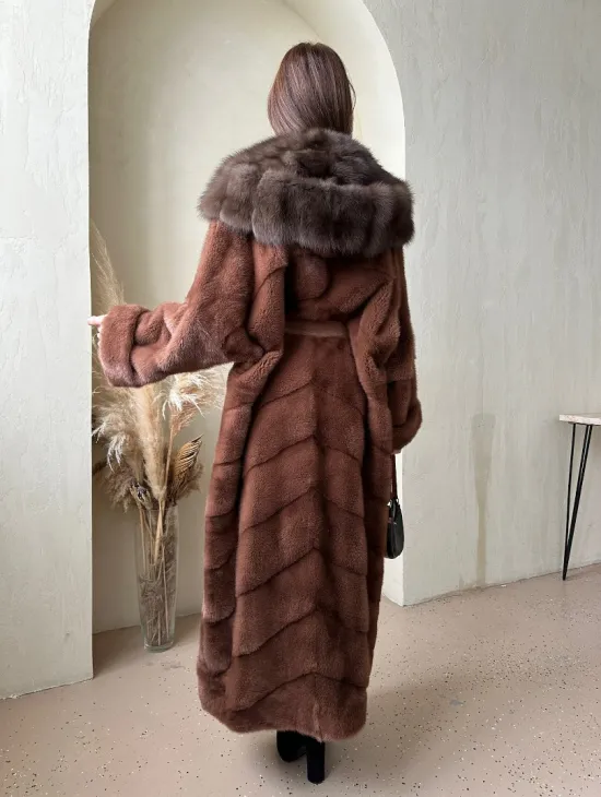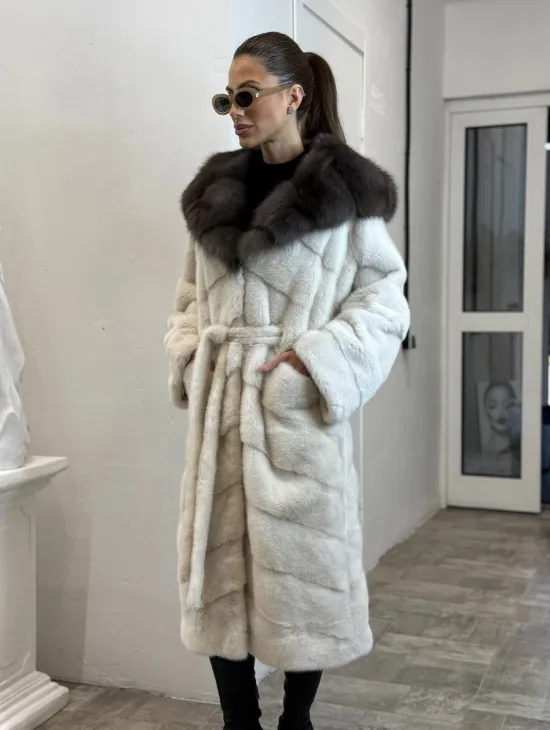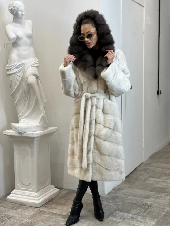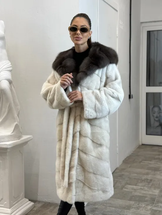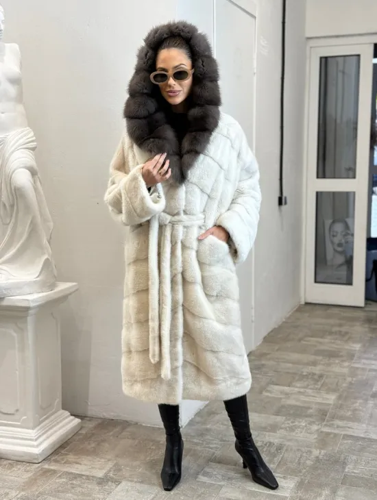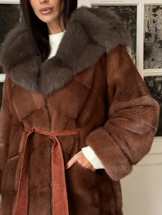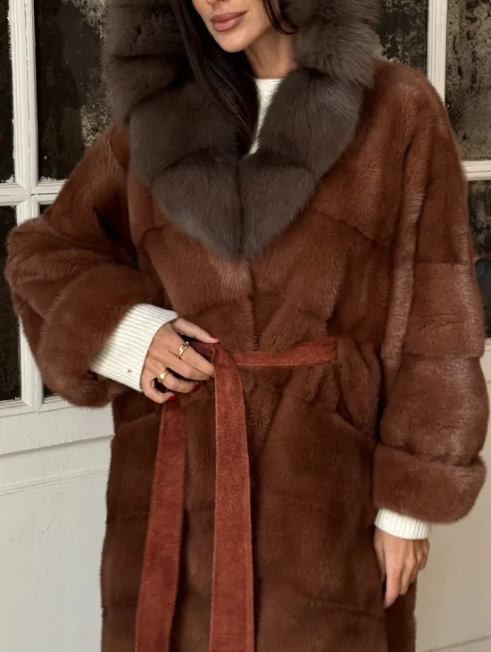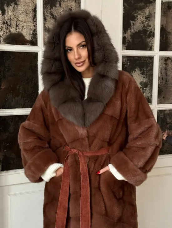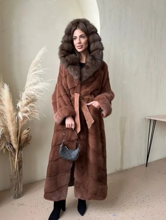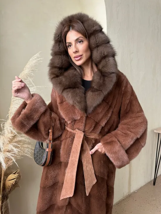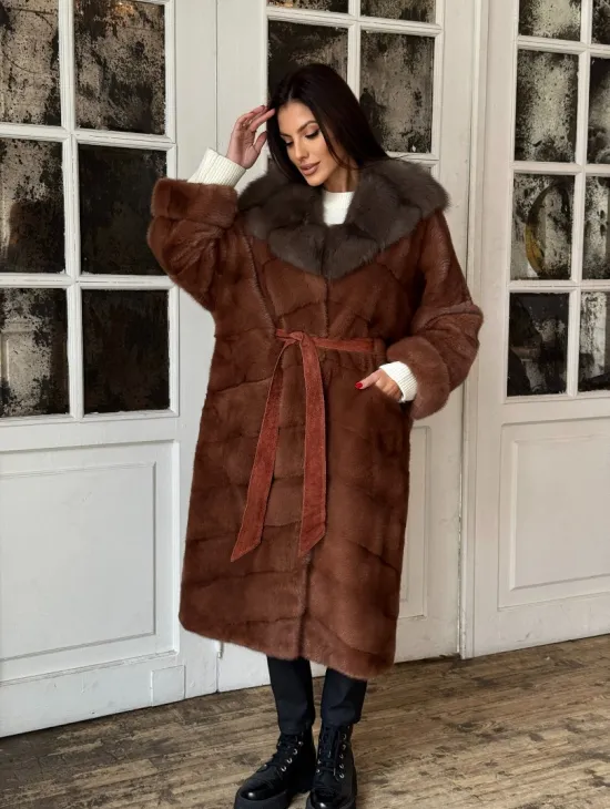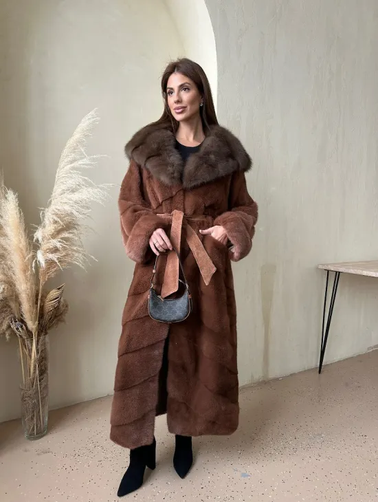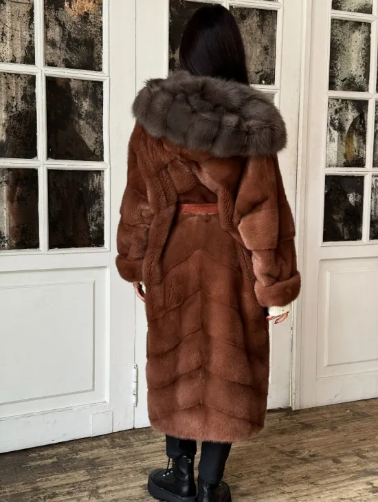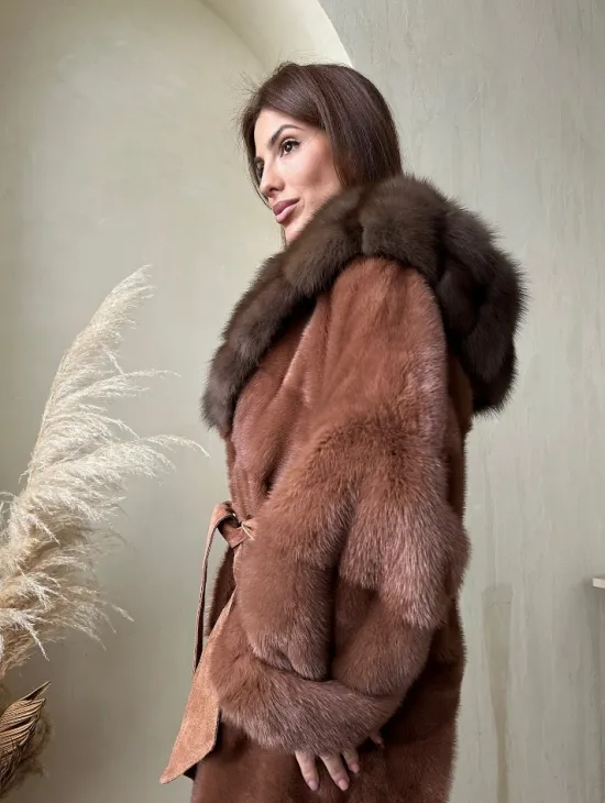 Широкие рукава не сковывают движений, что комфортно для вождения машины. Оригинальный пояс подчеркнет изящную талию. Прямой крой зрительно увеличит рост и скроет недостатки фигуры. Яркий оттенок выгодно подчеркнет цвет волос и глаз владелицы. Купить шубу из меха скандинавской норки в оранжевом оттенке могут только уверенные в себе женщины, которые любят удивлять.