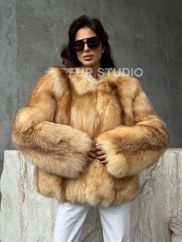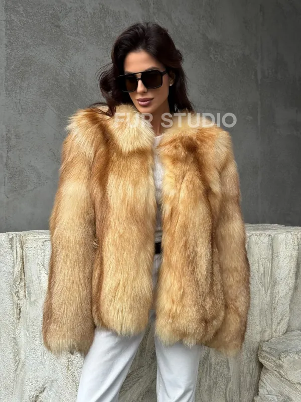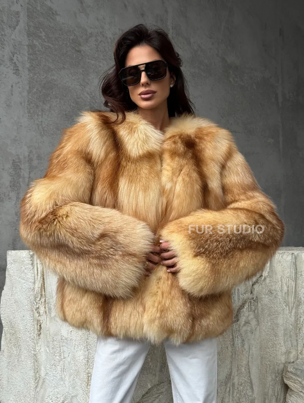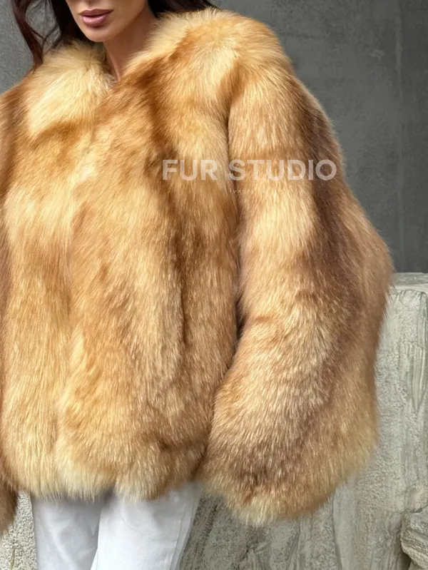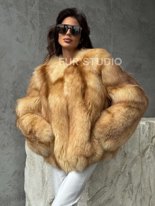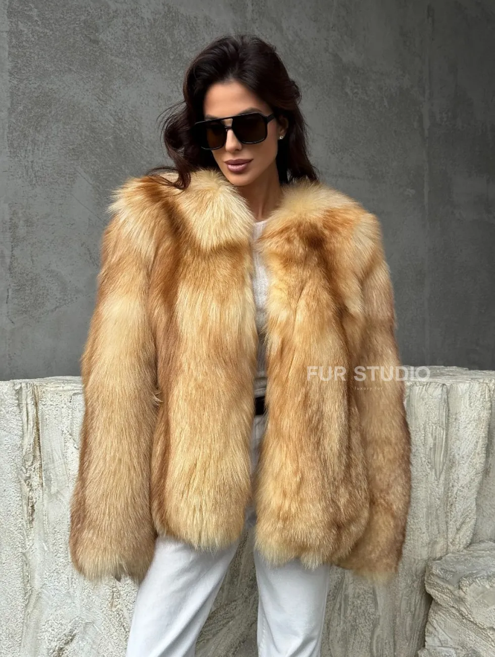 Мех данной шубы лиса, цвет рыжий. Предлагается в размерах от 42 до 48. Длина модели 65-70 см, что выгодно подчеркивает фигуру девушек. Эта модель идеально подойдет для девушек и женщин, предпочитающих роскошные натуральные меха.