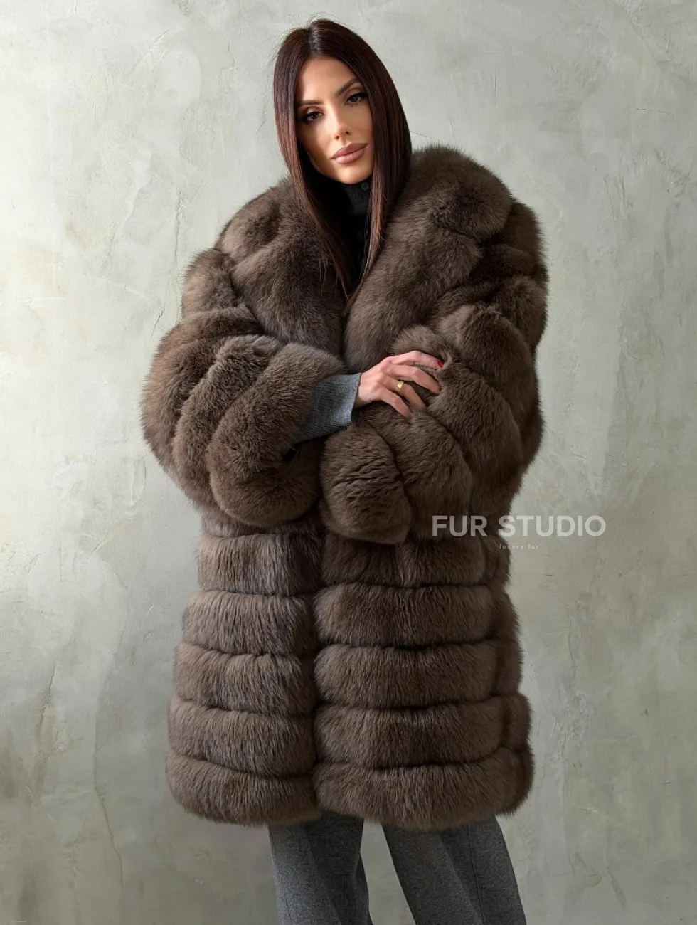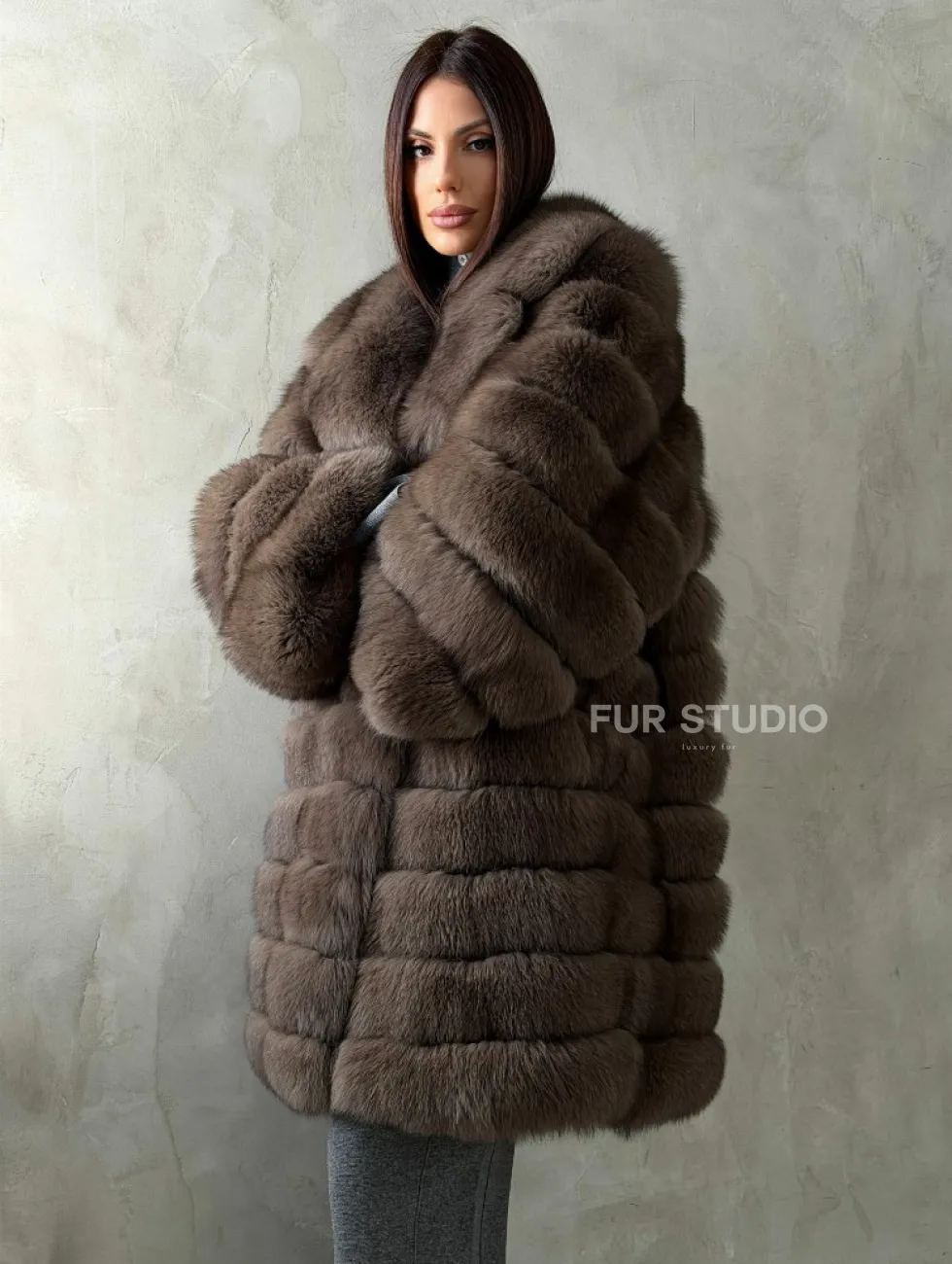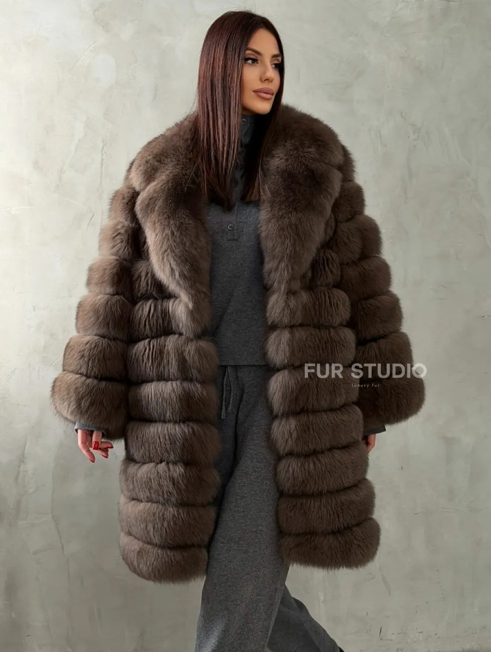 Мех данной шубы финский песец, цвет коричневый. Предлагается в размерах от 42 до 50. Длина модели 95-100 см, что выгодно подчеркивает фигуру девушек. Эта модель идеально подойдет для девушек и женщин, предпочитающих роскошные натуральные меха.