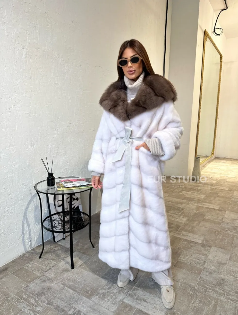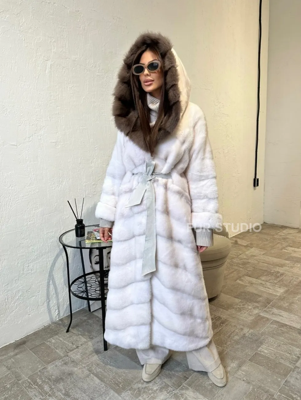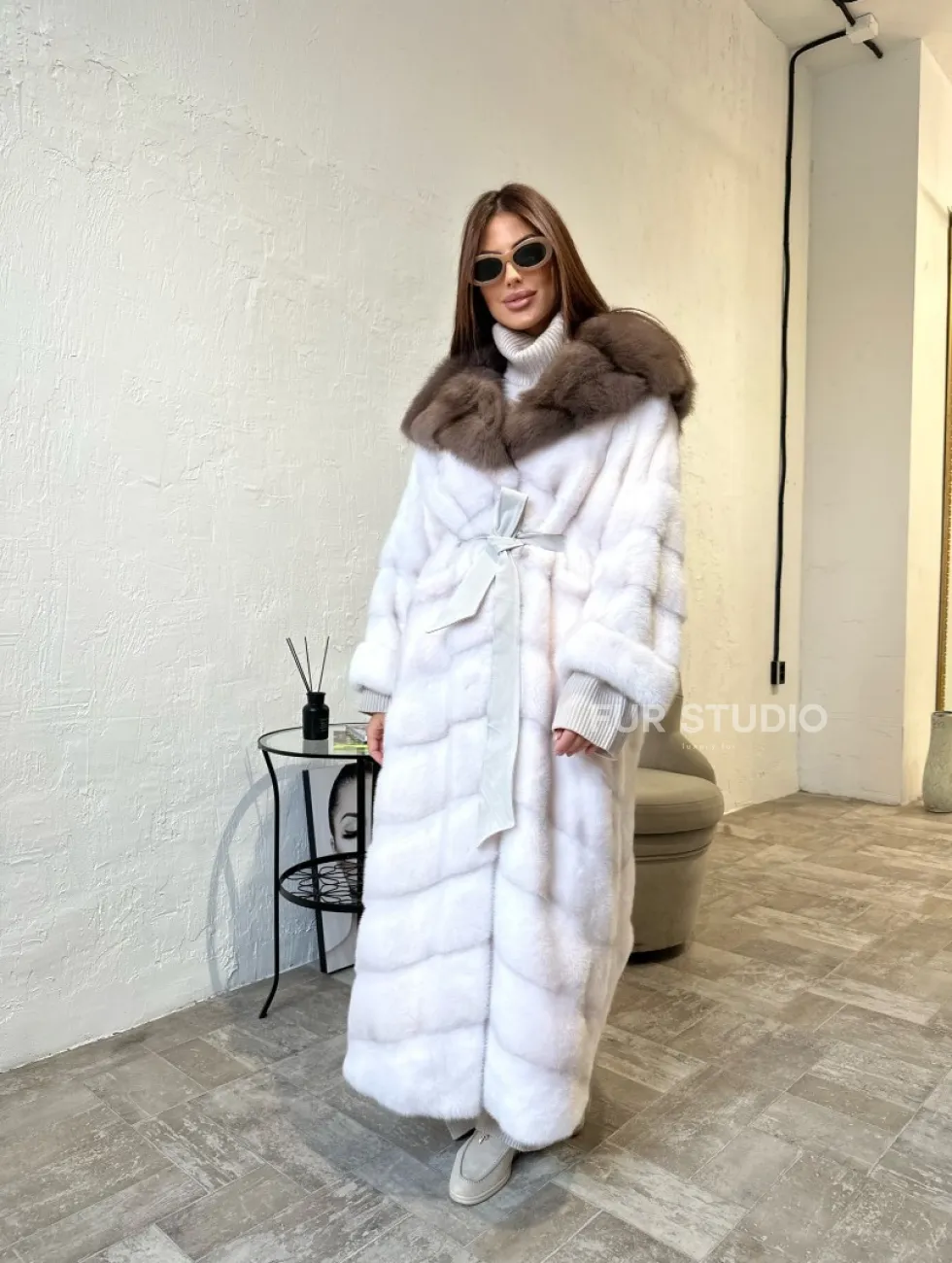 Широкие манжеты подчеркнут изящество кистей. Глубокие карманы не дадут замерзнуть ручкам в холода. Необычный пояс выгодно выделит талию и сделает ее тонкой. Модель идеально сочетается со стилем casual, подойдет под вечерний look. Купить шубу из плюшевой норки VELVET с капюшоном из меха куницы цвета.