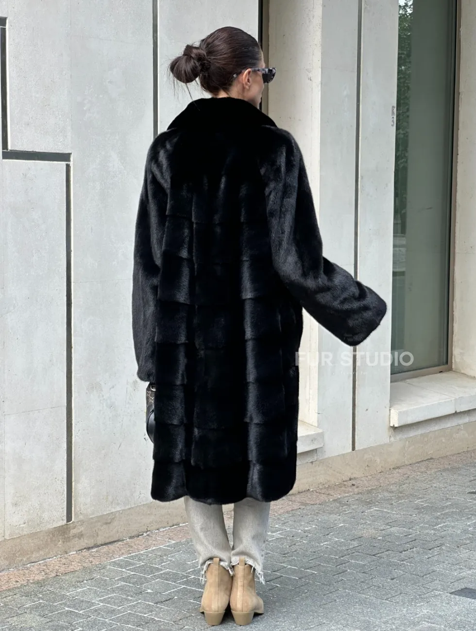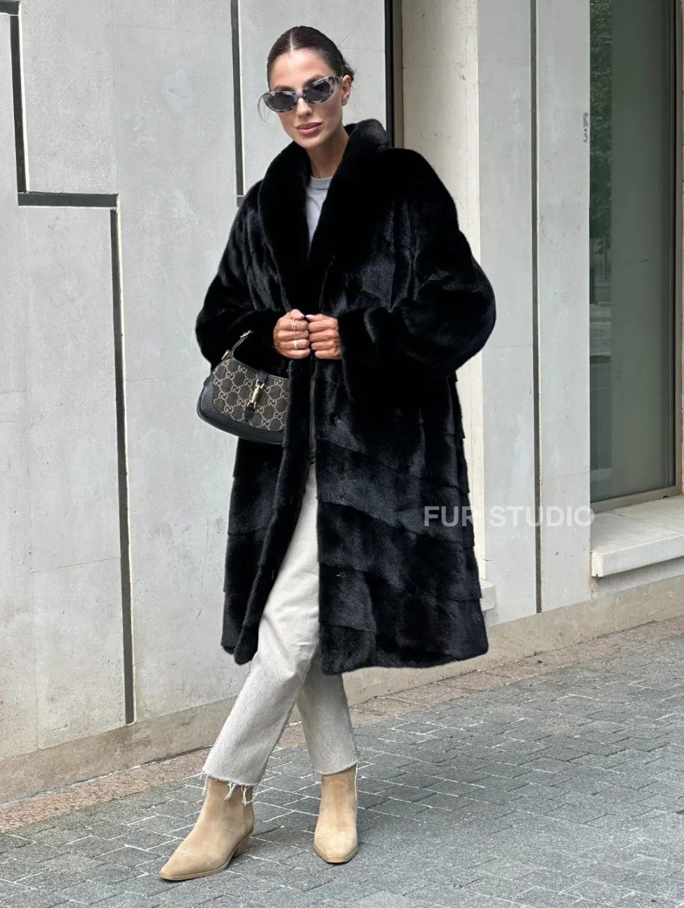 Мех данной шубы аукционная норка , цвет черный. Предлагается в размерах от 42 до 48 с 50. Длина модели 105-110 см, что выгодно подчеркивает фигуру девушек. Эта модель идеально подойдет для девушек и женщин, предпочитающих роскошные натуральные меха.