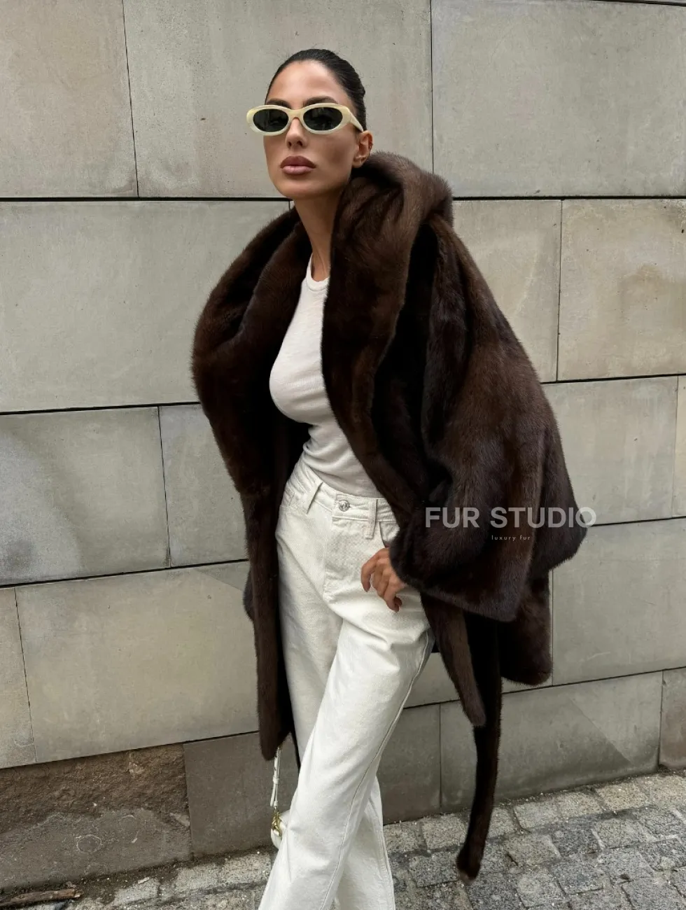 Шуба из скандинавской норки с капюшоном летучая мышь, роспуск орех доступна для покупки в нашем шоуруме Furs Studio в Чите. У нас так же есть доставка во все города России. Добавьте немного роскоши в свой гардероб с этой шубой, которая будет служить вам многие годы.