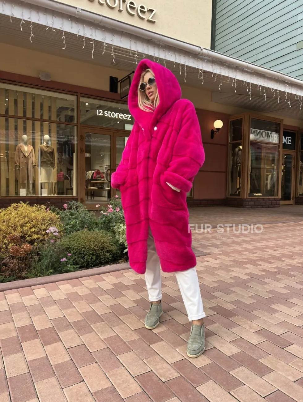 Роскошный капюшон сохранит прическу и не даст замерзнуть голове. Прямой крой зрительно увеличит рост. Оригинальные пуговицы придают образу лаконичность. Добавьте брендовую сумочку и стильную обувь к lookу, вы готовы к выходу в свет. Купить шубу из скандинавской норки с капюшоном в розовом цвете могут женщины, которые не боятся выглядеть необычно в любое время года.