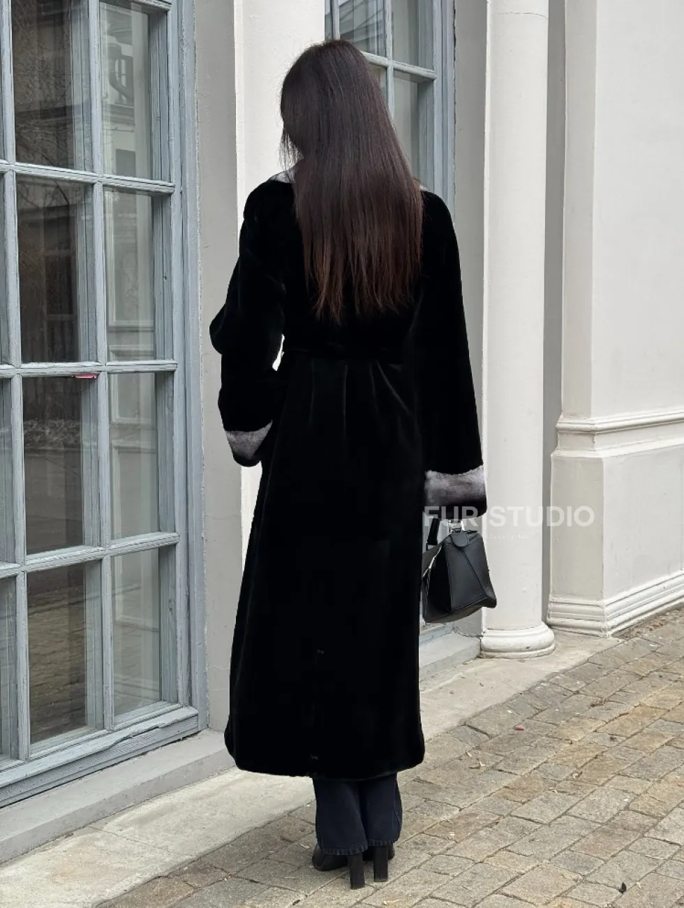 Мех данной шубы норка Blackglama, цвет черный. Предлагается в размерах от 42 до 52. Длина модели 120-125 см, что выгодно подчеркивает фигуру девушек. Эта модель идеально подойдет для девушек и женщин, предпочитающих роскошные натуральные меха.