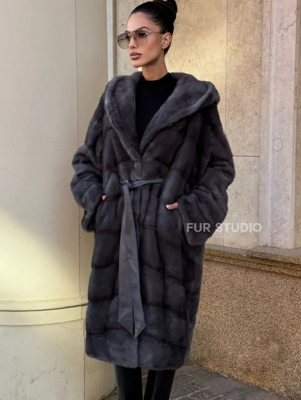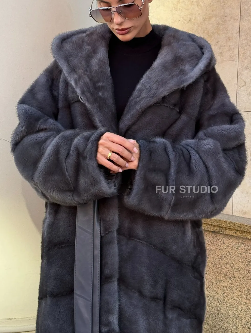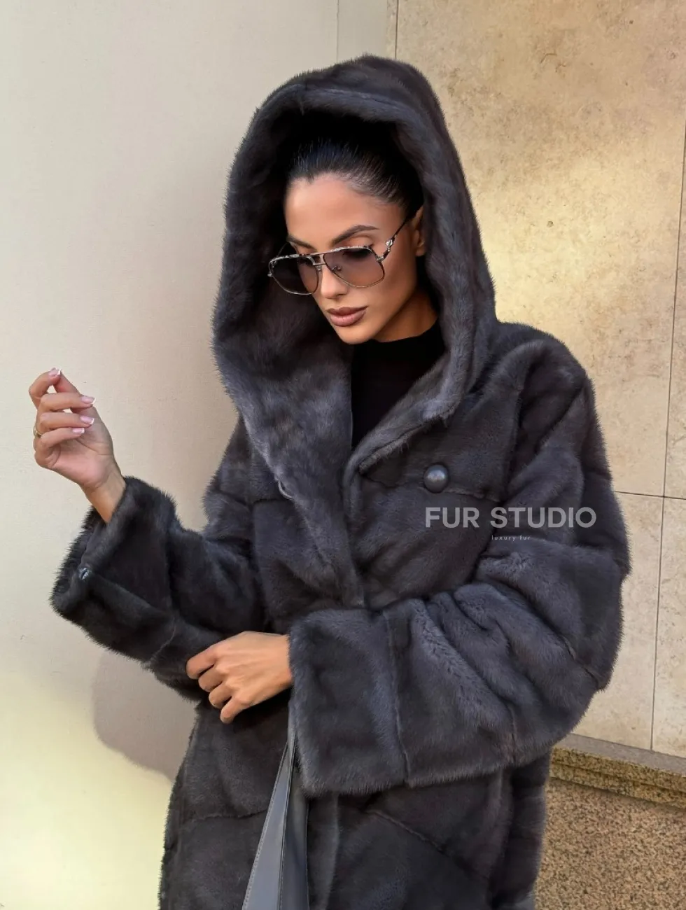 Шуба кимоно из импортной норки с капюшоном в цвете графит доступна для покупки в нашем шоуруме Furs Studio в Чите. У нас так же есть доставка во все города России. Добавьте немного роскоши в свой гардероб с этой шубой, которая будет служить вам многие годы.