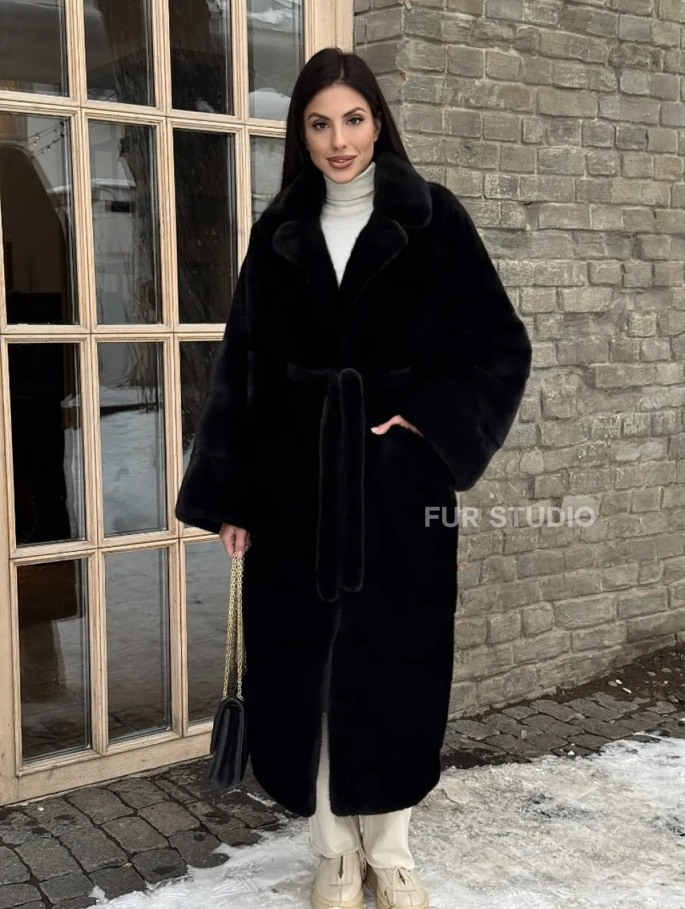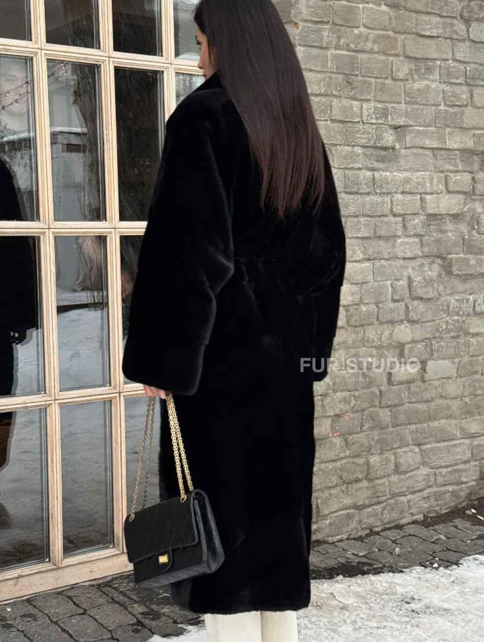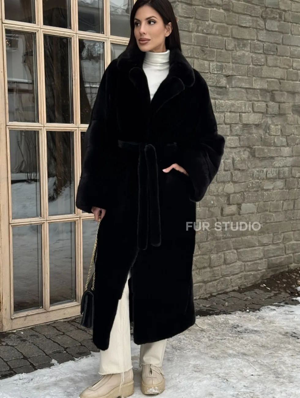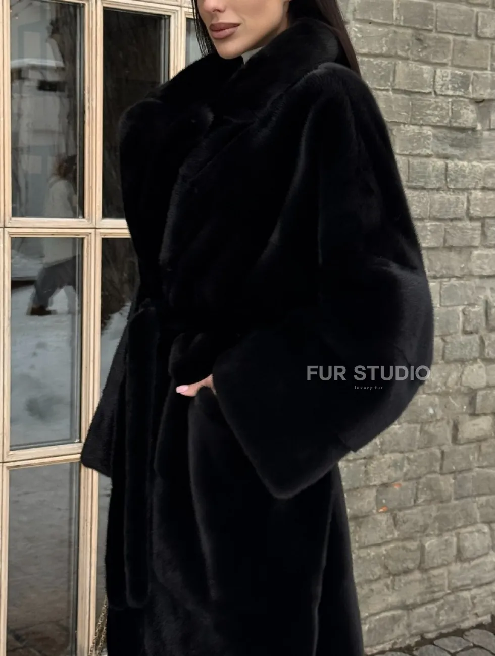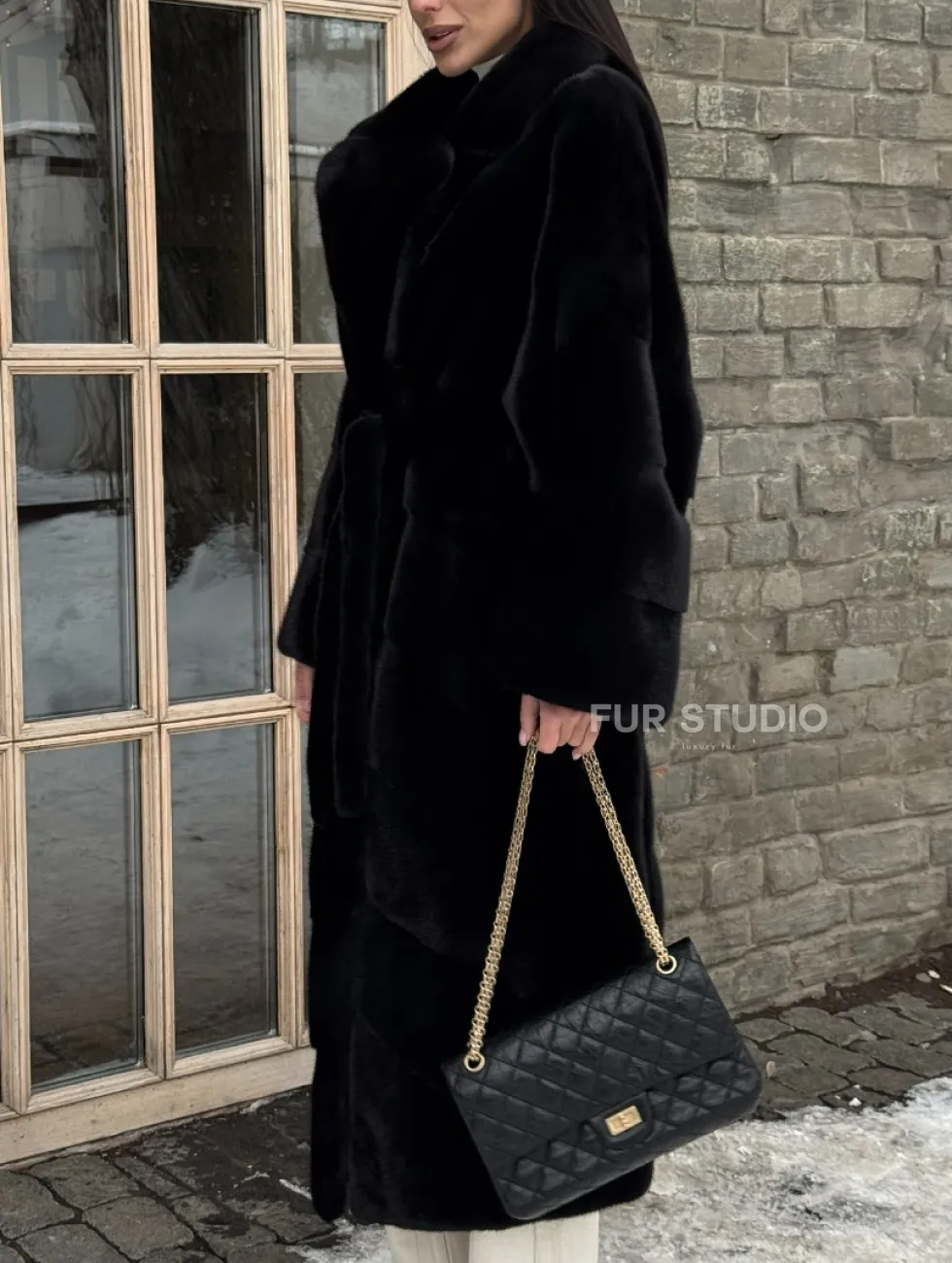 Мех данной шубы норка Blackglama, цвет черный. Предлагается в размерах от 42 до 52. Длина модели 115-120 см, что выгодно подчеркивает фигуру девушек. Эта модель идеально подойдет для девушек и женщин, предпочитающих роскошные натуральные меха.