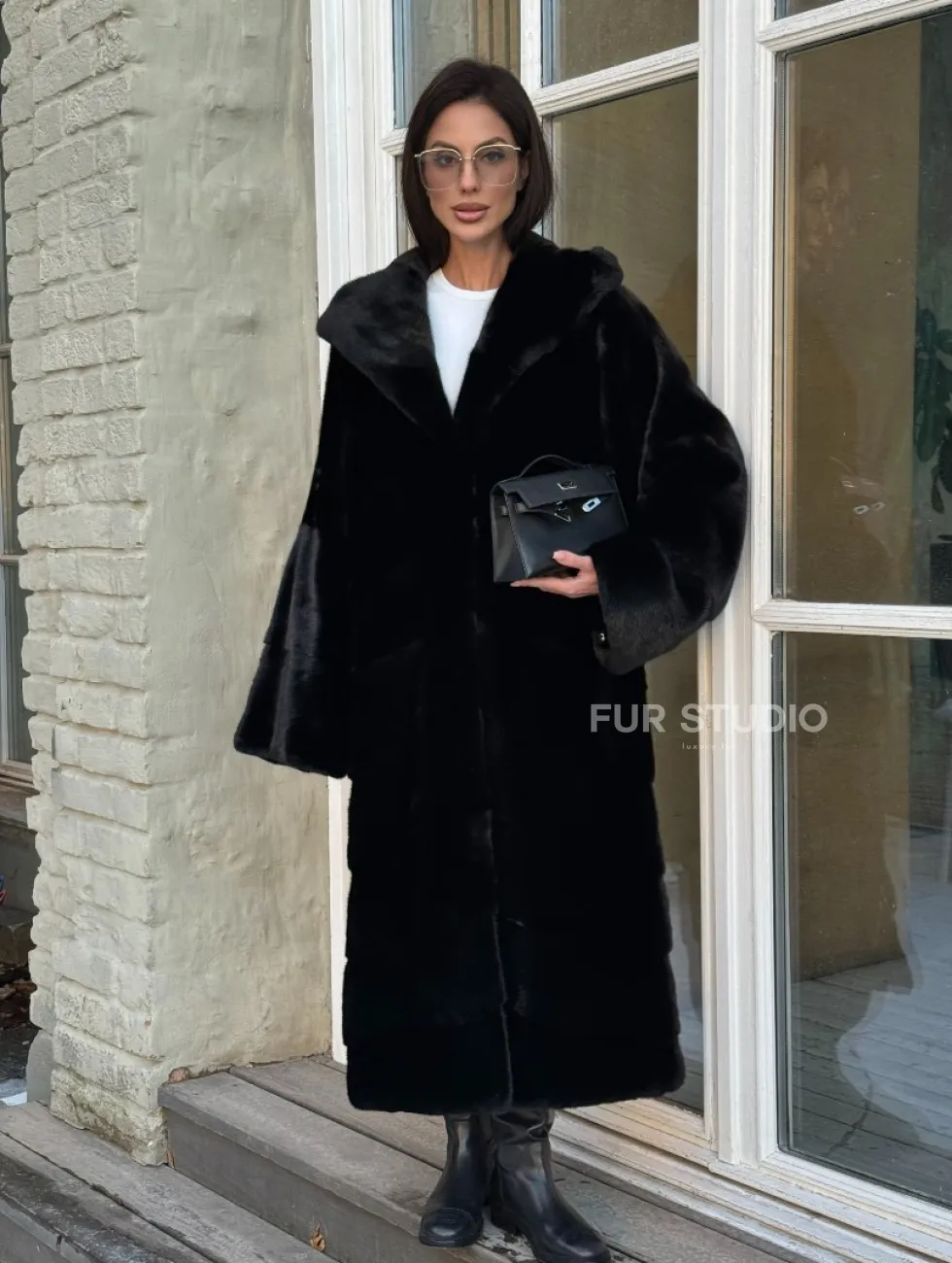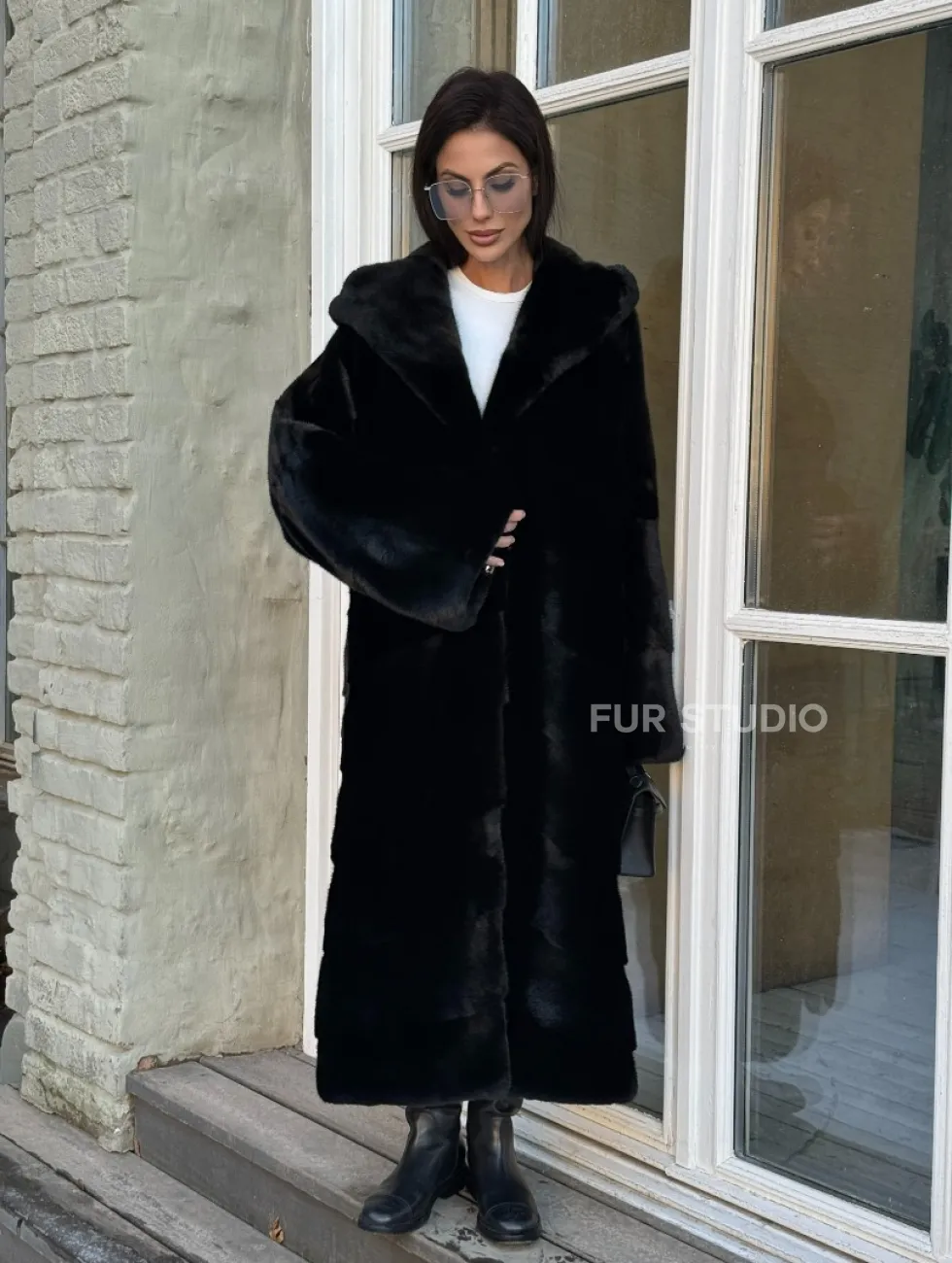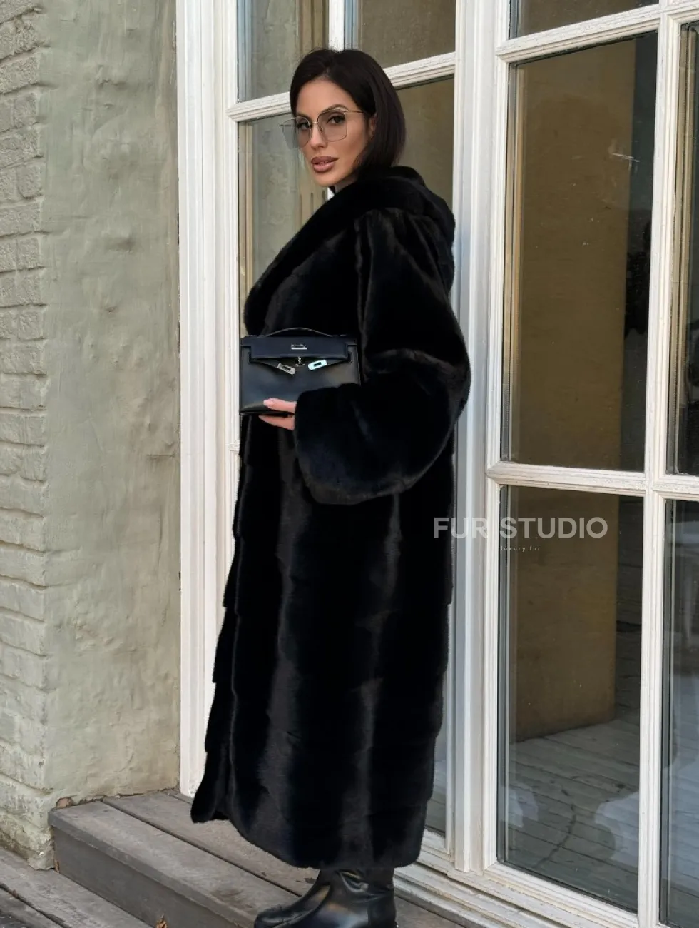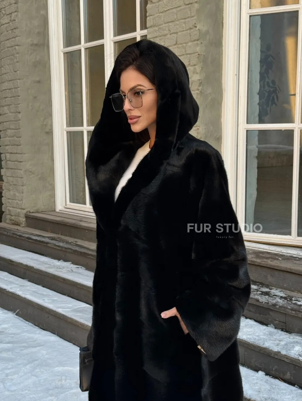 Шуба кимоно с капюшоном черного цвета из скандинавской норки Saga Furs доступна для покупки в нашем шоуруме Furs Studio в Чите. У нас так же есть доставка во все города России. Добавьте немного роскоши в свой гардероб с этой шубой, которая будет служить вам многие годы.