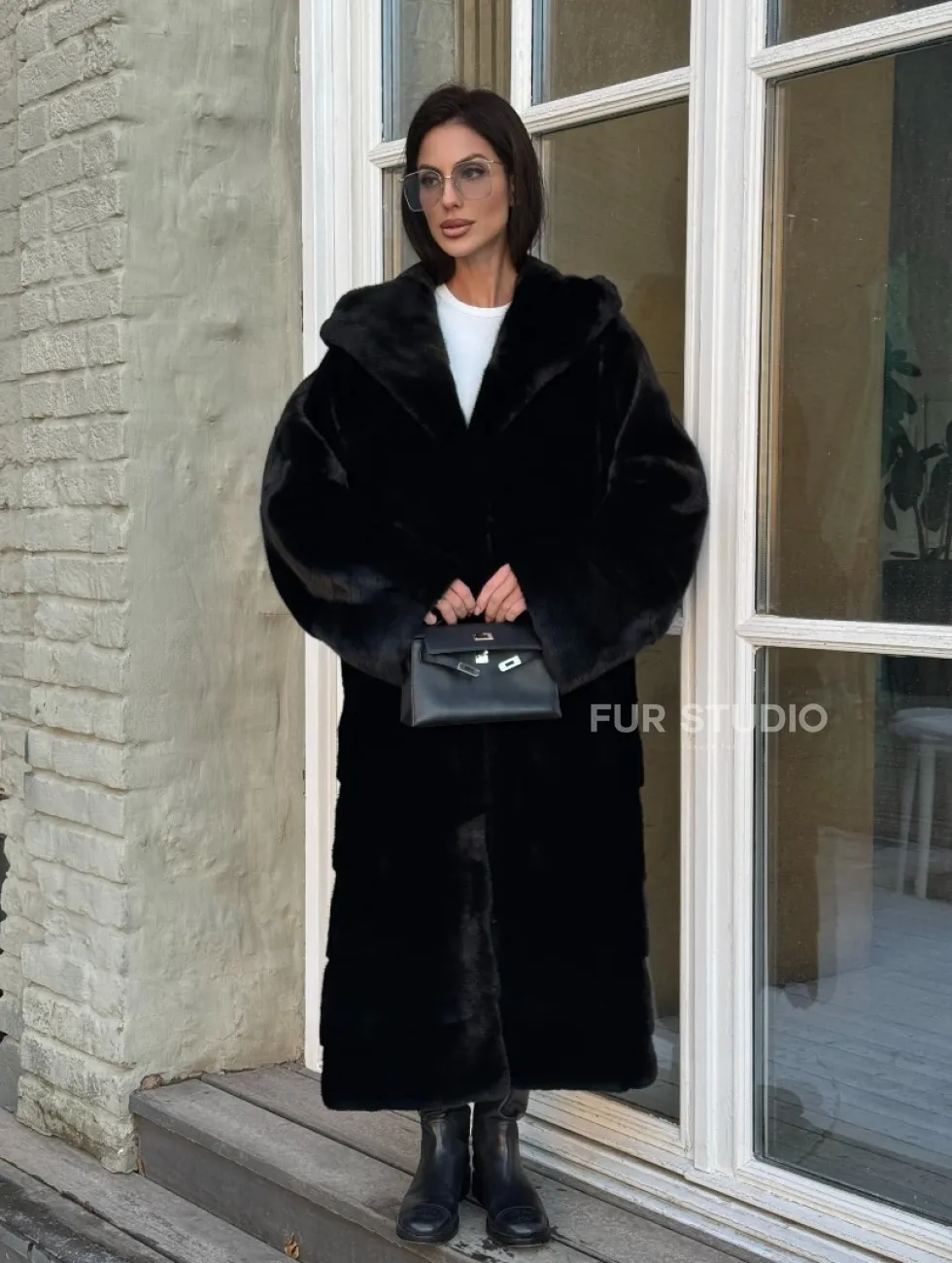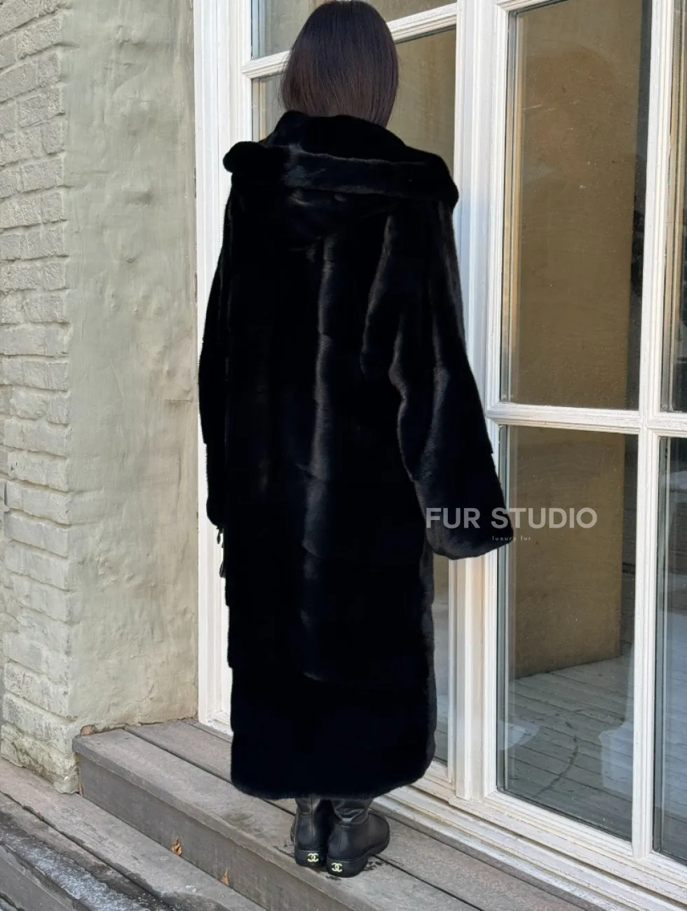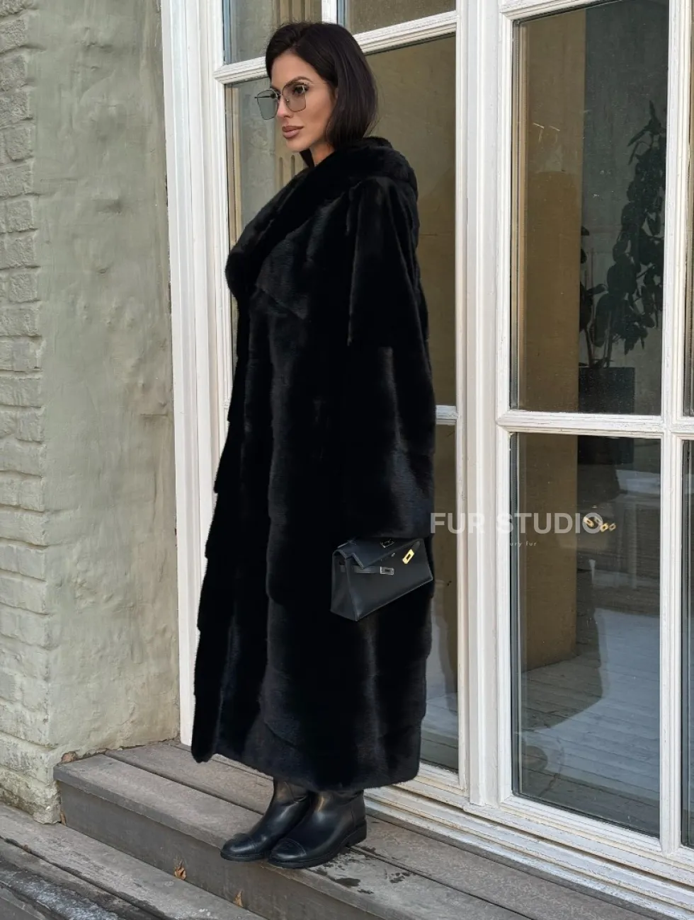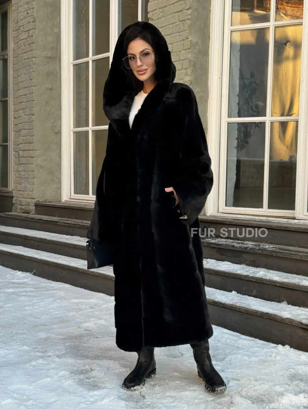 Шуба кимоно с капюшоном черного цвета из скандинавской норки Saga Furs доступна для покупки в нашем шоуруме Furs Studio в Чите. У нас так же есть доставка во все города России. Добавьте немного роскоши в свой гардероб с этой шубой, которая будет служить вам многие годы.