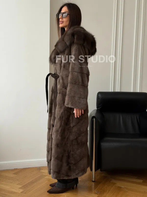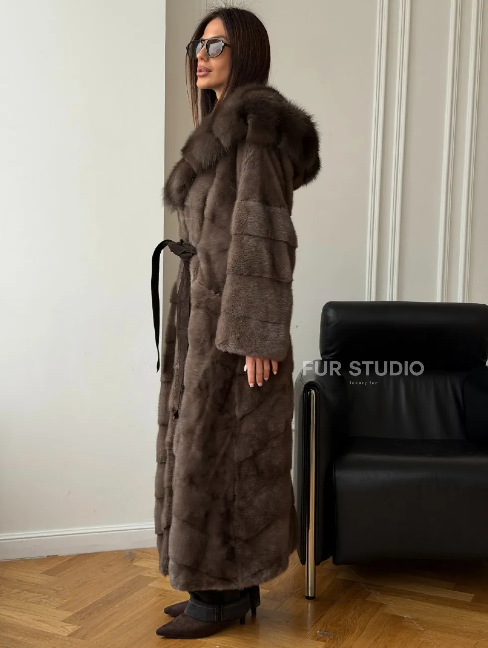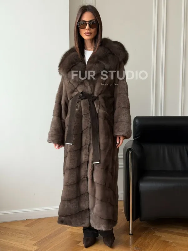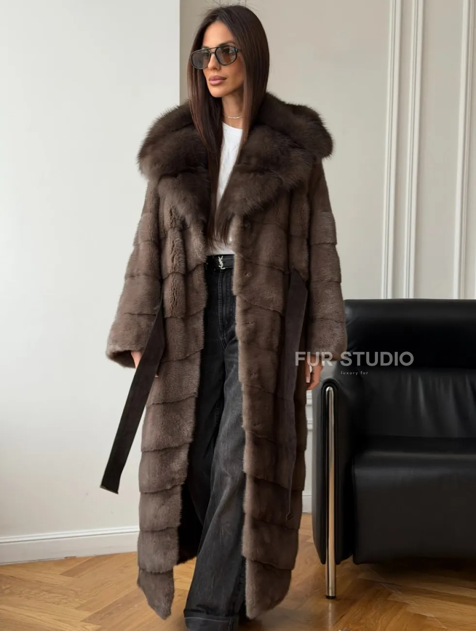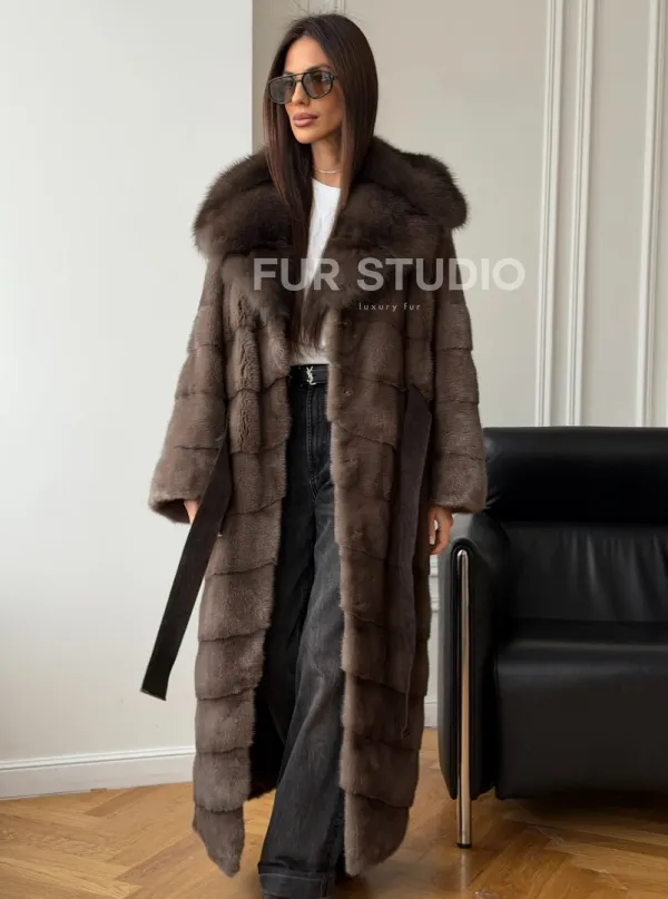 Мех данной шубы аукционная норка, цвет коричневый. Предлагается в размерах от 42 до 48. Длина модели 130-135 см, что выгодно подчеркивает фигуру девушек. Эта модель идеально подойдет для девушек и женщин, предпочитающих роскошные натуральные меха.