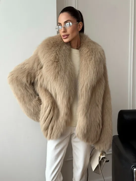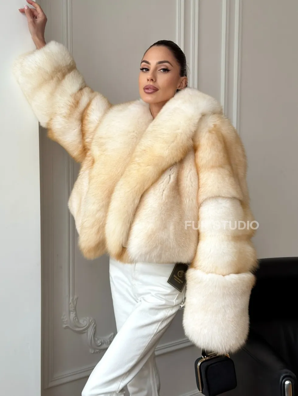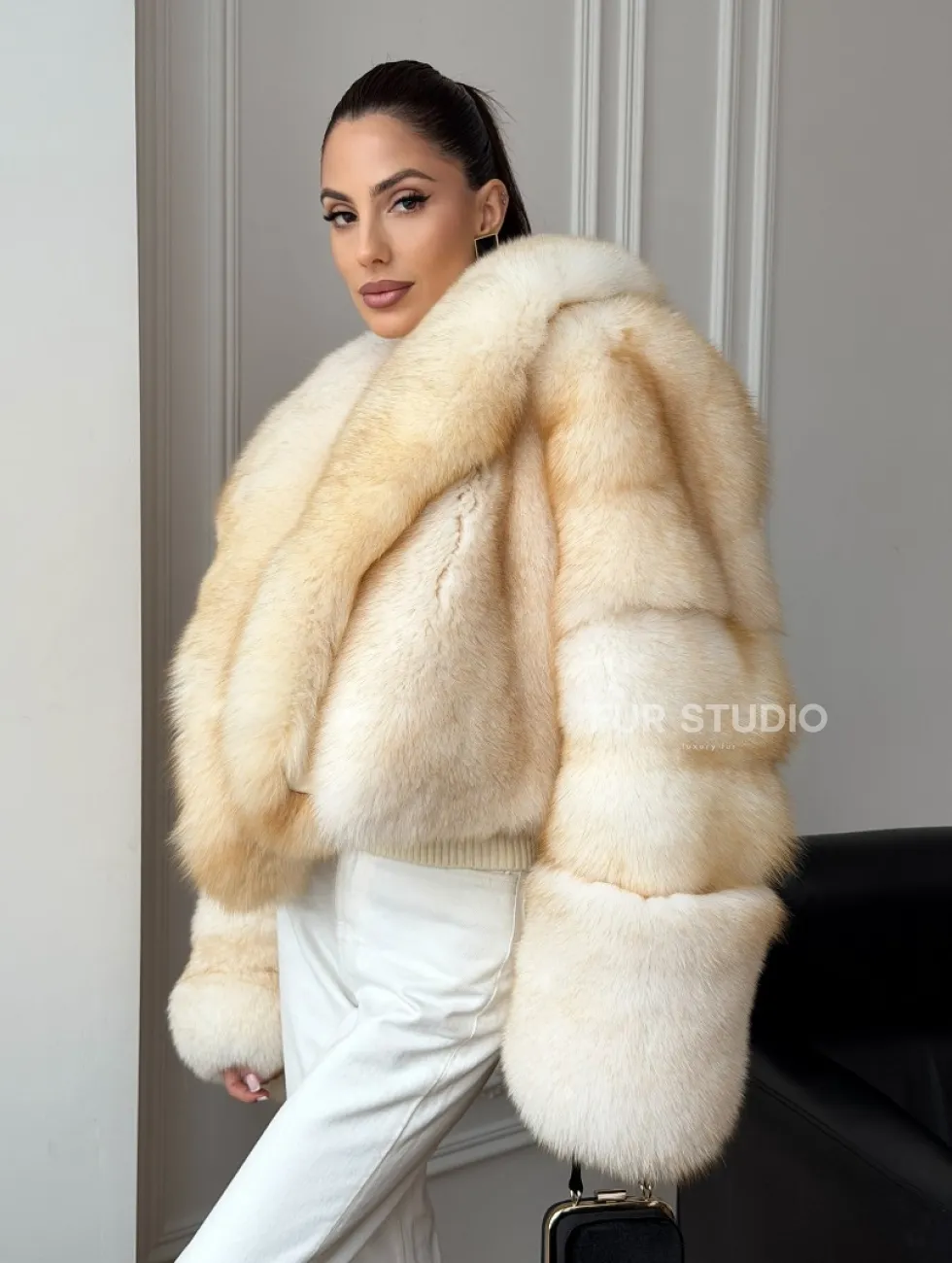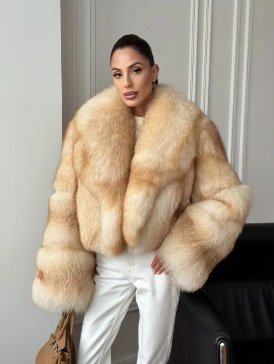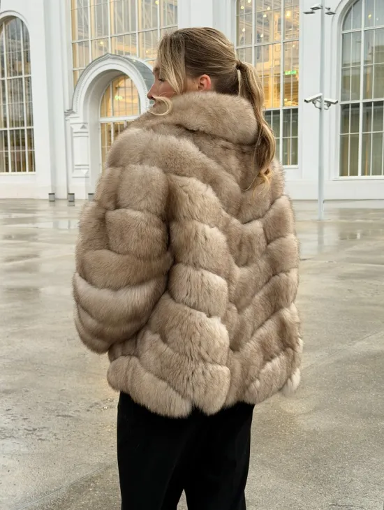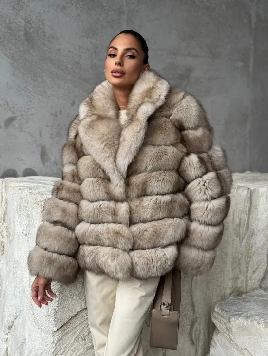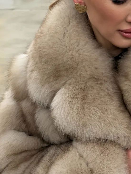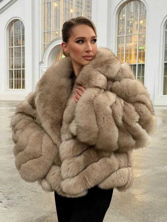 Мех данной шубы финский песец, цвет бежевый. Предлагается в размерах от 40 до 48. Длина модели 45-50 см, что выгодно подчеркивает фигуру девушек. Эта модель идеально подойдет для девушек и женщин, предпочитающих роскошные натуральные меха.