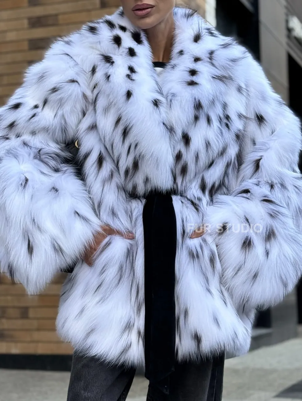 Шуба - Белая лиса с вшитыми пятнами из рыси PREMIUM качество, фасон «летучая мышь» легкая и стильная, созданная специально для уверенной в сете активной роскошной женщины. Даже в длине до середины бедра шуба из лисы подарит уют и тепло в любую погоду: в ней комфортно прогуливаться в морозные и ветреные дни, причем не только от такси до ресторана.