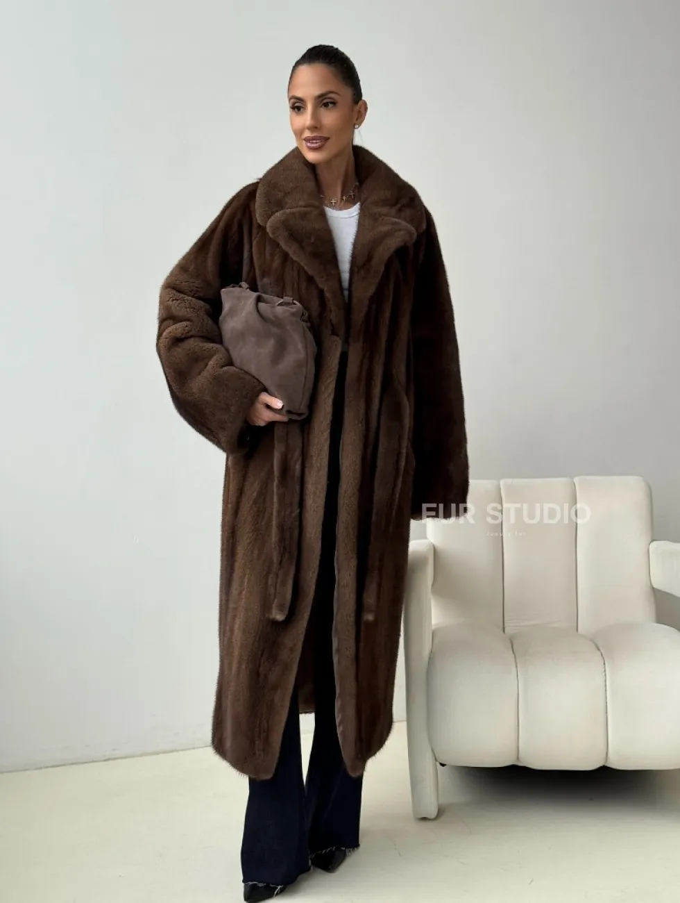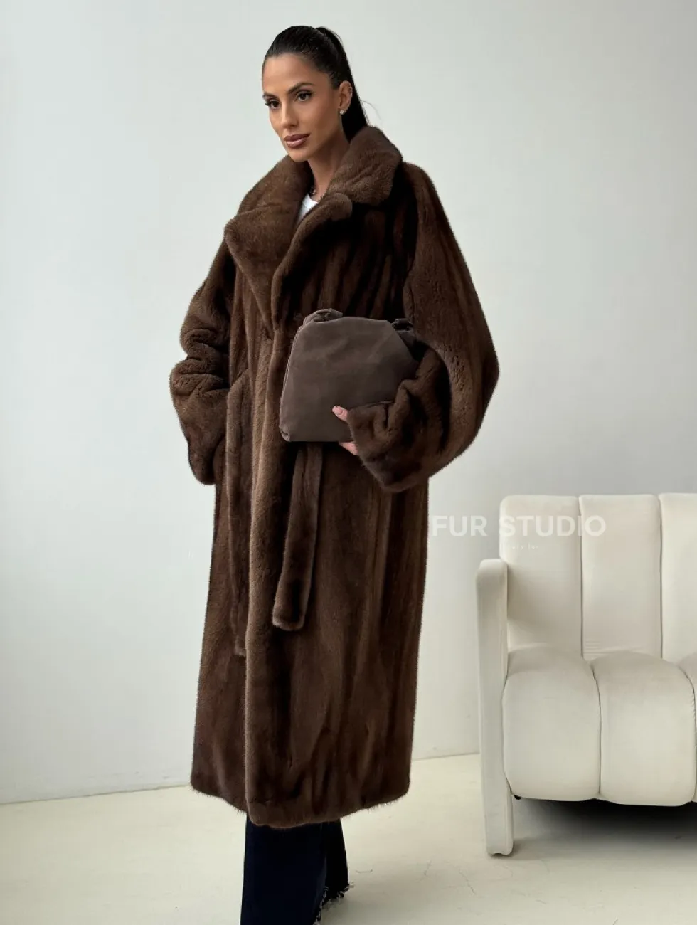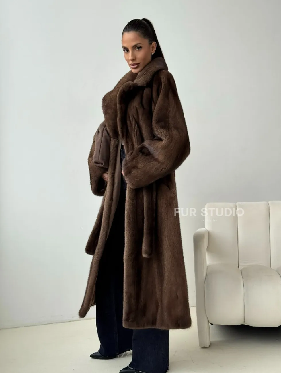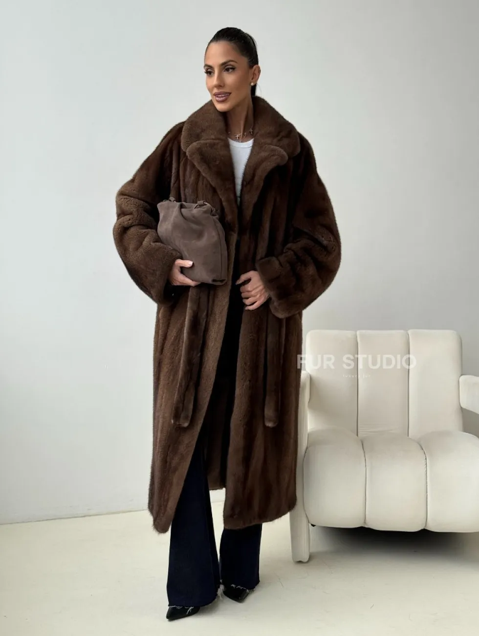 Мех данной шубы аукционная норка , цвет коричневый. Предлагается в размерах от 42 до 54. Длина модели 115-120 см, что выгодно подчеркивает фигуру девушек. Эта модель идеально подойдет для девушек и женщин, предпочитающих роскошные натуральные меха.