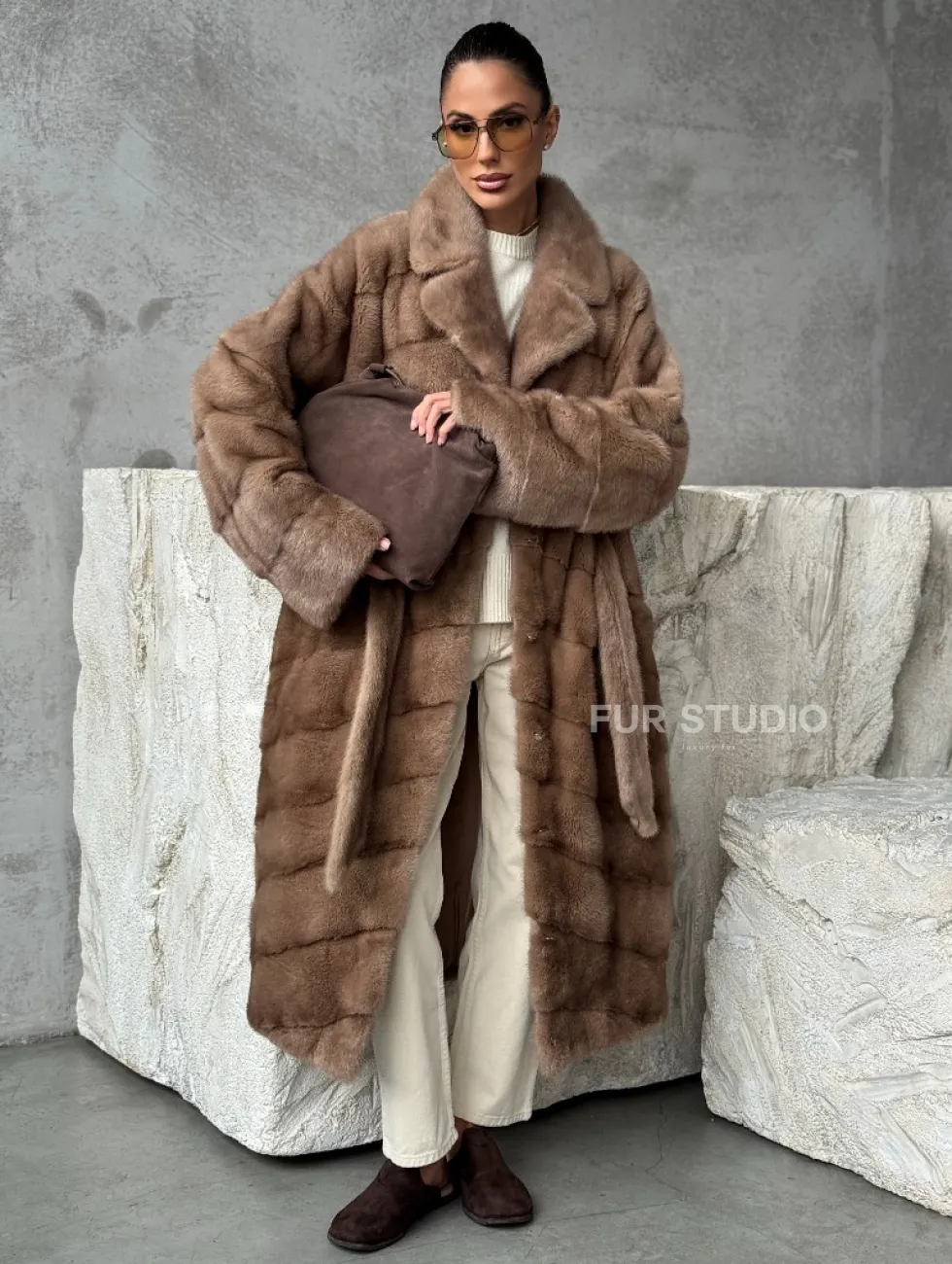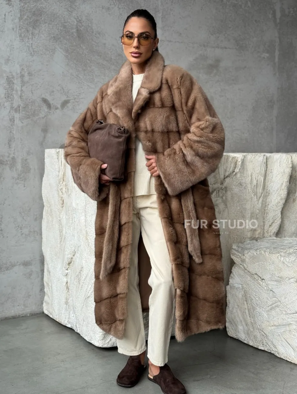Мех данной шубы аукционная норка , цвет бежевый. Предлагается в размерах от 46 до 54. Длина модели 115-120 см, что выгодно подчеркивает фигуру девушек. Эта модель идеально подойдет для девушек и женщин, предпочитающих роскошные натуральные меха.