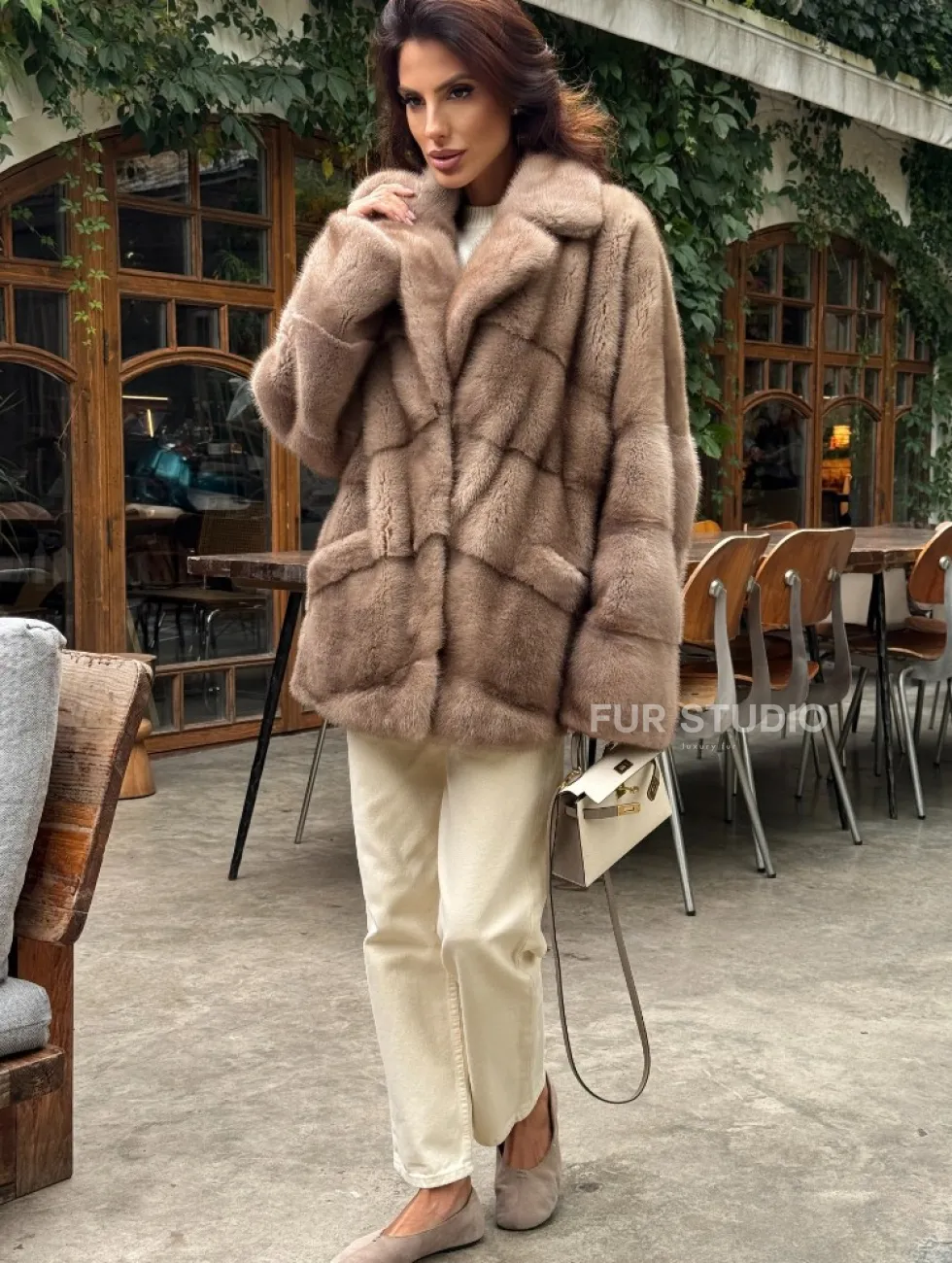 Мех данной шубы аукционная норка, цвет бежевый. Предлагается в размерах от 42 до 50. Длина модели 70-75 см , что выгодно подчеркивает фигуру девушек. Эта модель идеально подойдет для девушек и женщин, предпочитающих роскошные натуральные меха.