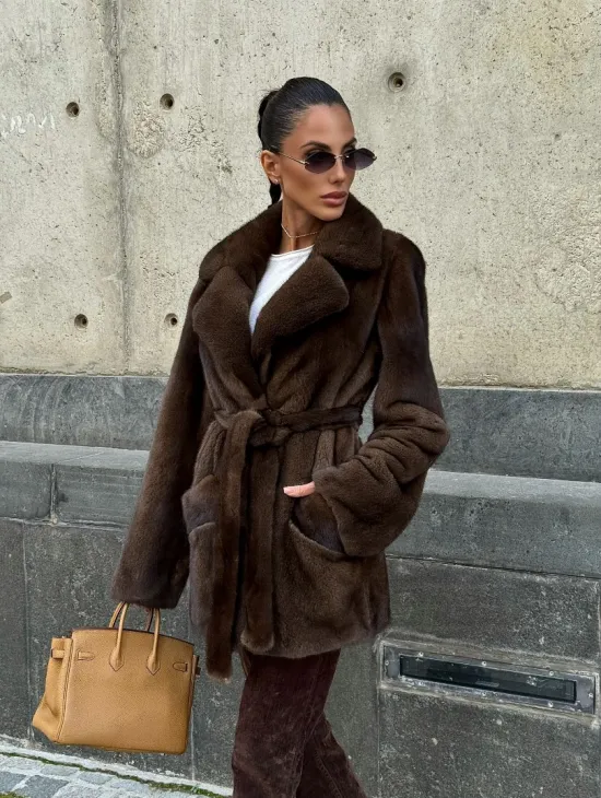Мех данной шубы аукционная норка , цвет коричневый. Предлагается в размерах от 42 до 48. Длина модели 75-80 см, что выгодно подчеркивает фигуру девушек. Эта модель идеально подойдет для девушек и женщин, предпочитающих роскошные натуральные меха.