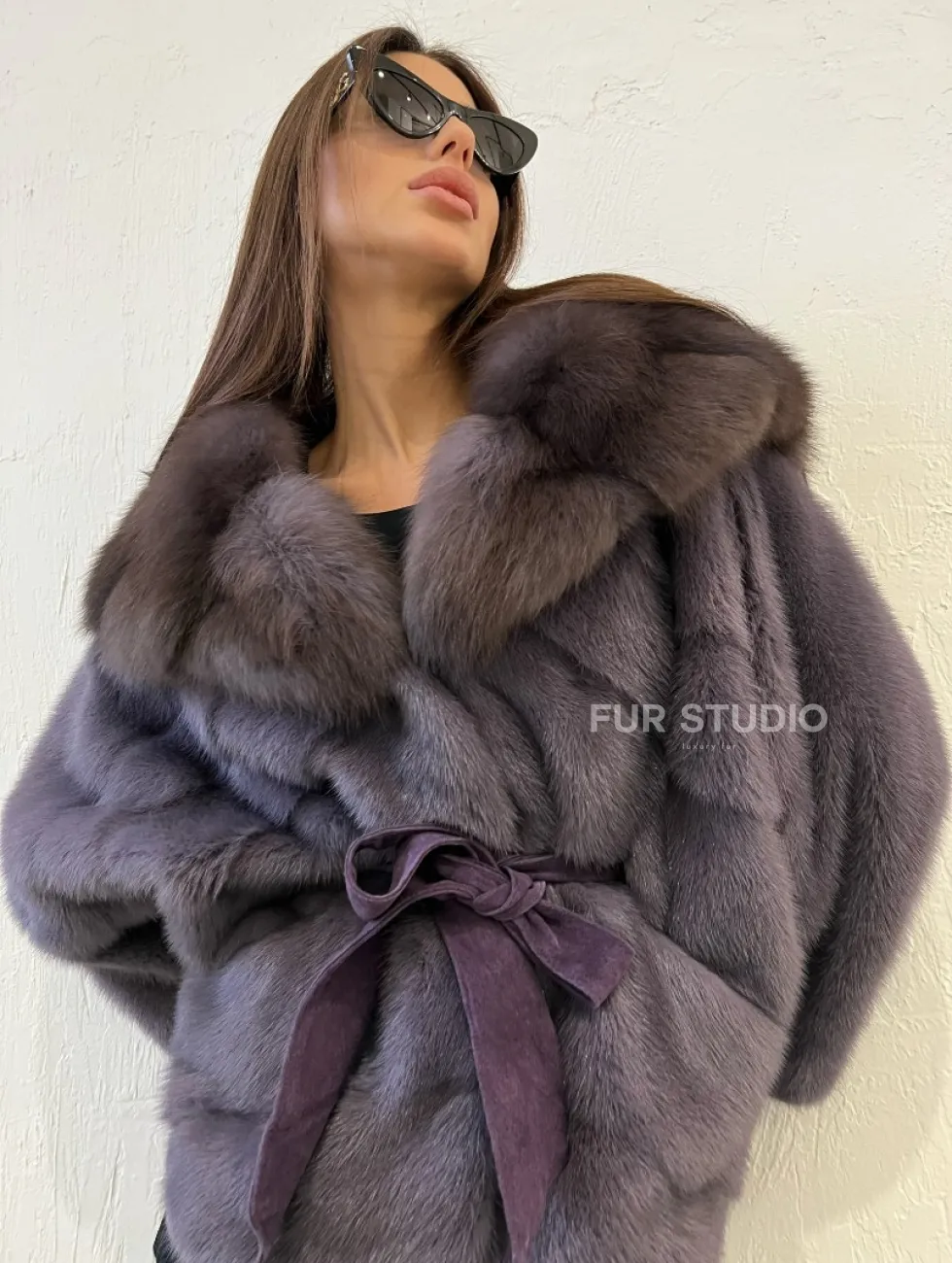 Шикарный капюшон из куницы сохранит прическу и не даст голове замерзнуть в холодное время года. Стильный пояс подчеркнет женственность фигуры и создаст гармоничный образ. Модель подойдет к любому гардеробу, отлично сочетается с вечерним нарядом. Купить шубу норковую - пончо с капюшоном куницы цвет лаванда могут девушки, которые знают толк в моде и любят выглядеть дорого.