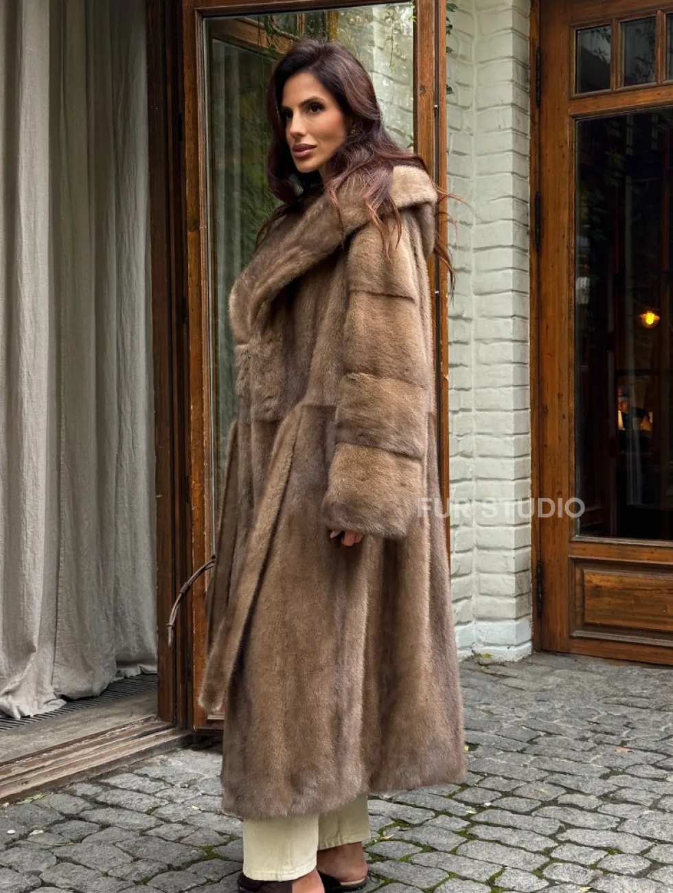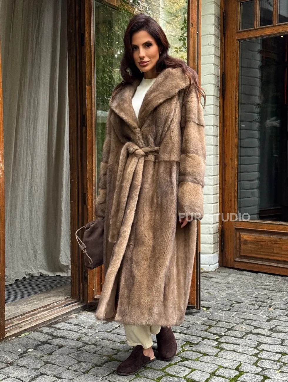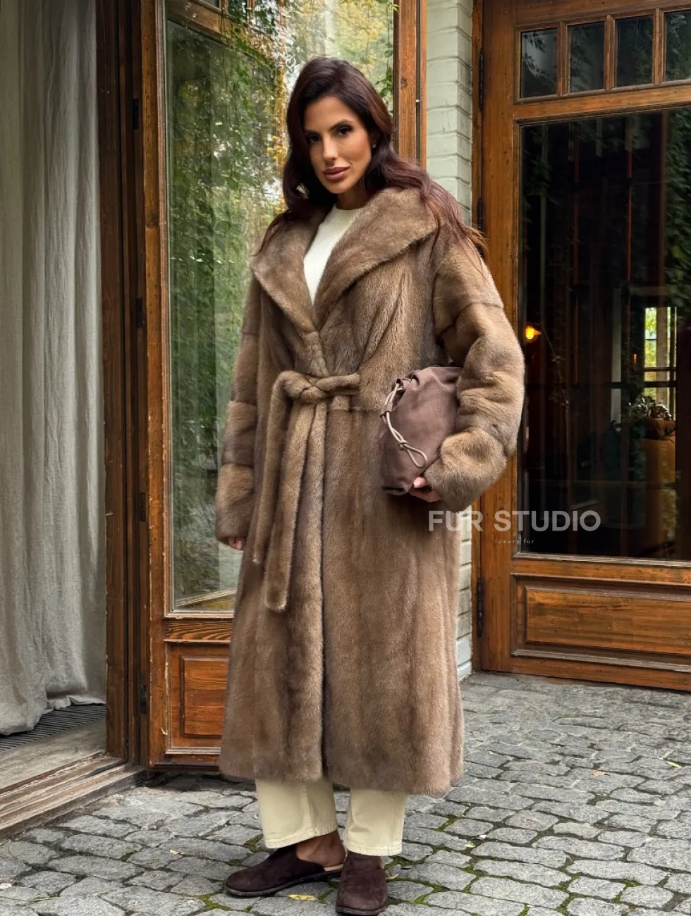 Мех данной шубы аукционная норка, цвет бежевый. Предлагается в размерах от 42 до 54. Длина модели 115-120 см, что выгодно подчеркивает фигуру девушек. Эта модель идеально подойдет для девушек и женщин, предпочитающих роскошные натуральные меха.