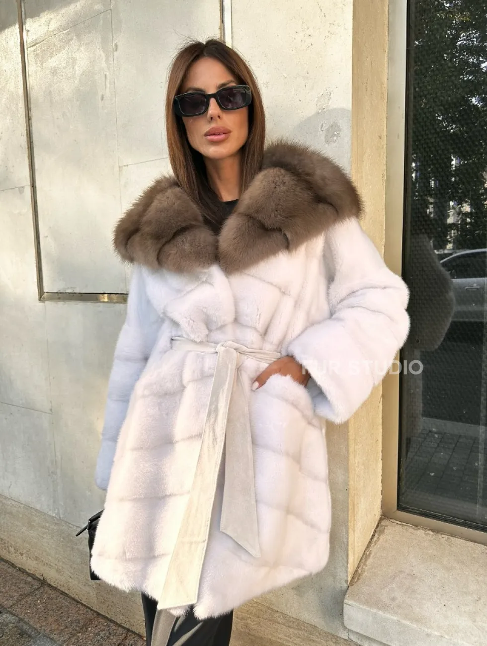 Модель выглядит дорого и нарядно. Беспроигрышный вариант для настоящих модниц, которые любят приковывать взгляды. Длина прекрасно подходит под любой гардероб. Купить белую норковую шубу с капюшоном из меха куницы может только женщина, которая умеет любить себя.