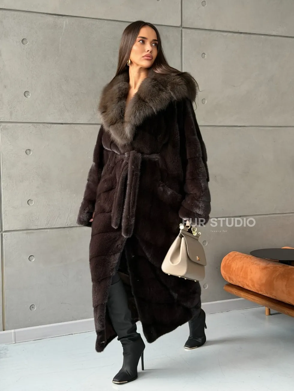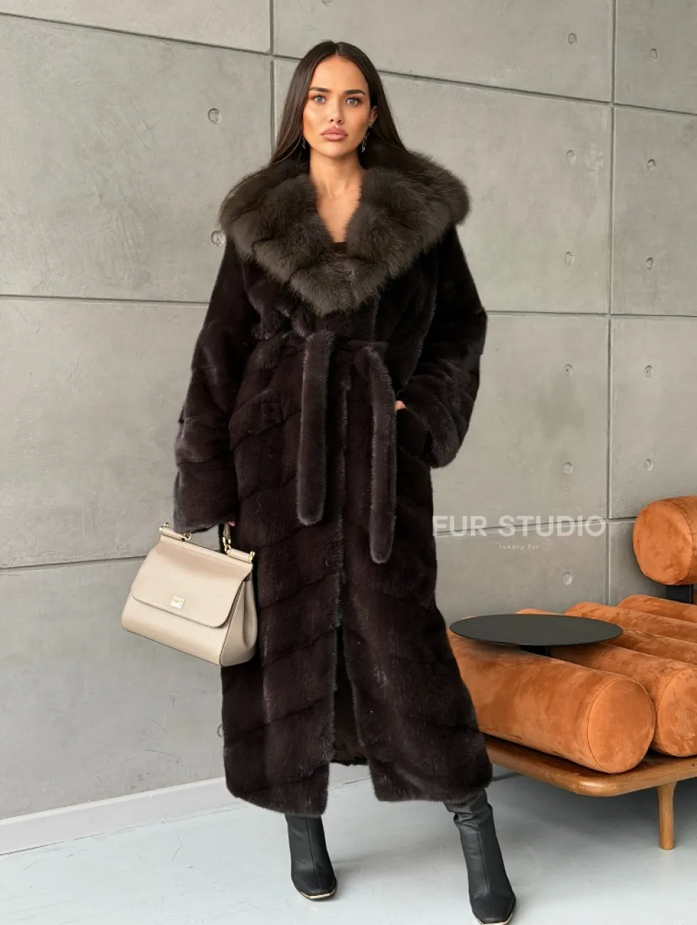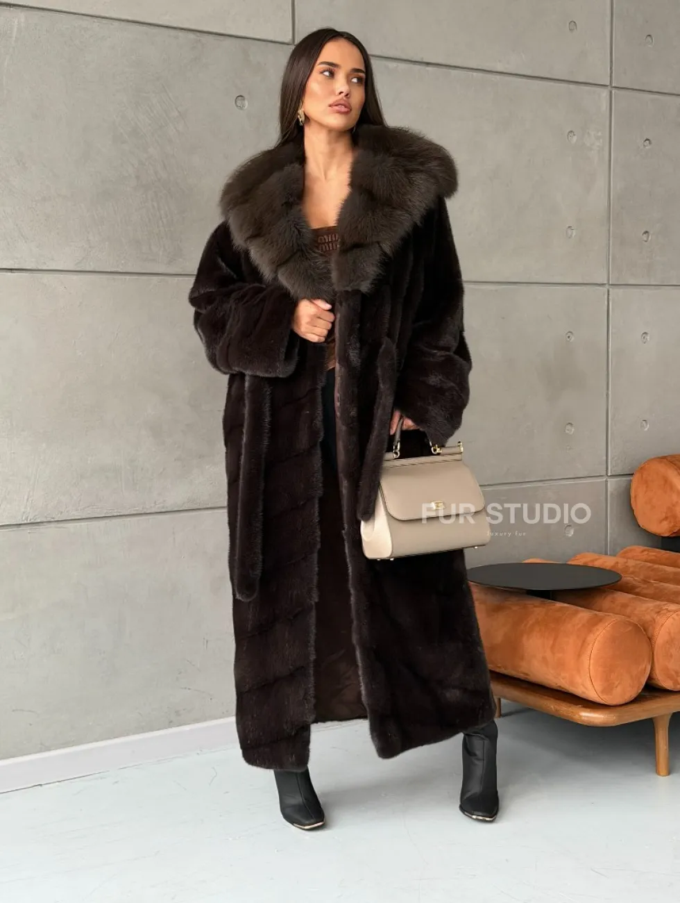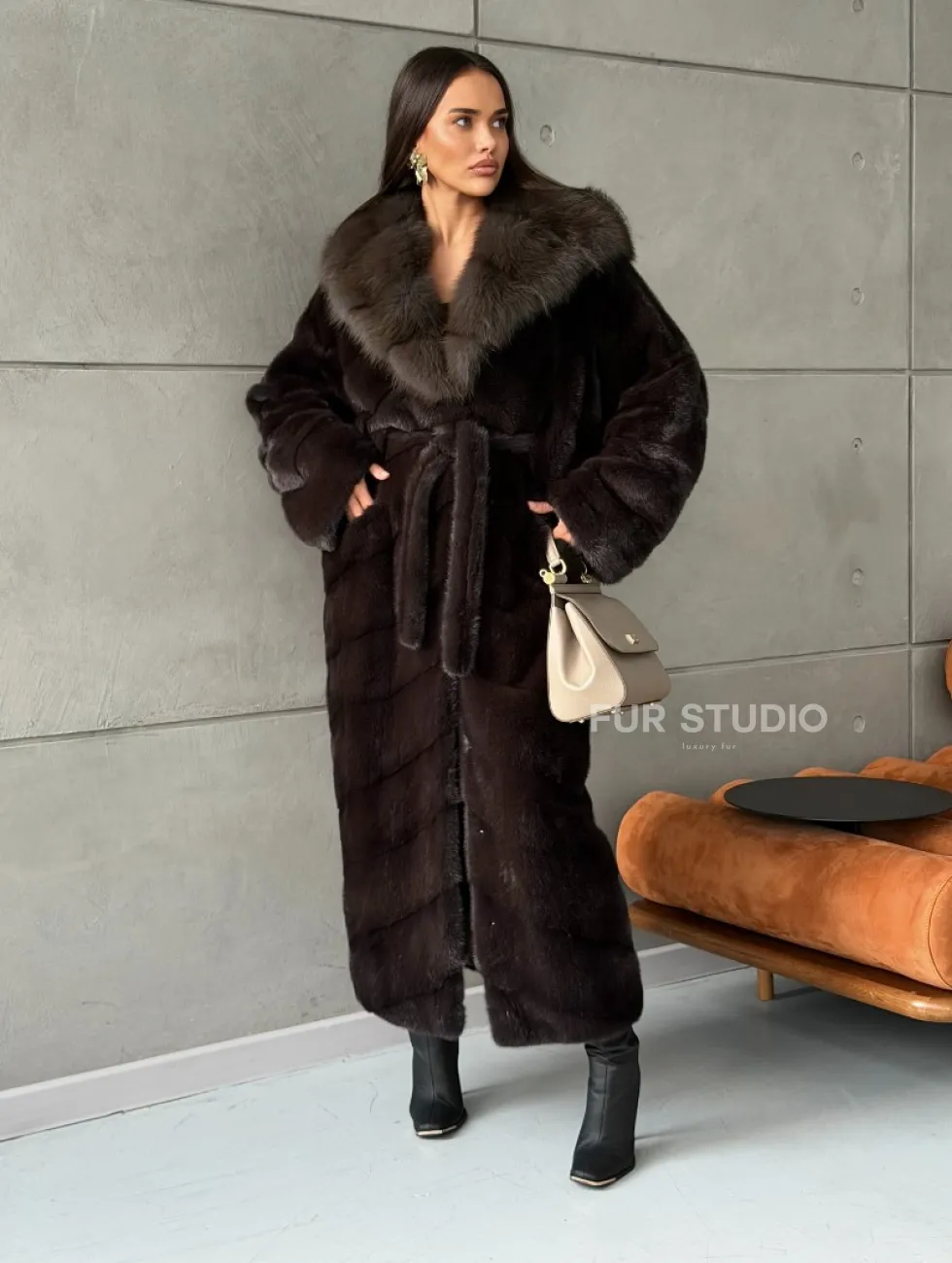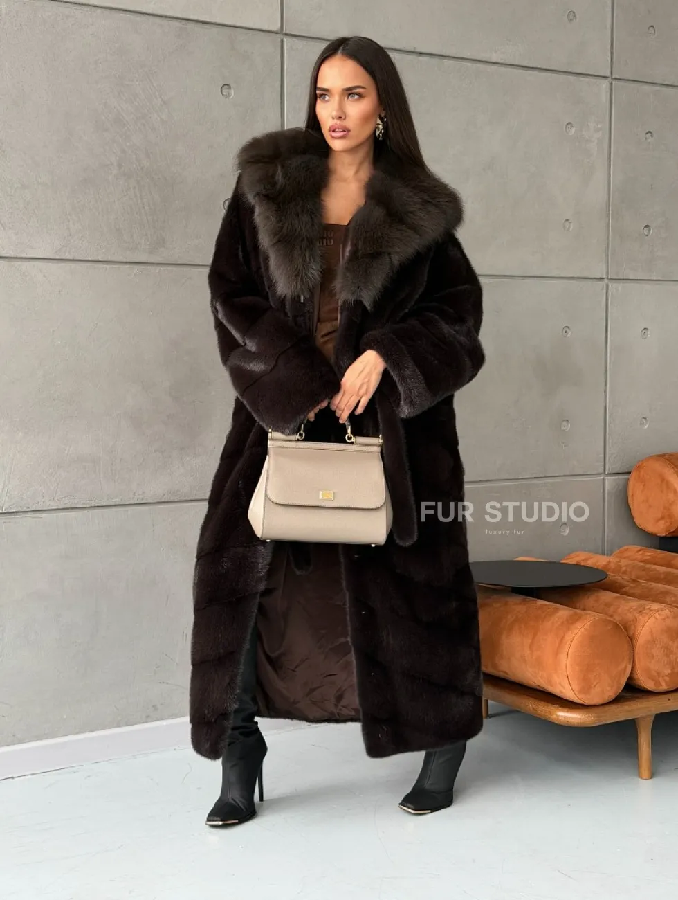 Мех данной шубы аукционная норка, цвет коричневый. Предлагается в размерах от 42 до 48. Длина модели 125-130 см, что выгодно подчеркивает фигуру девушек. Эта модель идеально подойдет для девушек и женщин, предпочитающих роскошные натуральные меха.