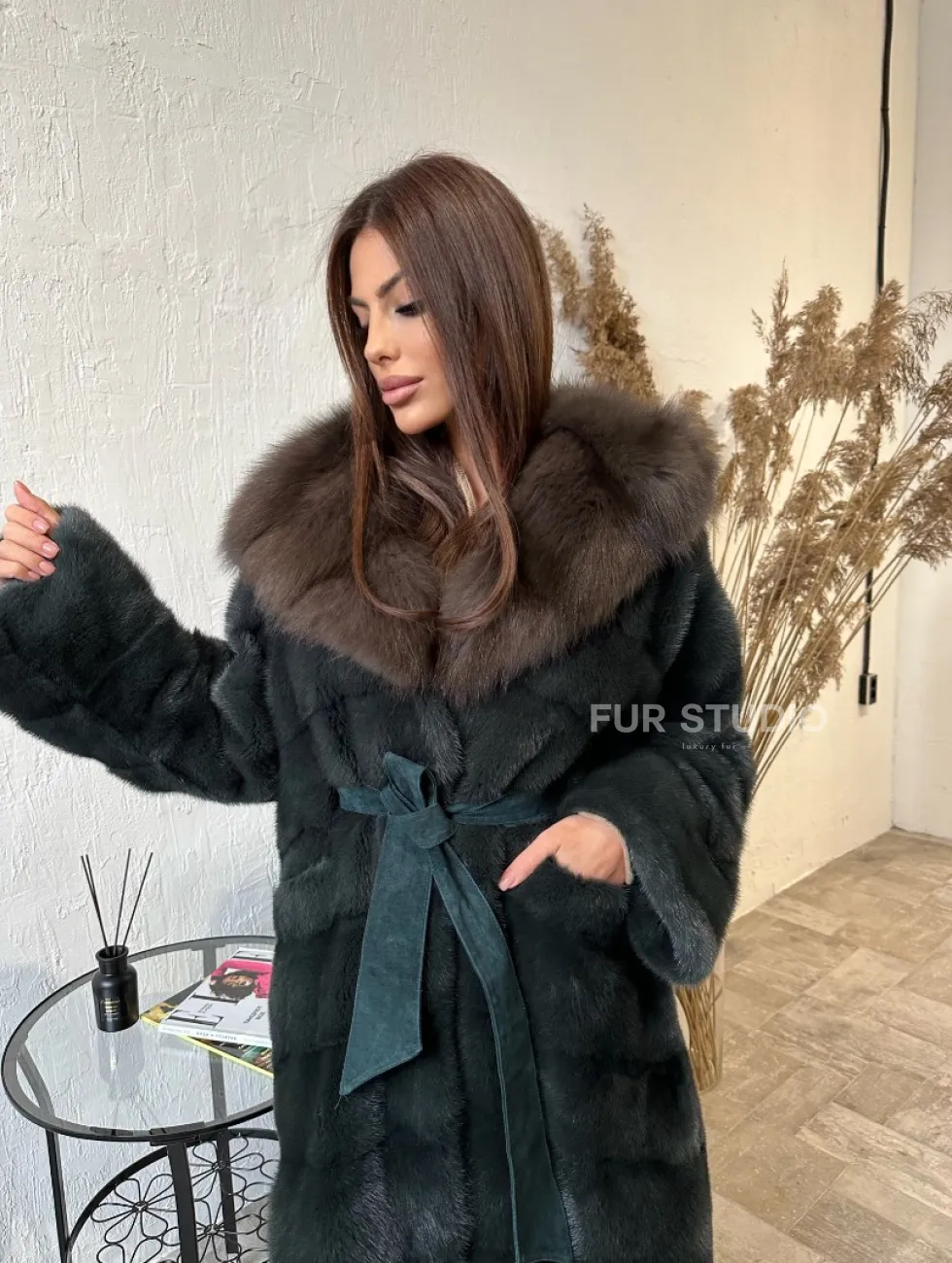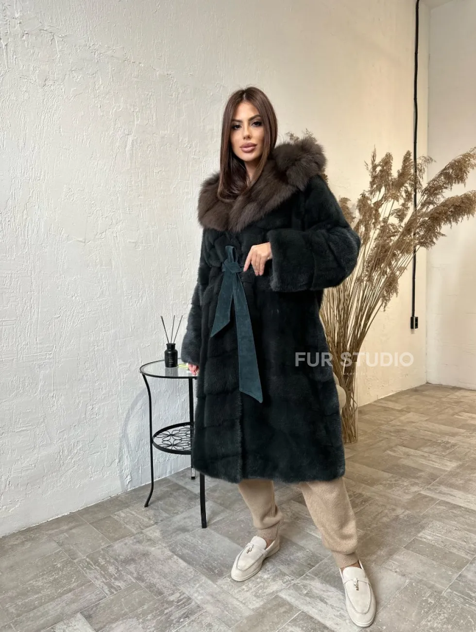 Широкие рукава не сковывают движений, что комфортно при вождении машины. Удобные карманы согреют ручки в холода. Стильный пояс выгодно выделит талию и сделает ее тоньше. Модель сочетается с любым гардеробом: от классического до вечерних нарядов. Купить шубу норковую с капюшоном из меха куницы в цвете малахит могут женщины, которые любят стиль и качество.