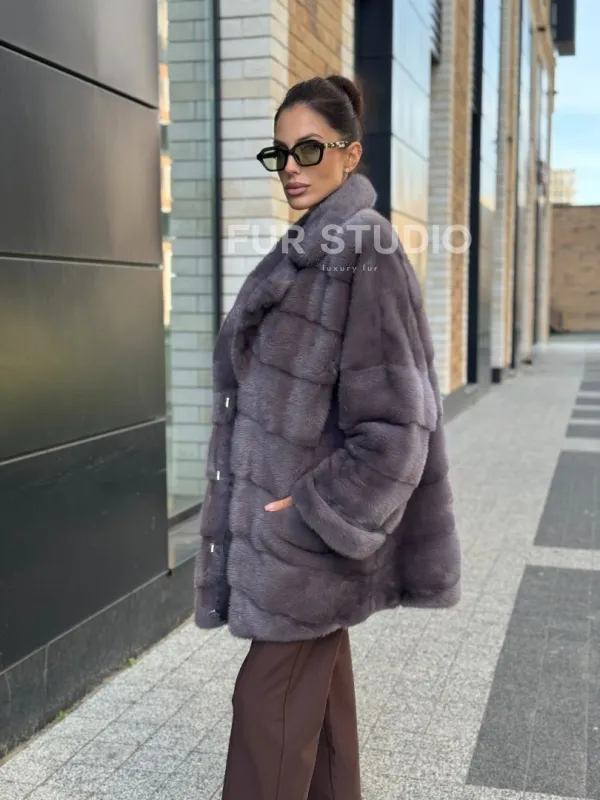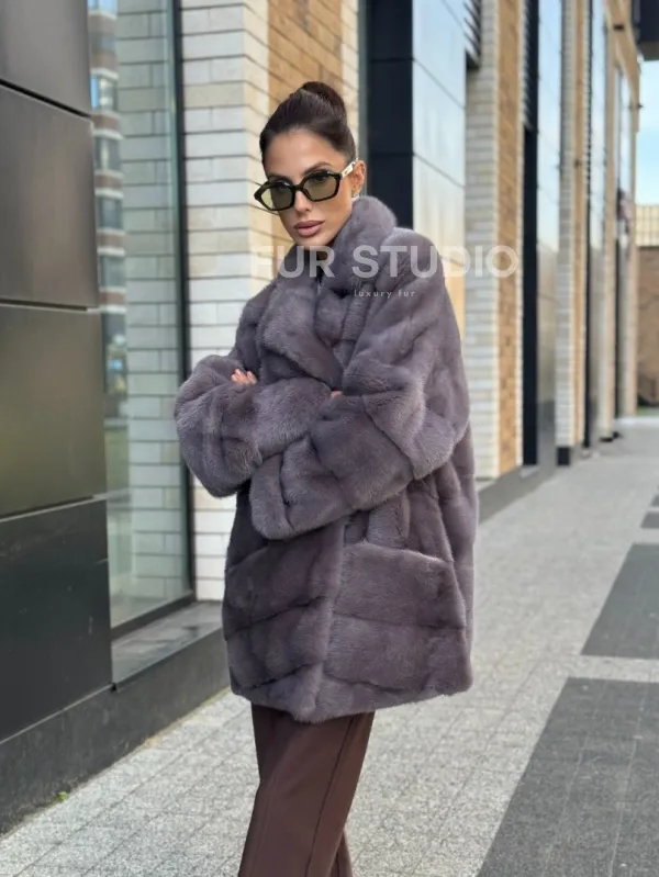 Длинные рукава подчеркнут нежные кисти, а удобные карманы не допустят, чтобы они замерзли. Модель подойдет под базовый гардероб, сочетается с вечерним нарядом. Неординарная сумочка дополнит образ, и вы будете выглядеть, как с обложки журнала. Купить короткую шубу из меха норки с воротником из меха куницы цвет лаванда могут только девушки, которые знают, что хотят от жизни.