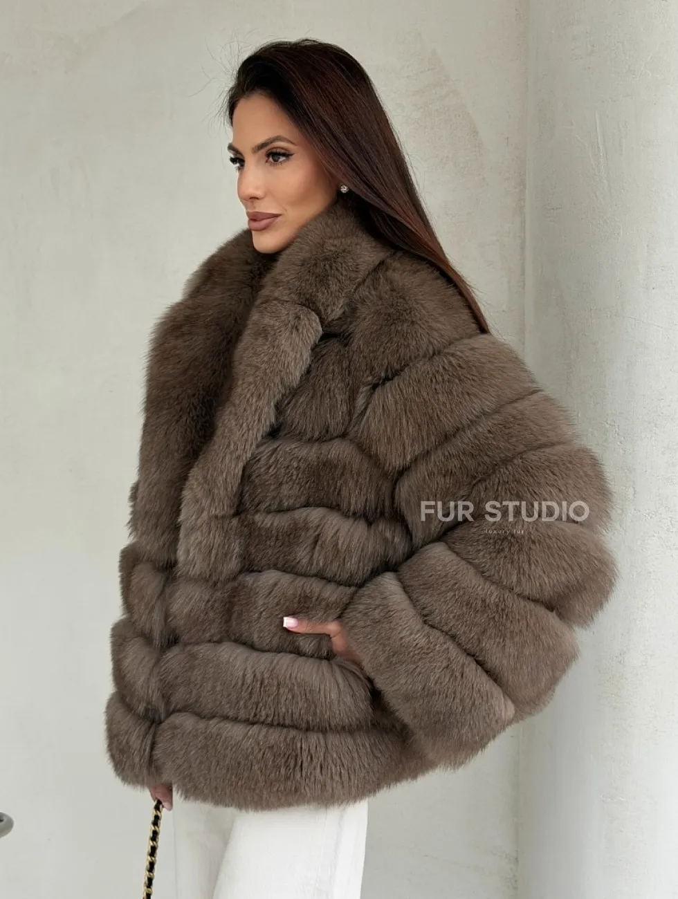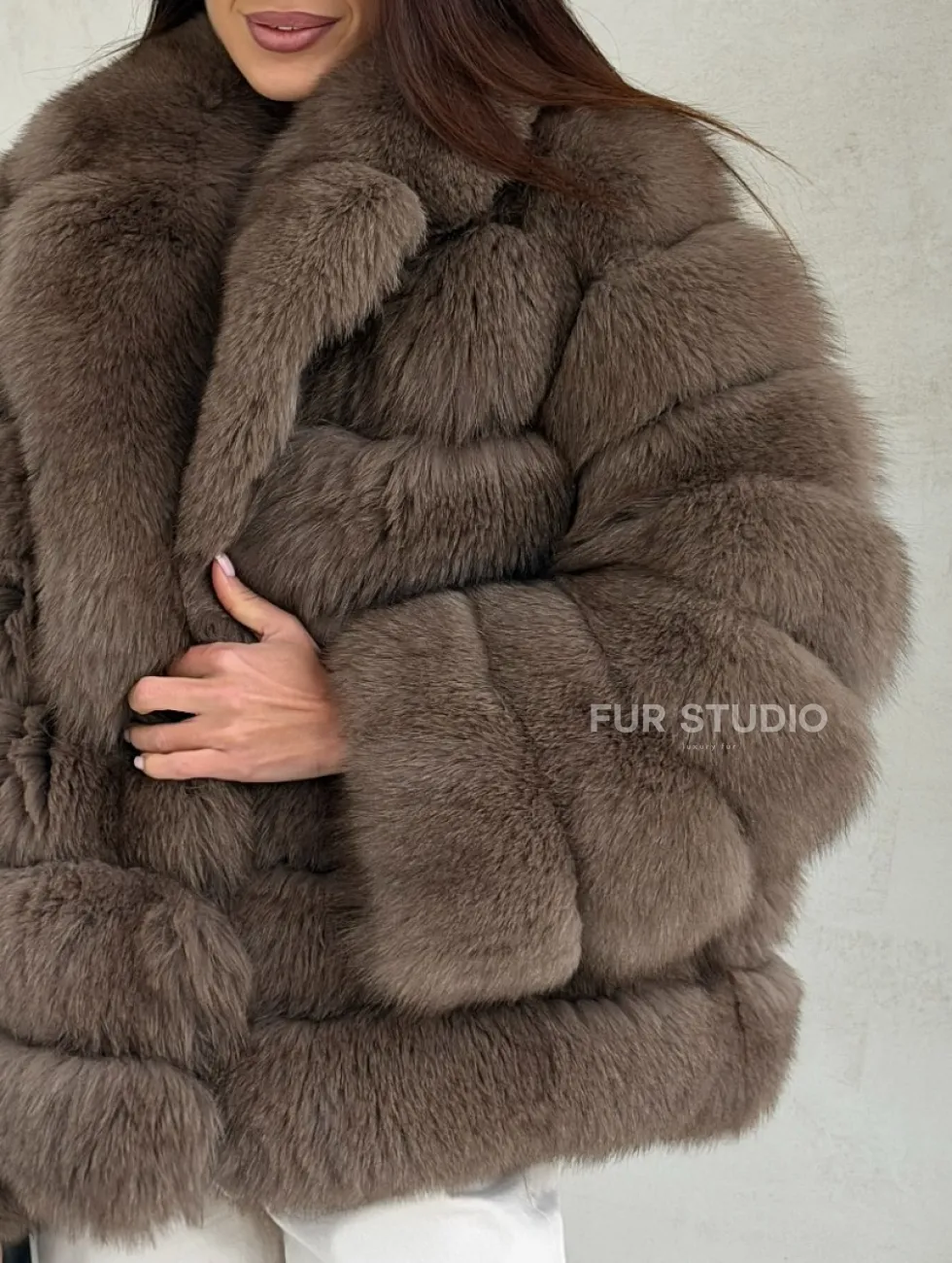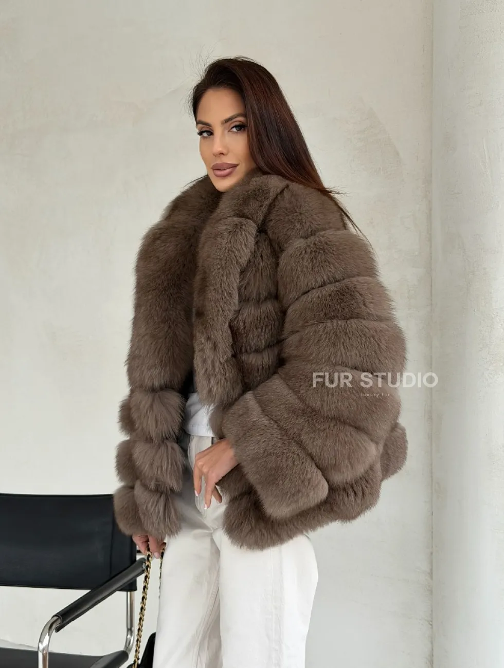 Мех данной шубы финский песец, цвет коричневый. Предлагается в размерах от 42 до 48. Длина модели 60-65 см, что выгодно подчеркивает фигуру девушек. Эта модель идеально подойдет для девушек и женщин, предпочитающих роскошные натуральные меха.
