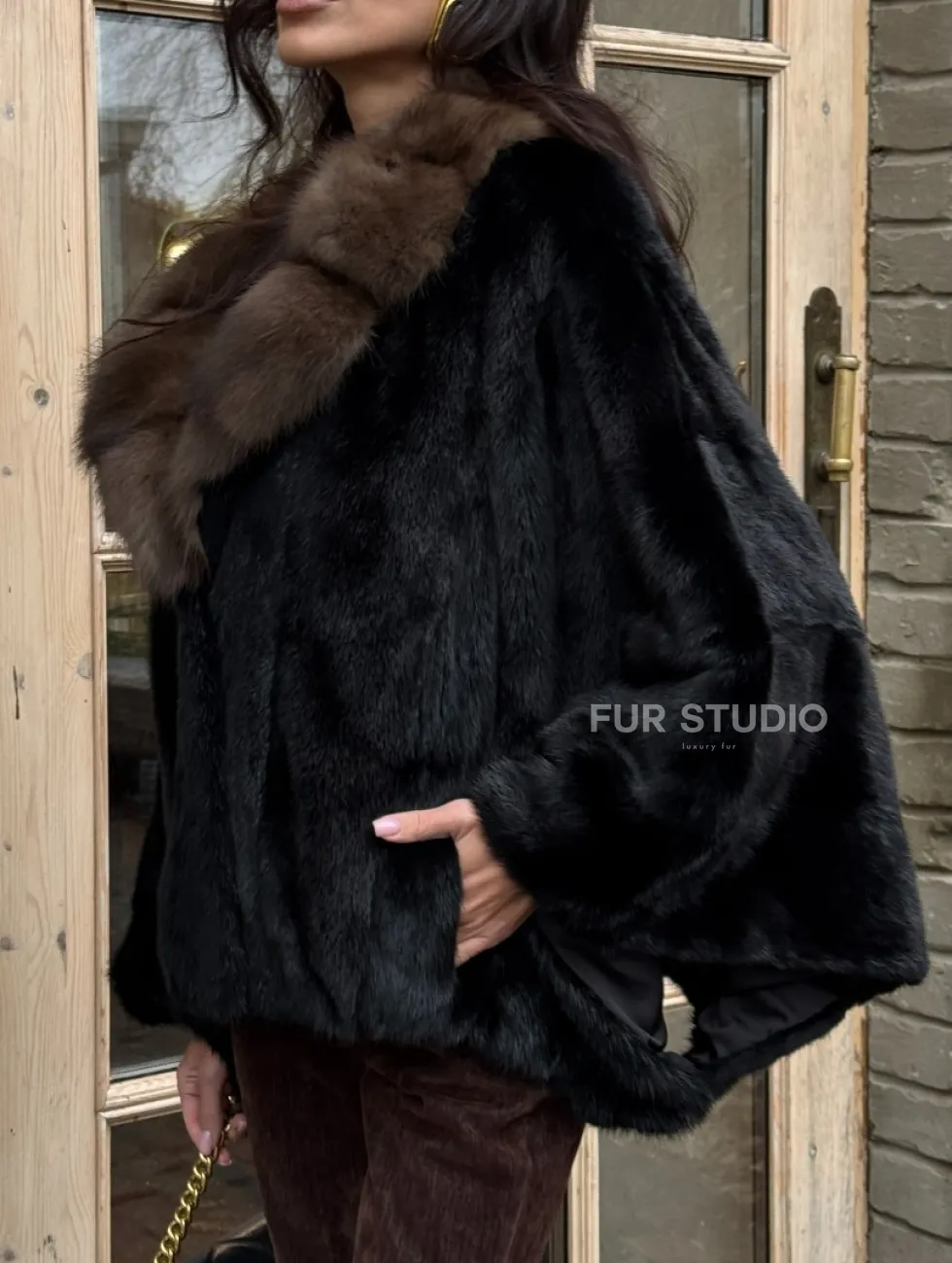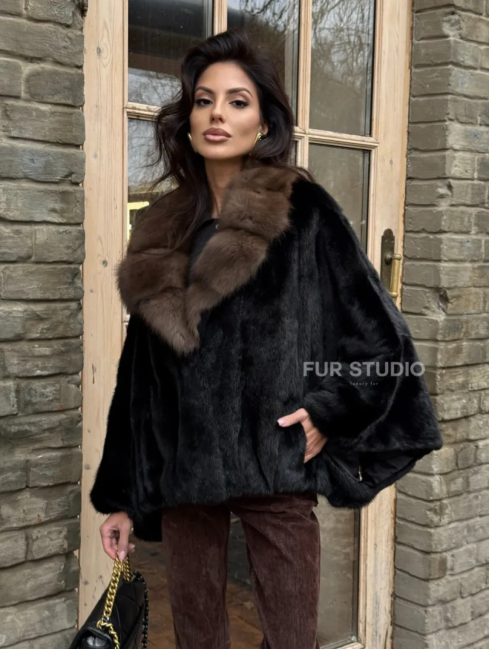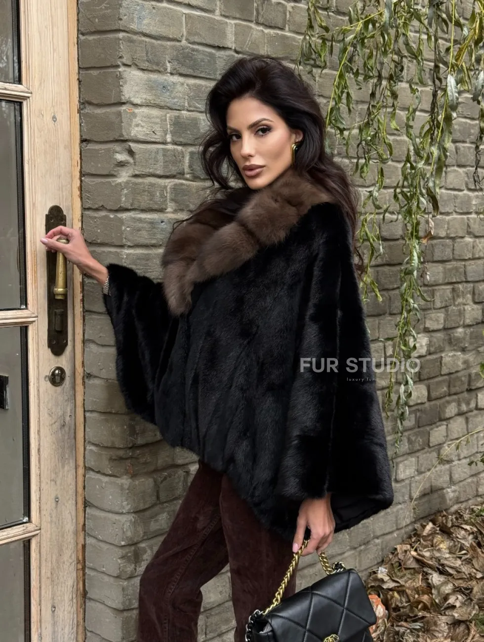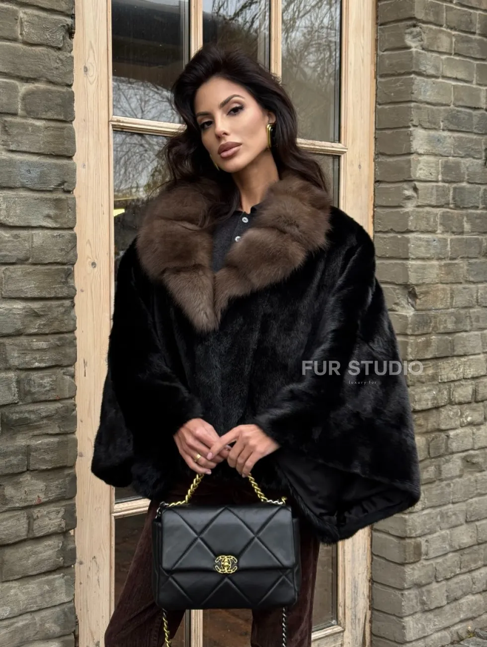 Шуба - пончо из аукционной норки Black с воротником из куницы доступна для покупки в нашем шоуруме Furs Studio в Чите. У нас так же есть доставка во все города России. Добавьте немного роскоши в свой гардероб с этой шубой, которая будет служить вам многие годы.