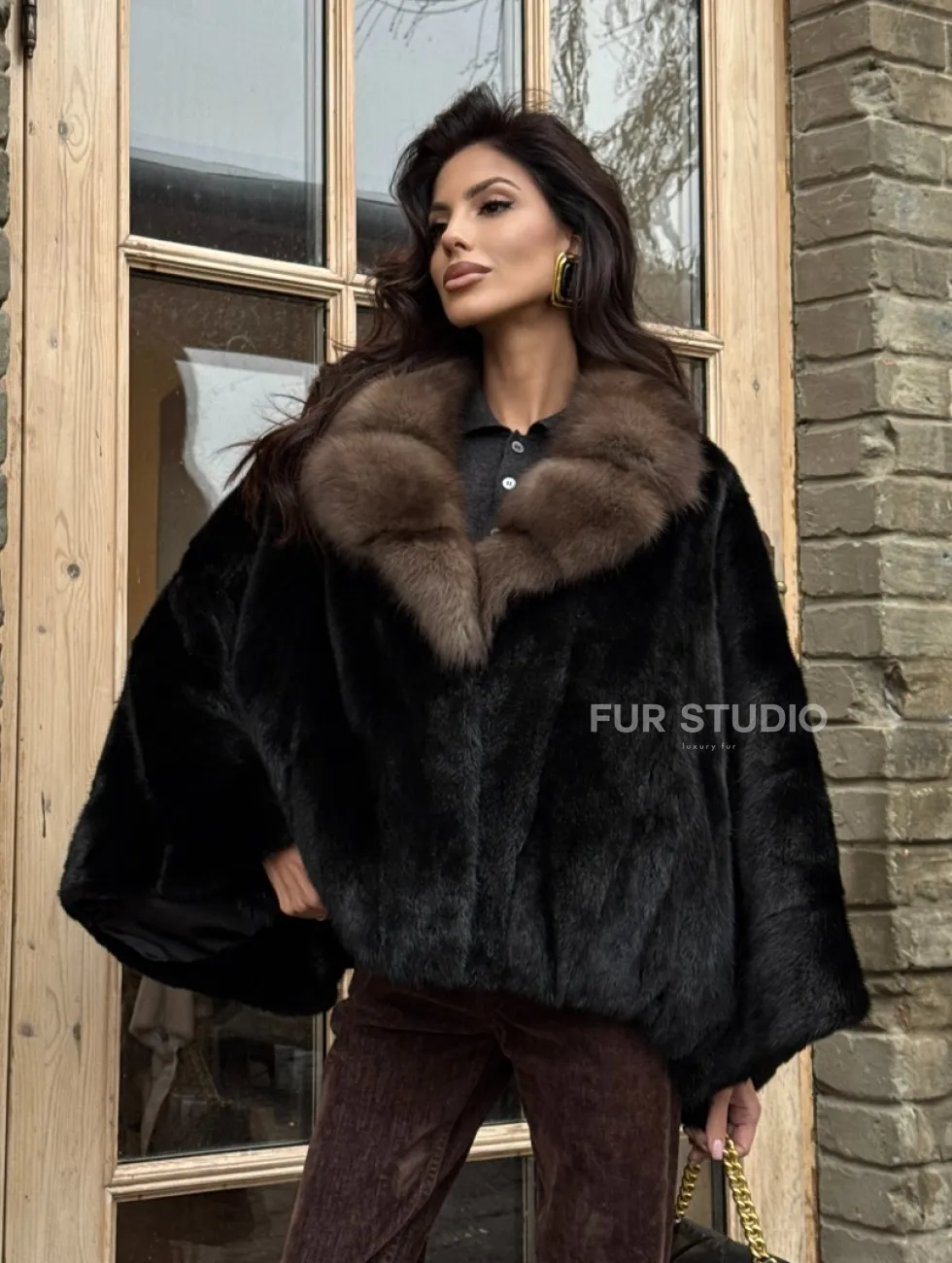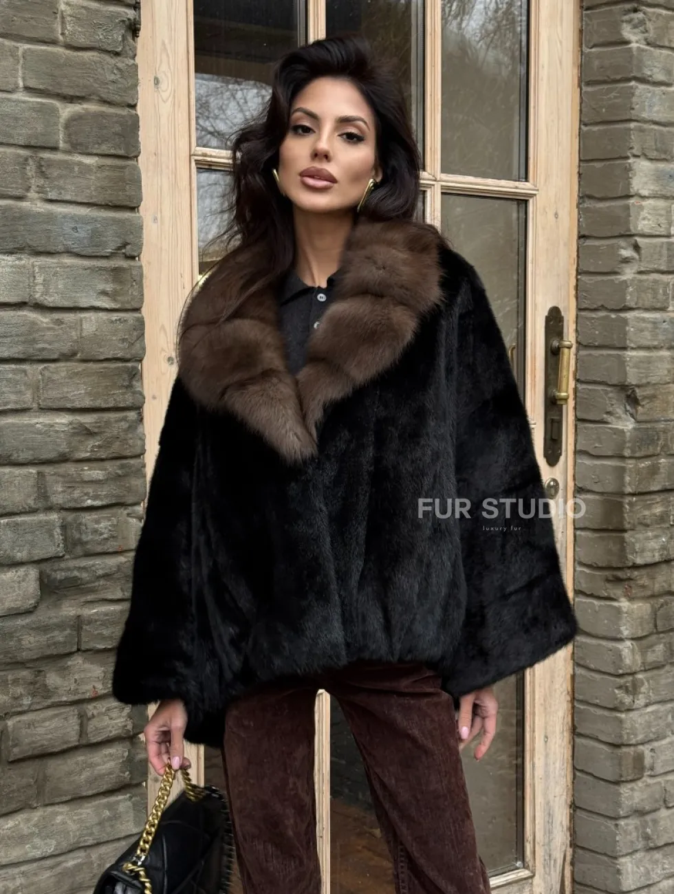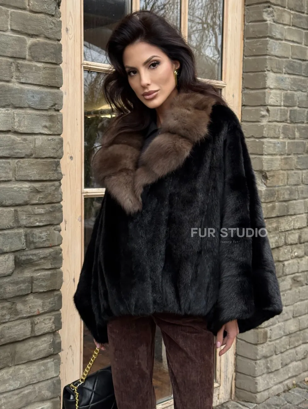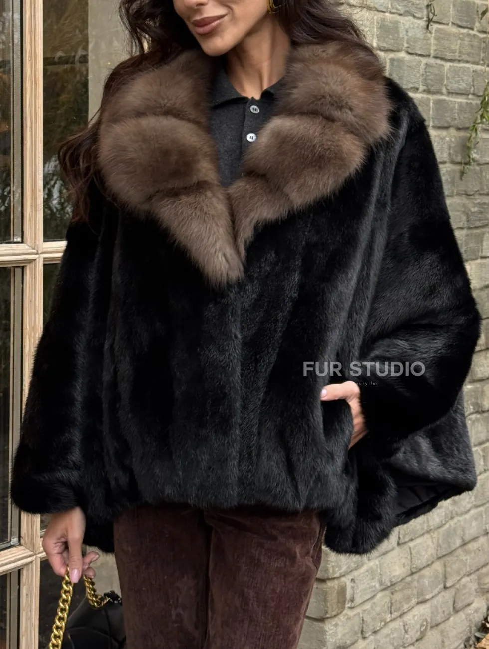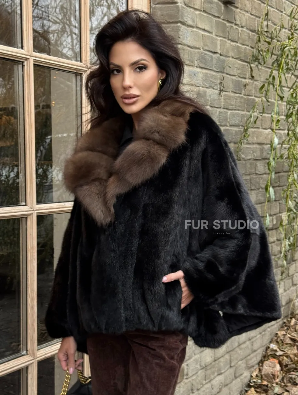 Шуба - пончо из аукционной норки Black с воротником из куницы доступна для покупки в нашем шоуруме Furs Studio в Чите. У нас так же есть доставка во все города России. Добавьте немного роскоши в свой гардероб с этой шубой, которая будет служить вам многие годы.