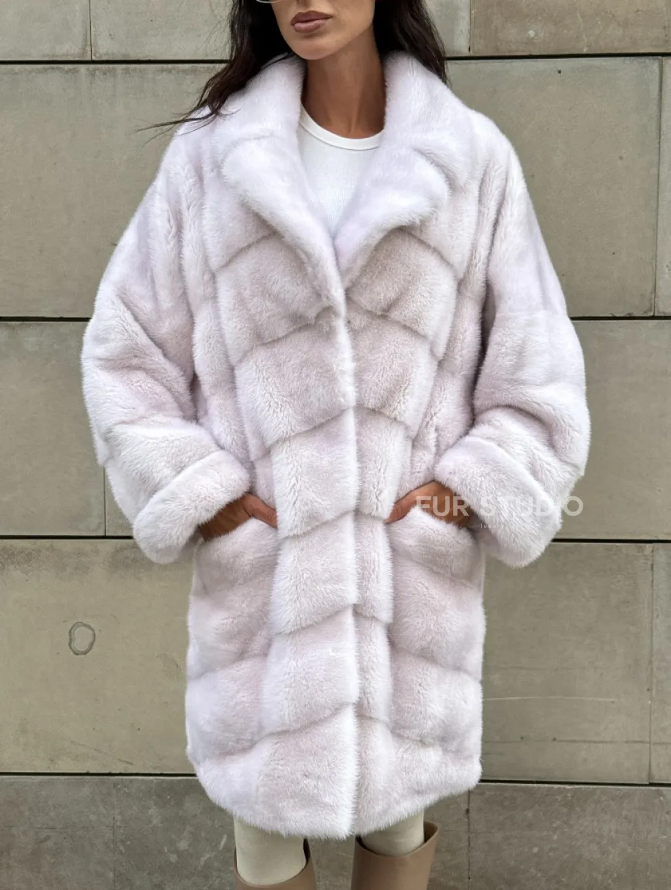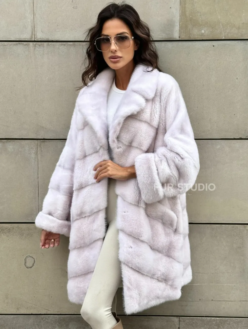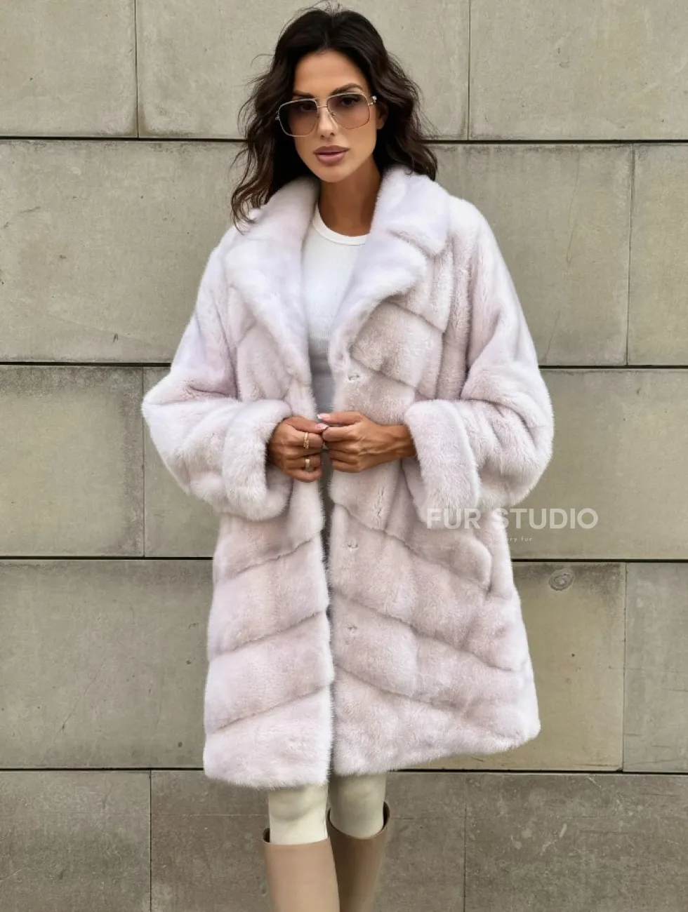 Шуба в диагональной выкладке меха норки с английским воротником - цвет жемчуг доступна для покупки в нашем шоуруме Furs Studio в Чите. У нас так же есть доставка во все города России. Добавьте немного роскоши в свой гардероб с этой шубой, которая будет служить вам многие годы.
