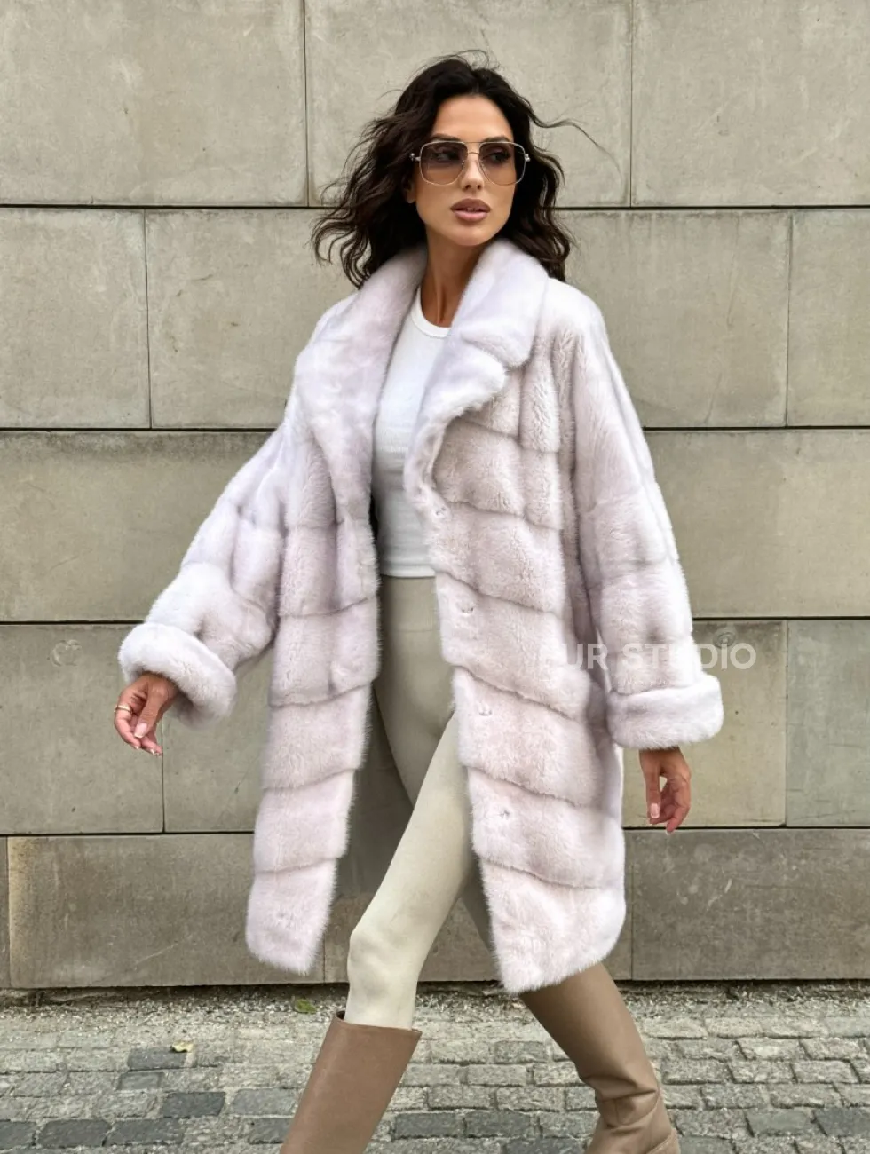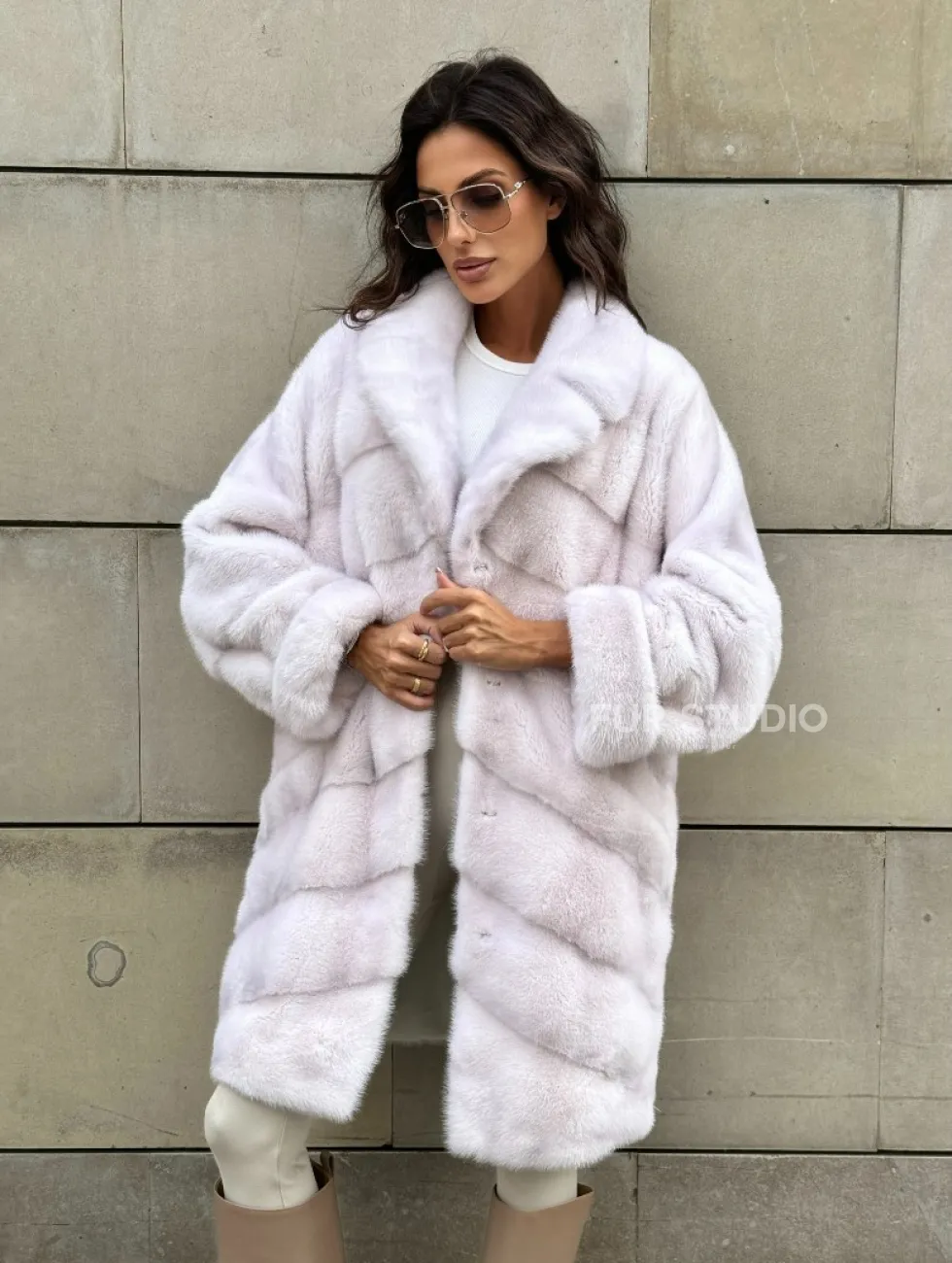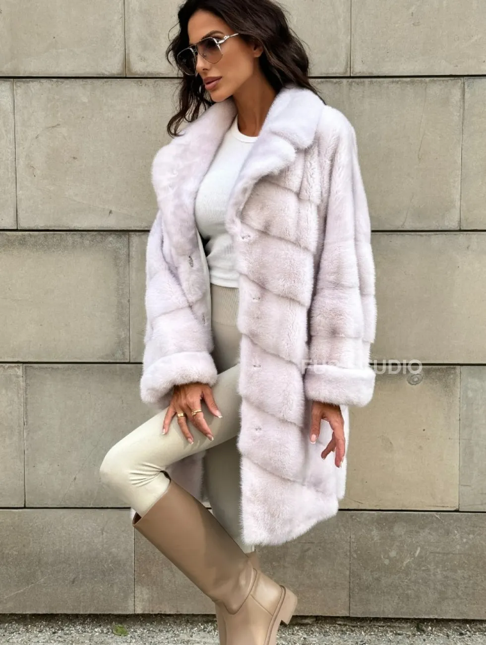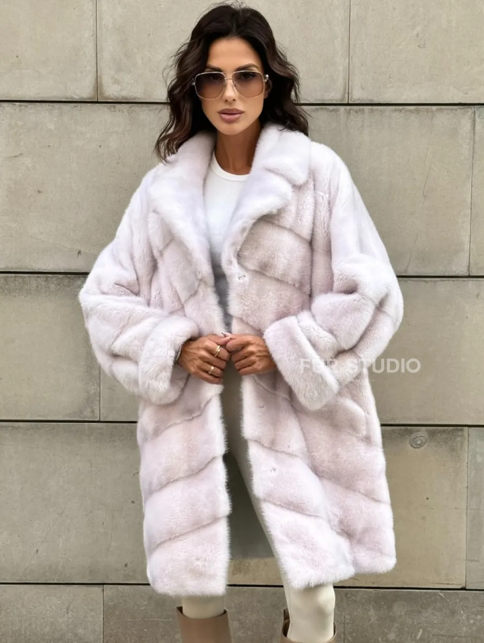 Шуба в диагональной выкладке меха норки с английским воротником - цвет жемчуг доступна для покупки в нашем шоуруме Furs Studio в Чите. У нас так же есть доставка во все города России. Добавьте немного роскоши в свой гардероб с этой шубой, которая будет служить вам многие годы.