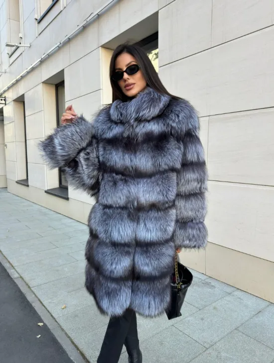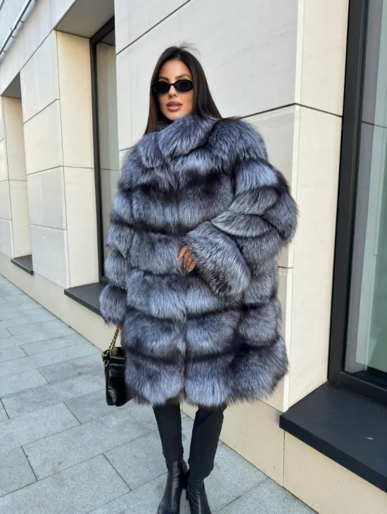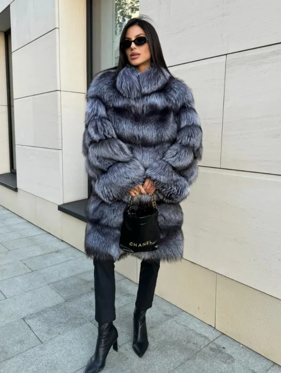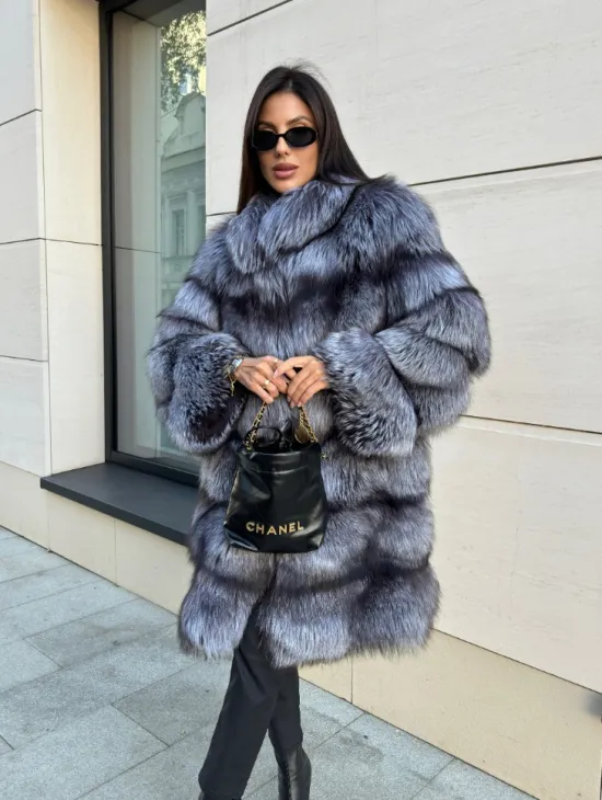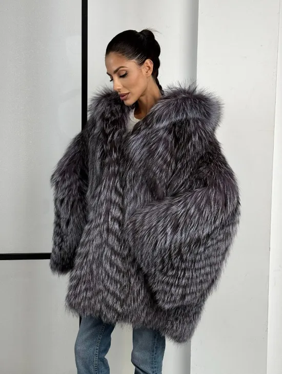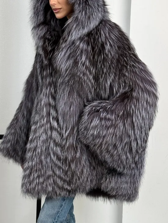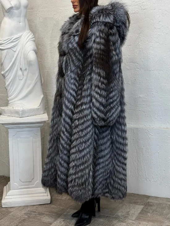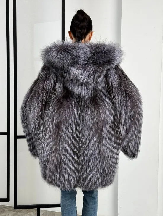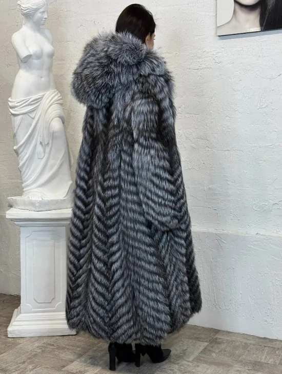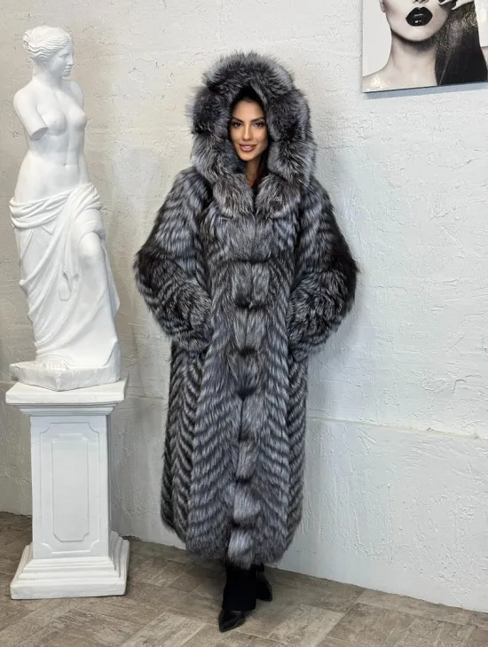 Длинная шуба с капюшоном из натуральной лисы Silver Fox Fur в росшив