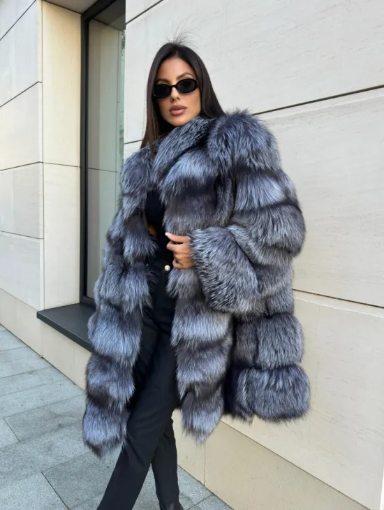 Шуба из меха чернобурки с английским воротником, цельные пластины - серая