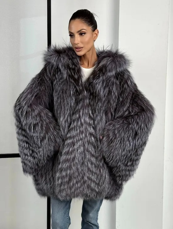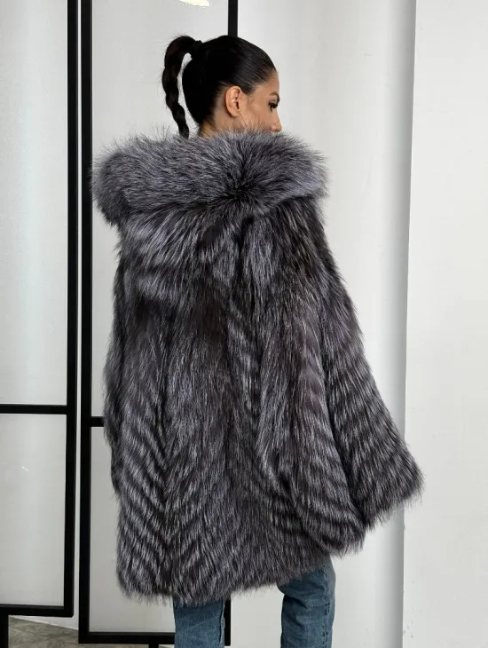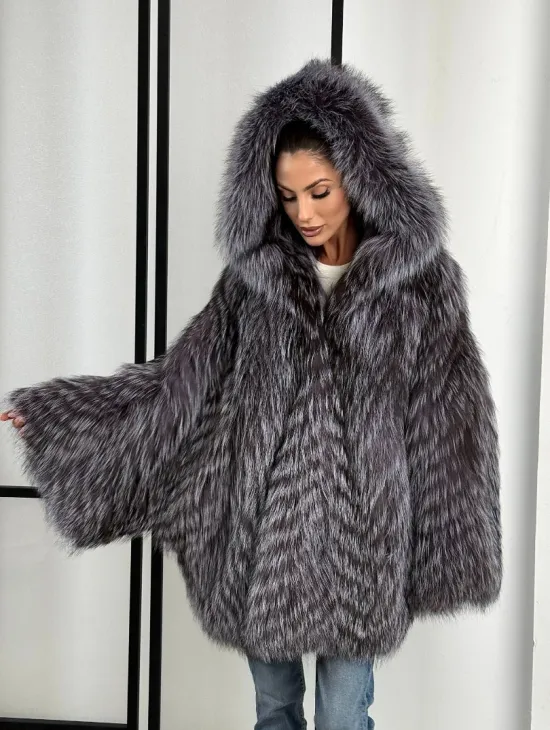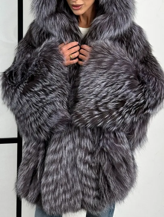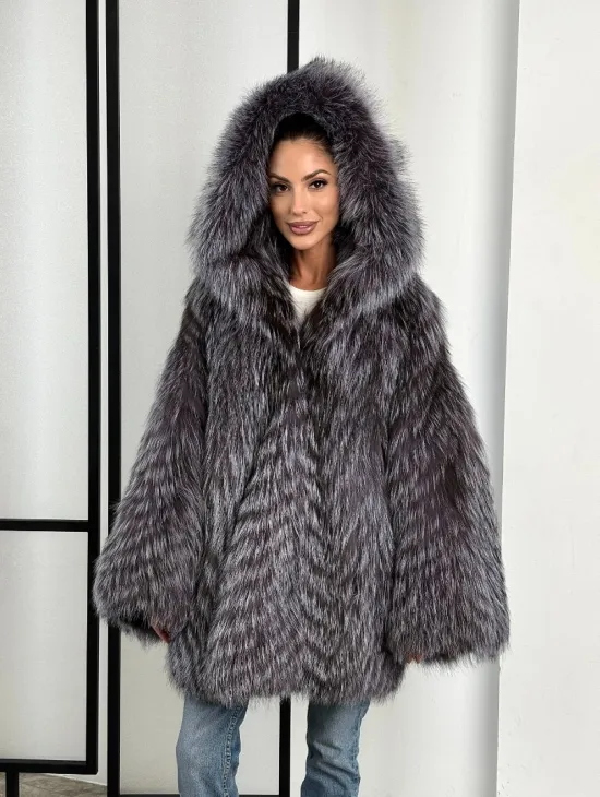 Шуба из меха чернобурки с капюшоном в росшив - летучая мышь