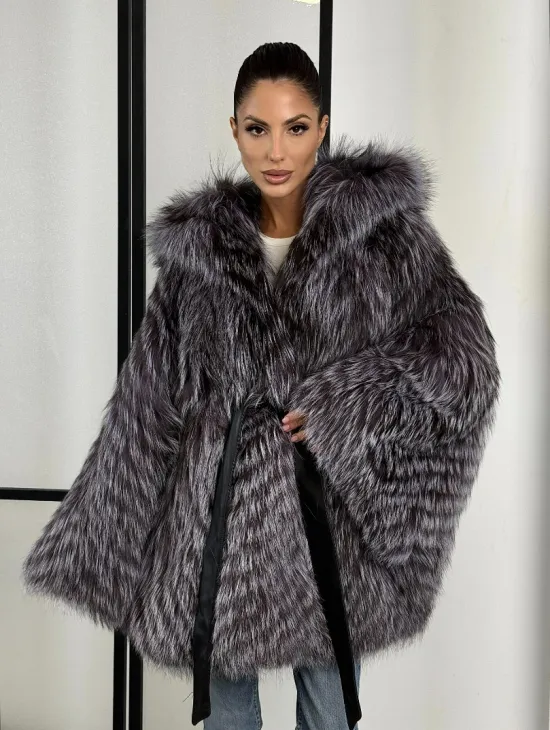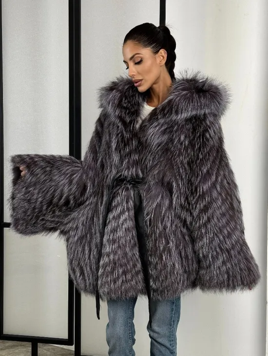 Полушубок с капюшоном из натурального меха лисы чернобурки с поясом
