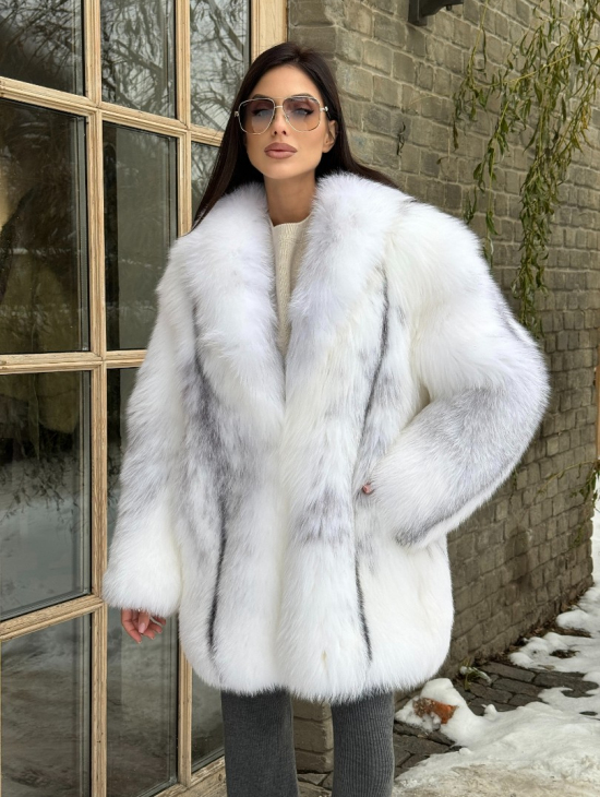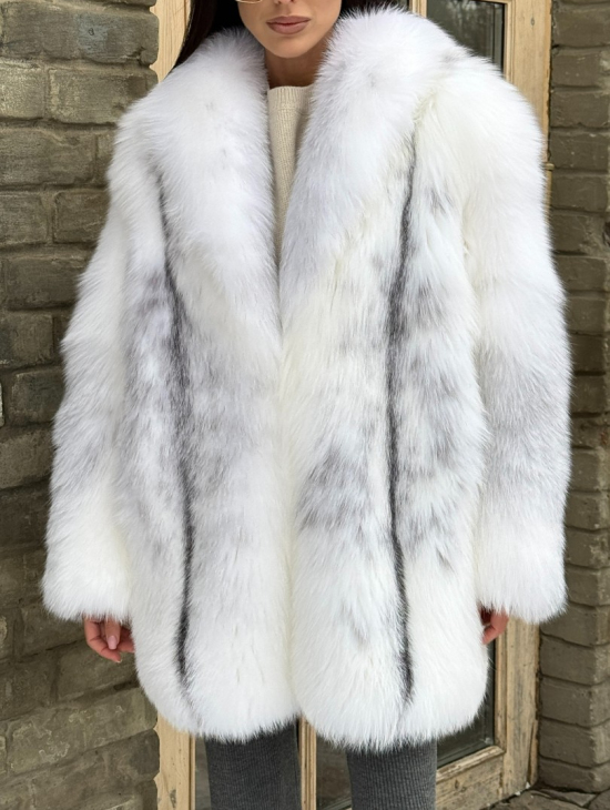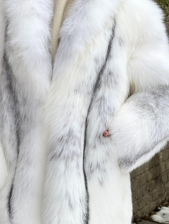 Шуба из меха белой крестовой лисы с воротником шаль, цельные пластины